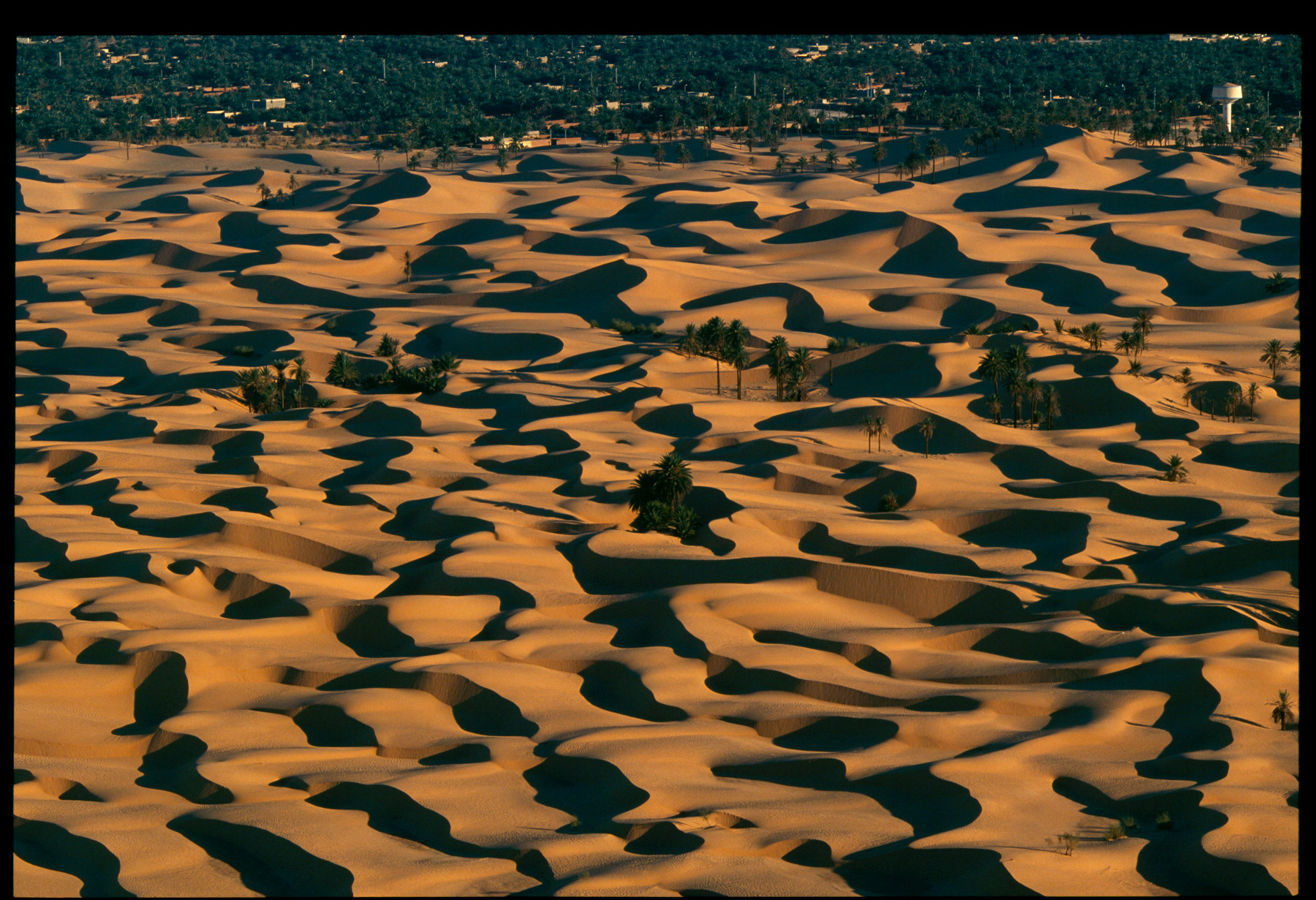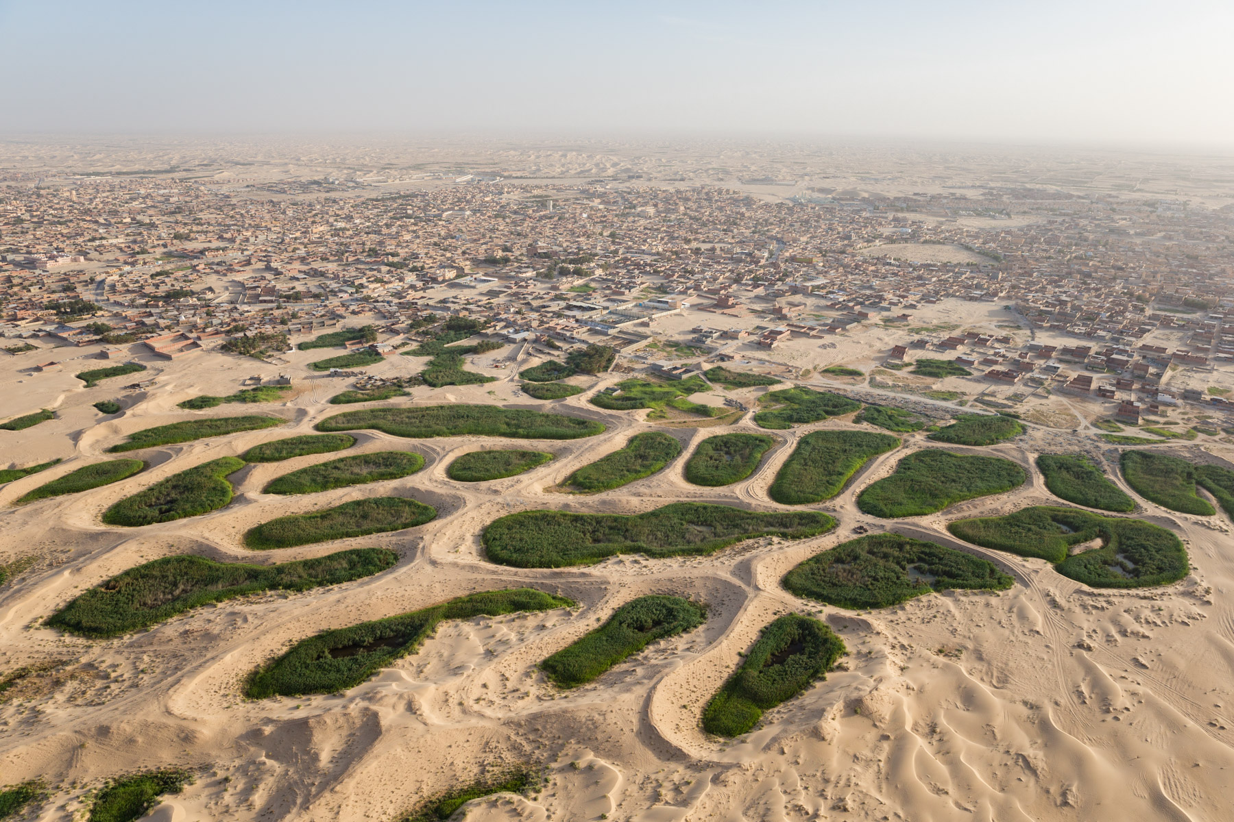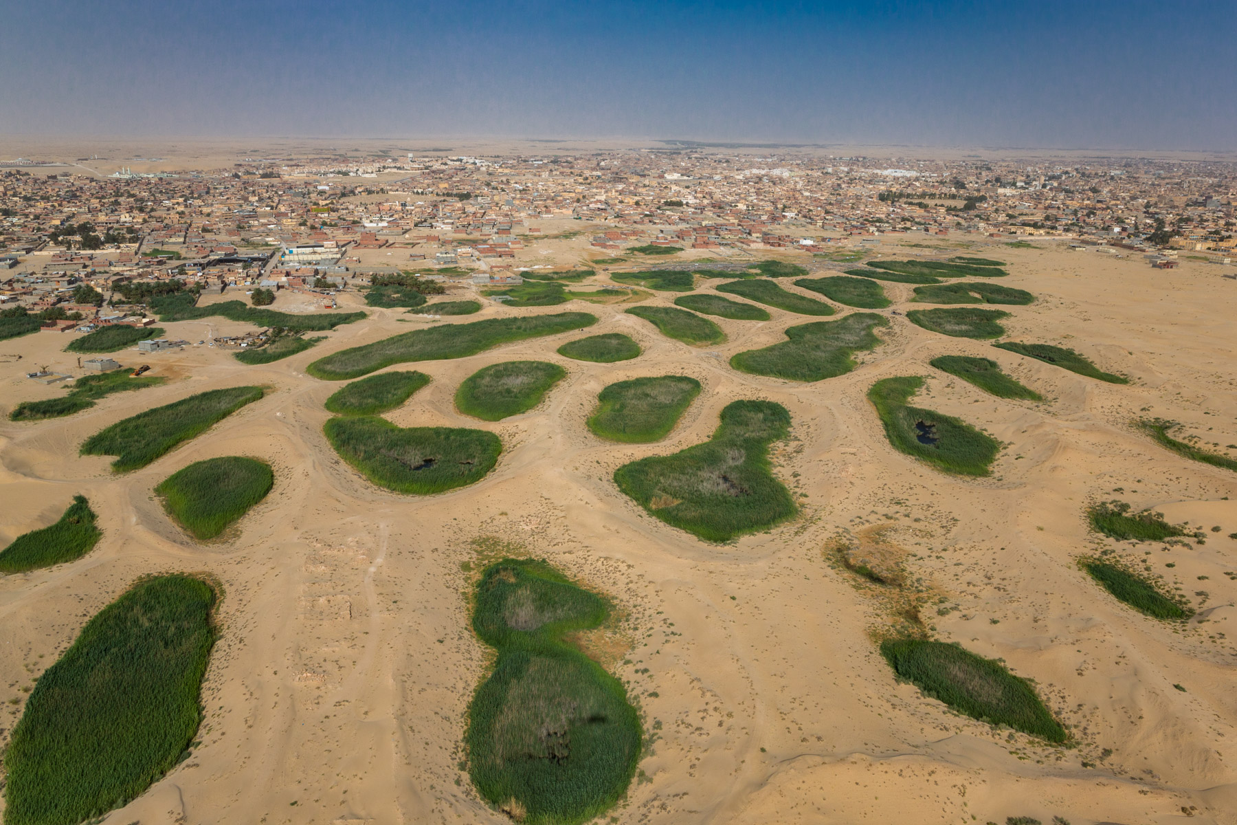 El Oued : ville et végétation au creux des dunes (pollution nappe superficielle), Wilaya d'El Oued, Algérie ( 33°21'8.51"N - 6°52'55.51"E)