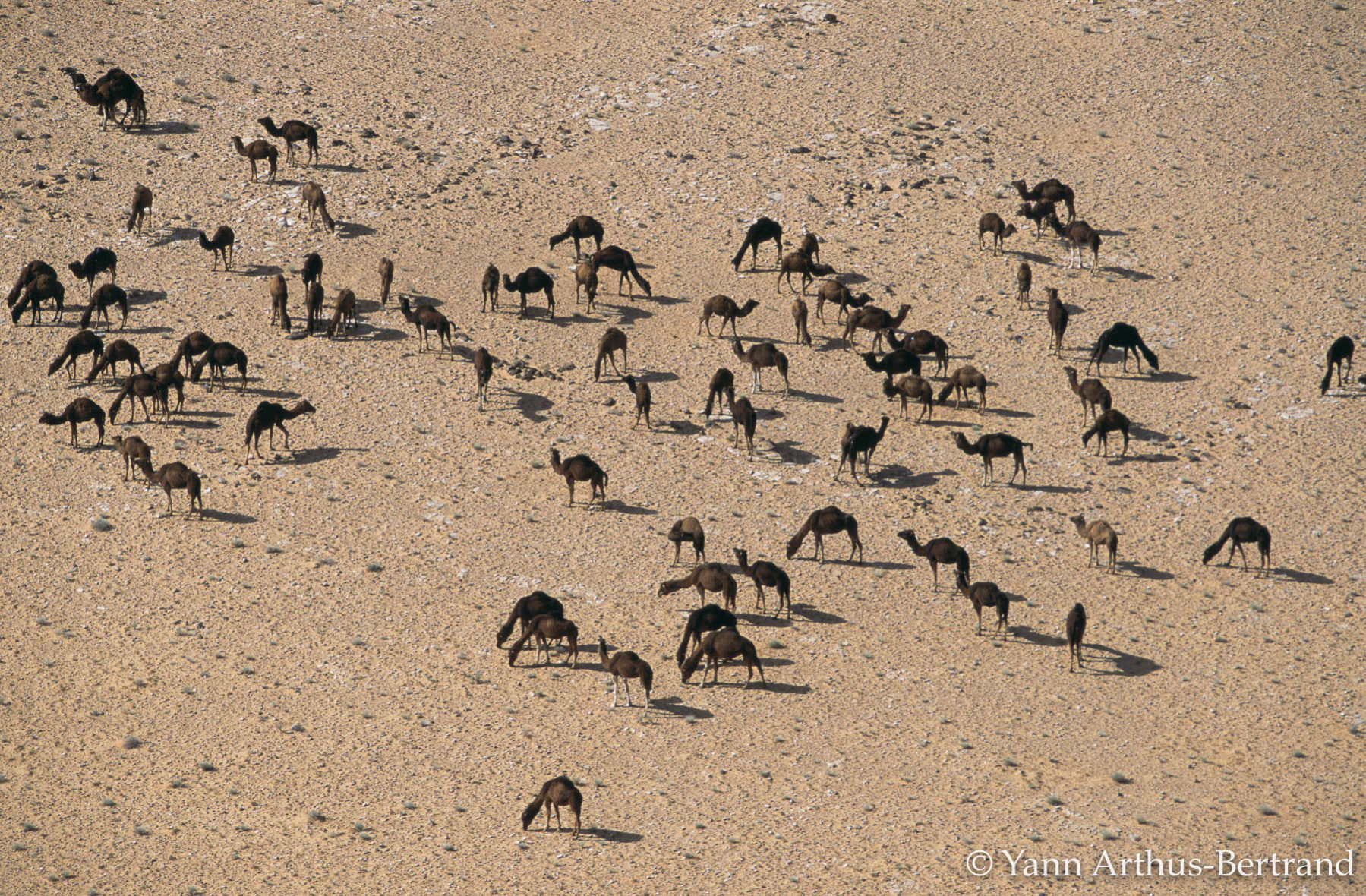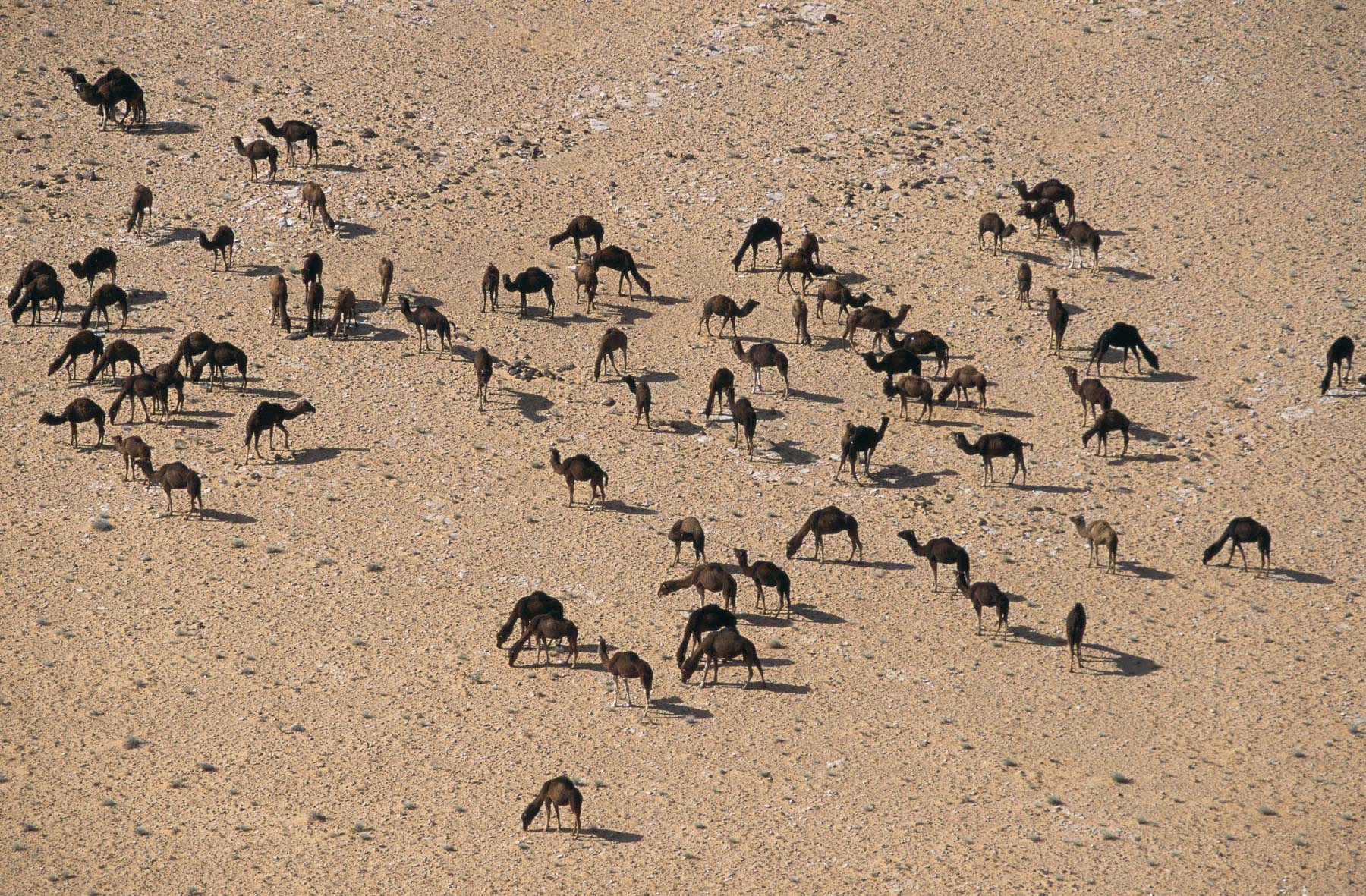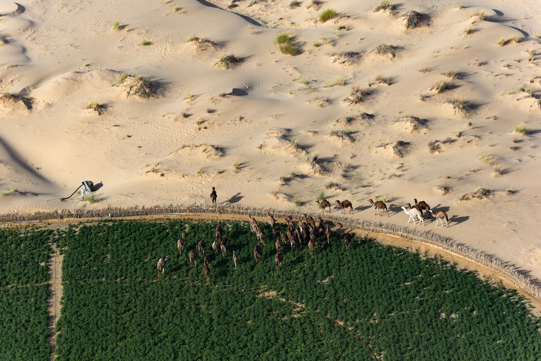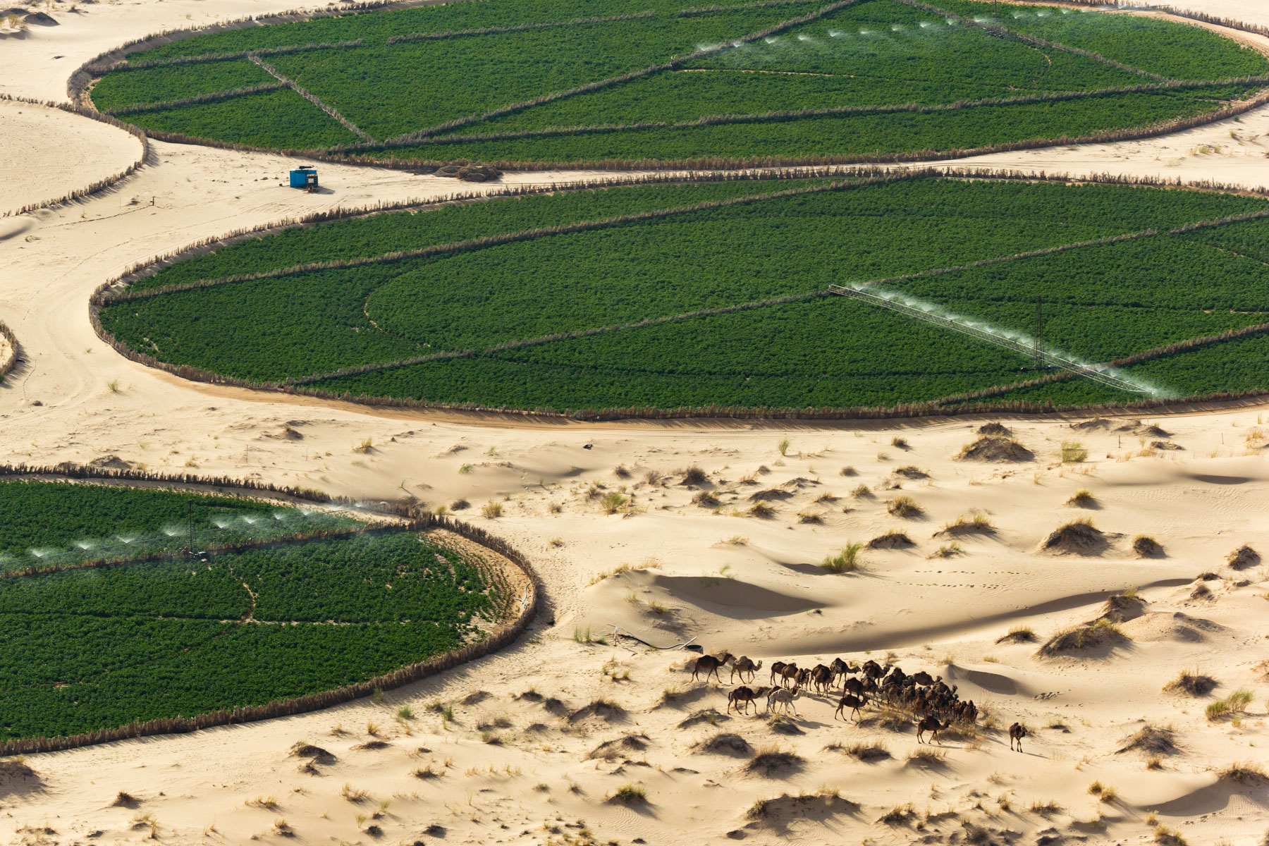 Troupeau de dromadaires et irrigations circulaires près de El Oued, région du Souf, Wilaya d'El Oued, Algérie (33° 9'52.38"N - 6°53'34.66"E)