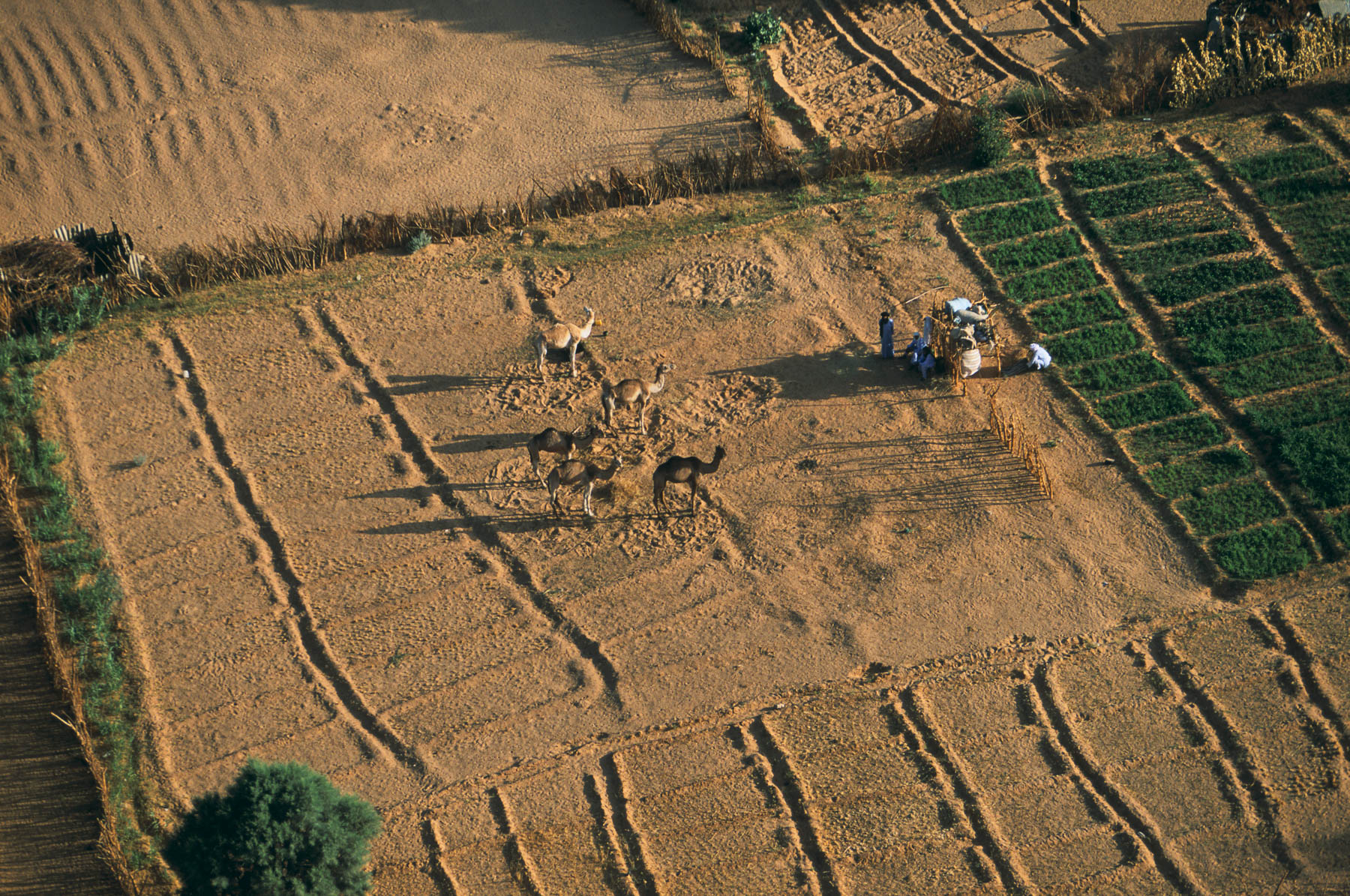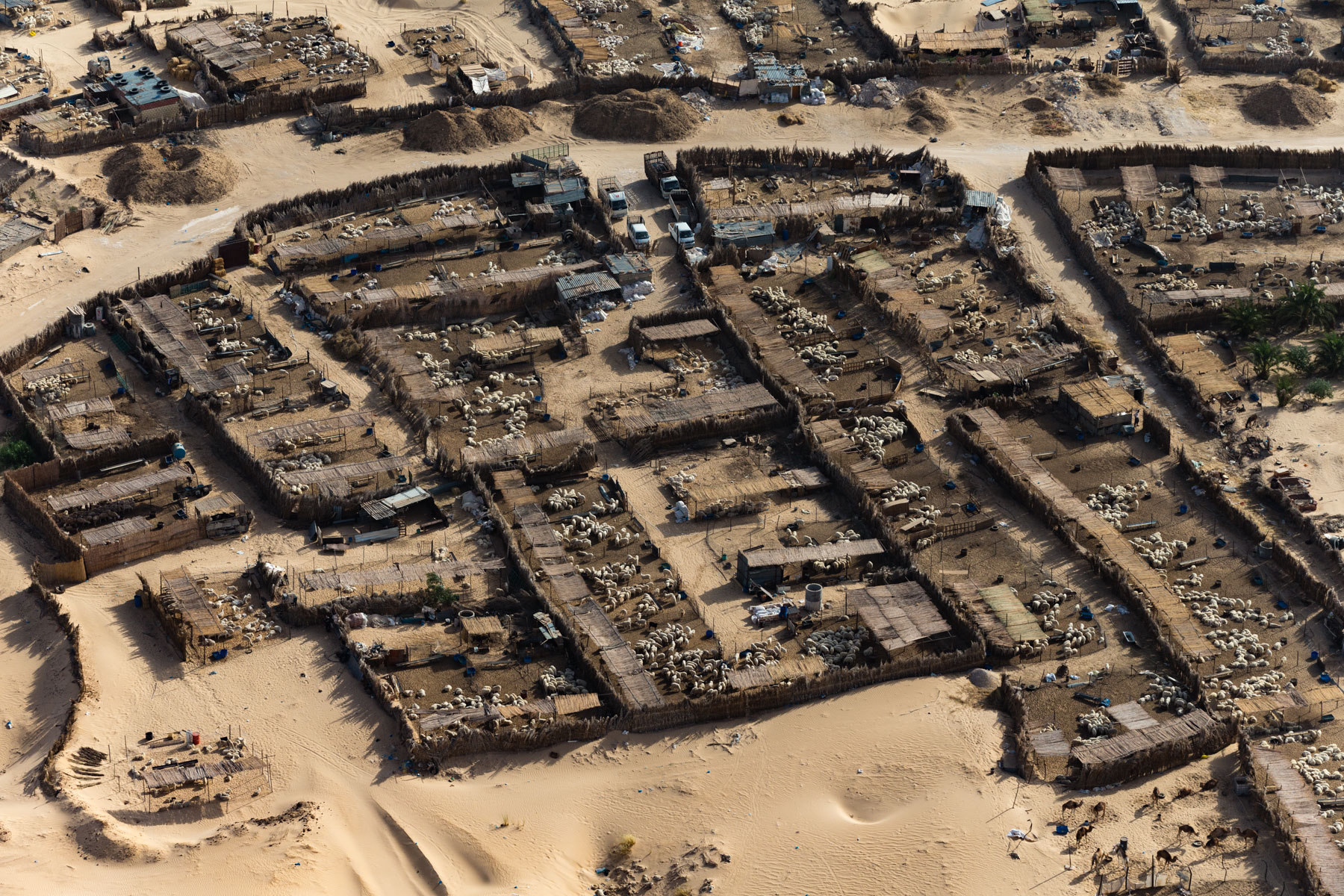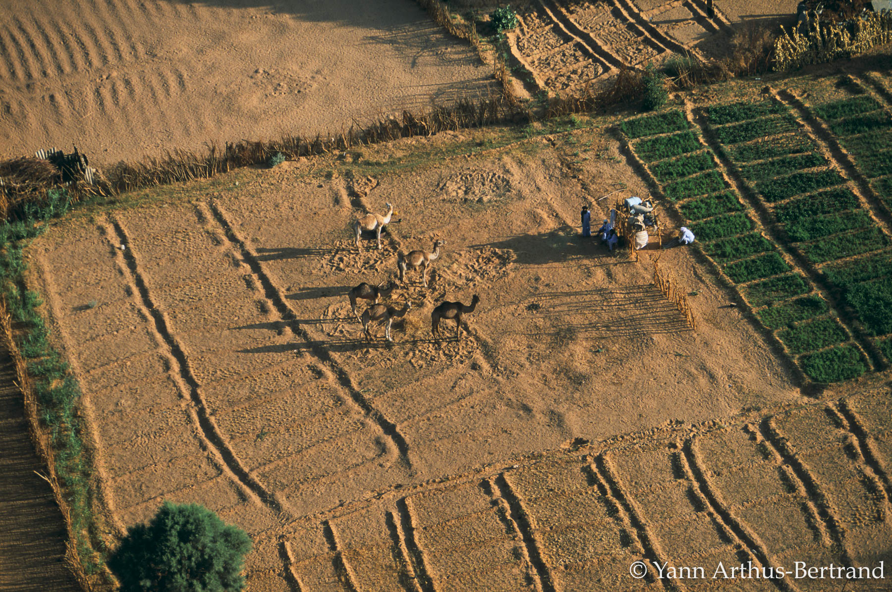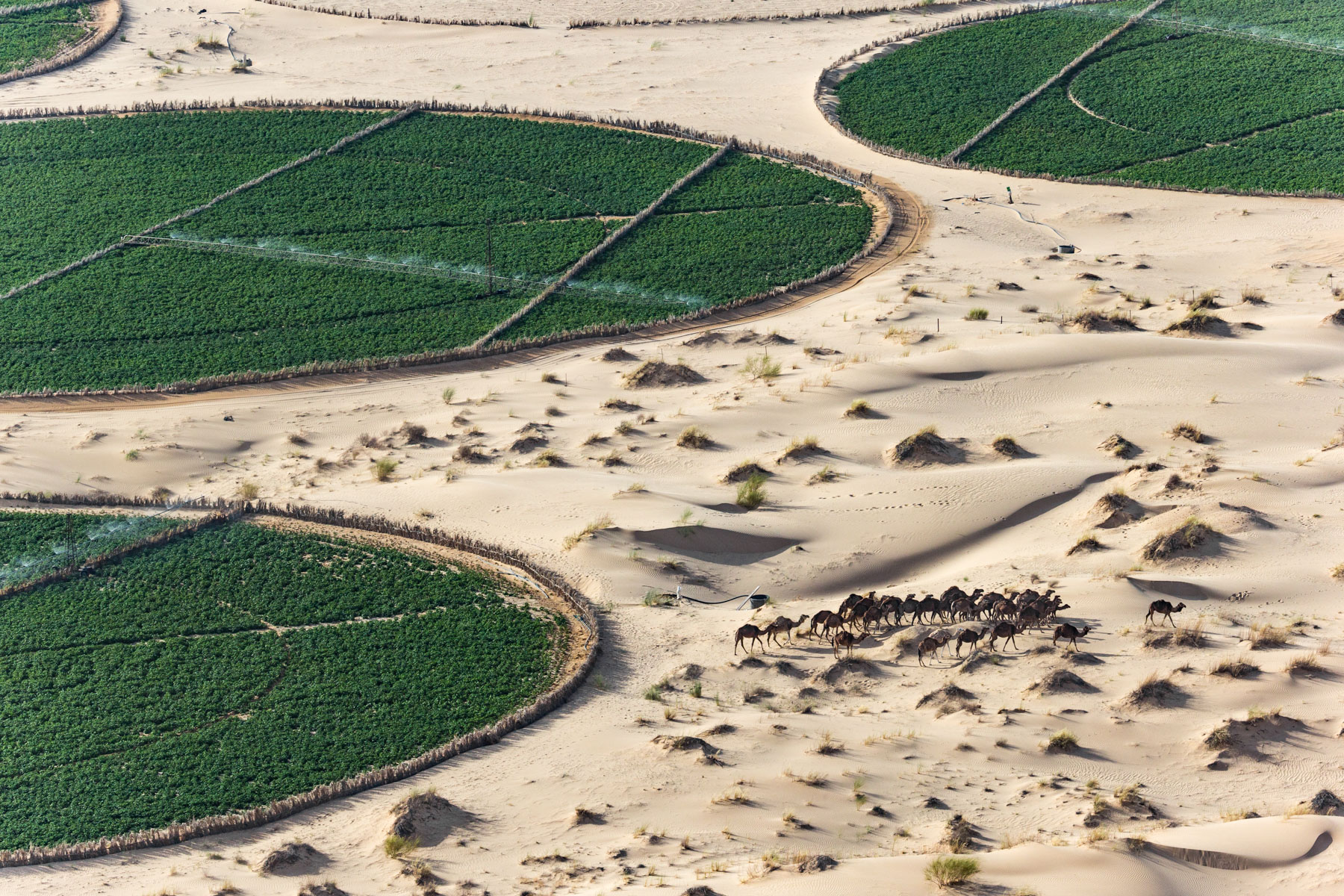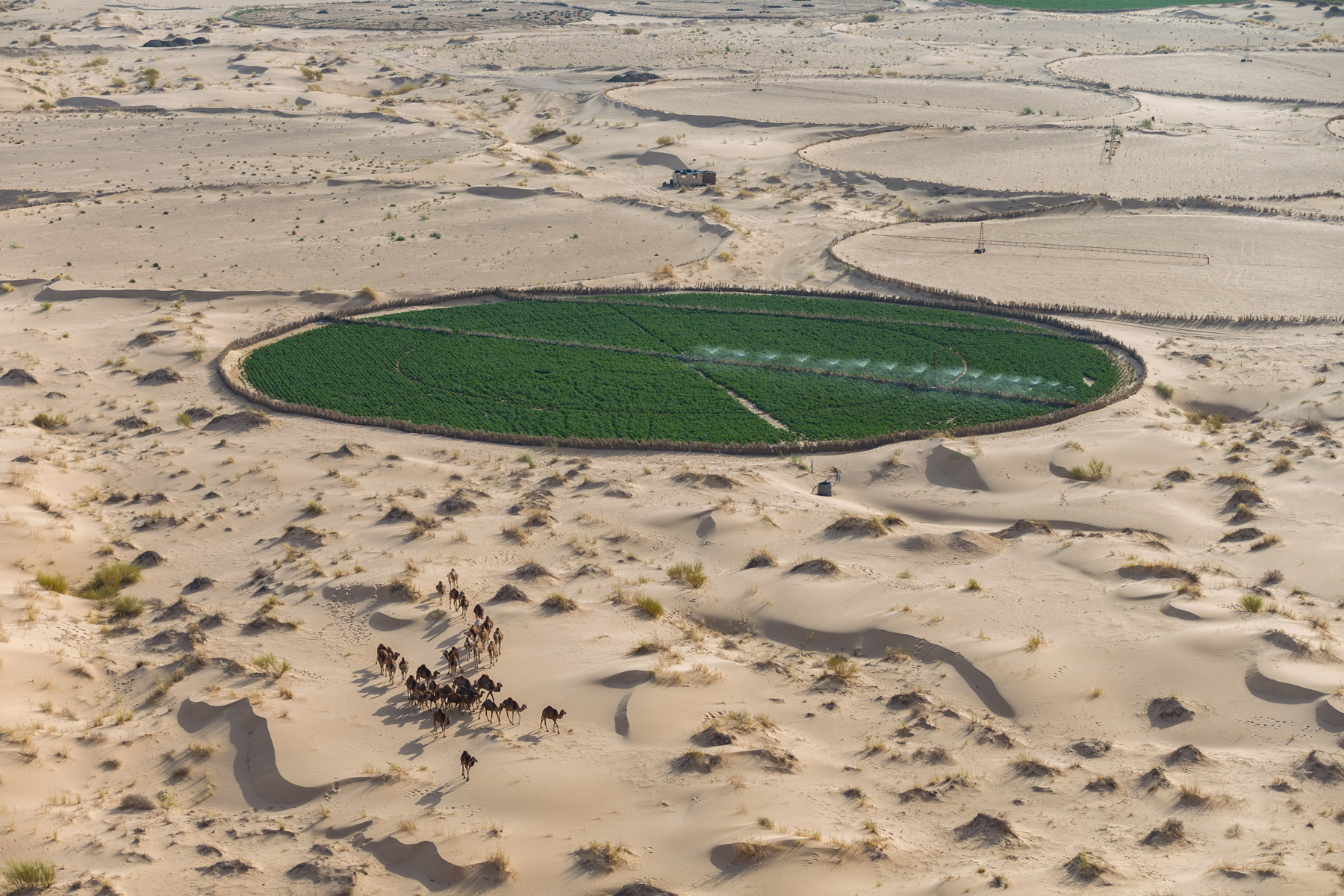 Troupeau de dromadaires et irrigations circulaires près de El Oued, région du Souf, Wilaya d'El Oued, Algérie (33° 9'52.38"N - 6°53'34.66"E)