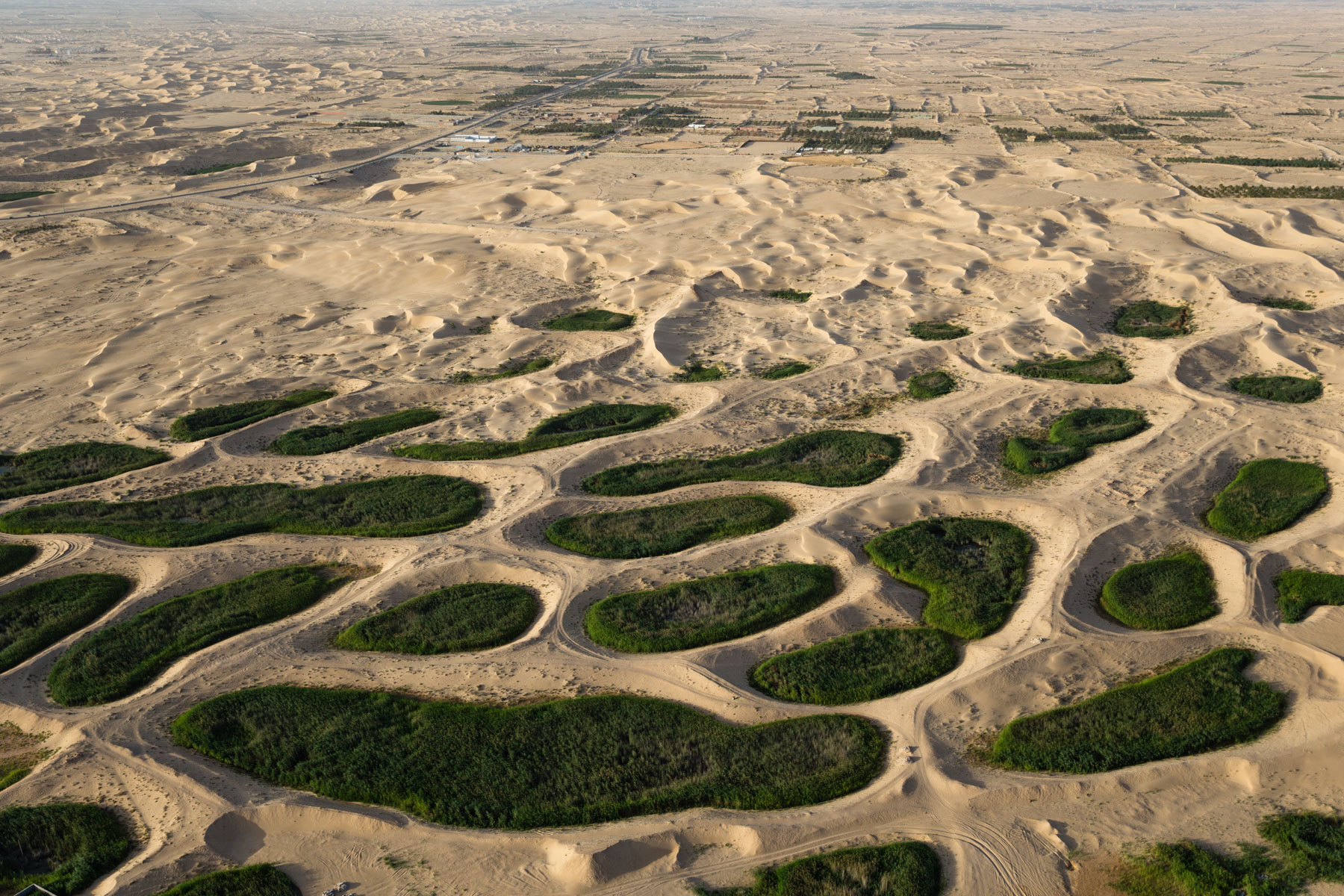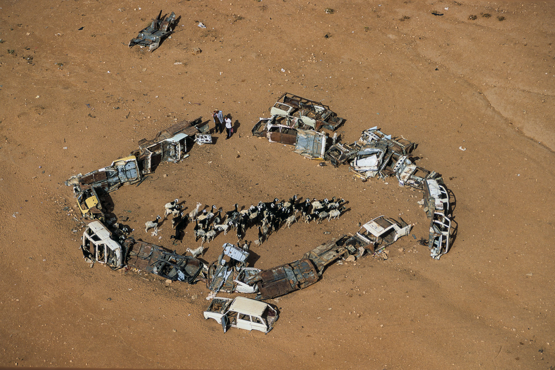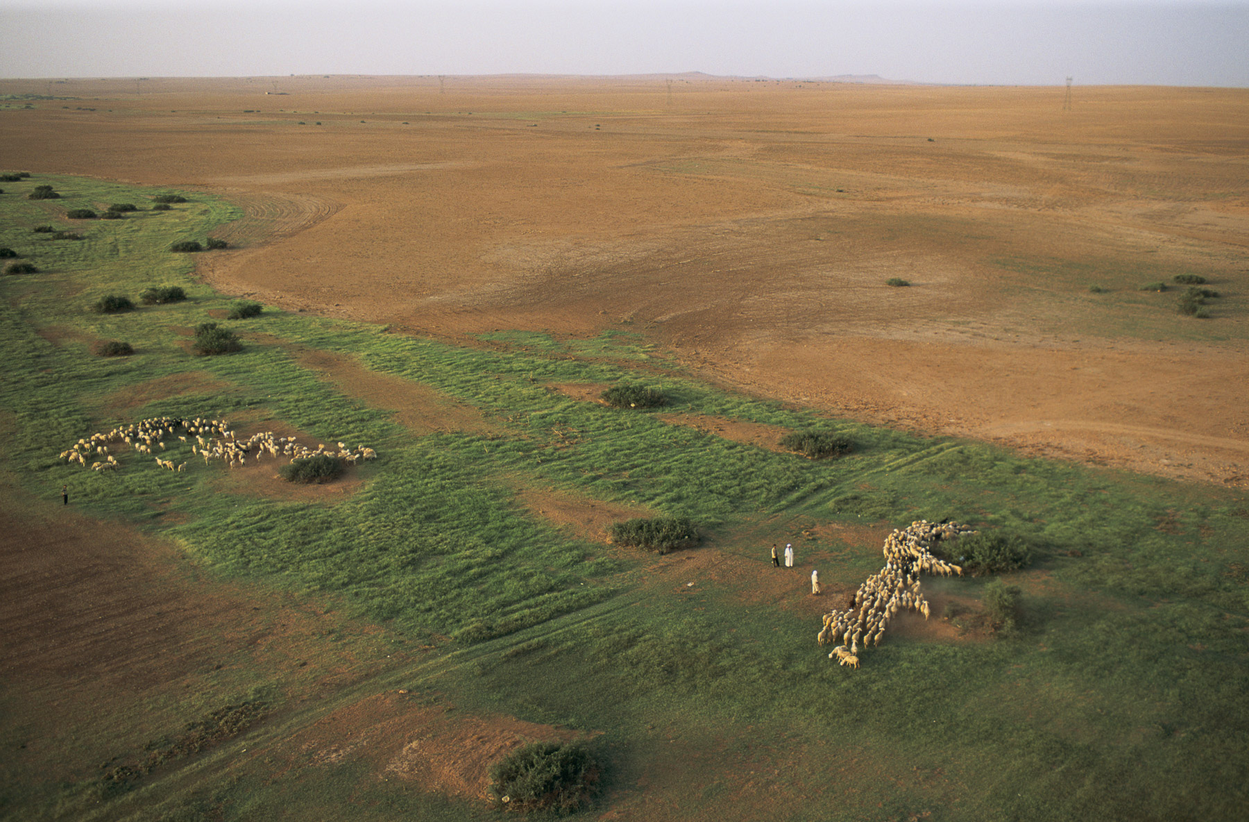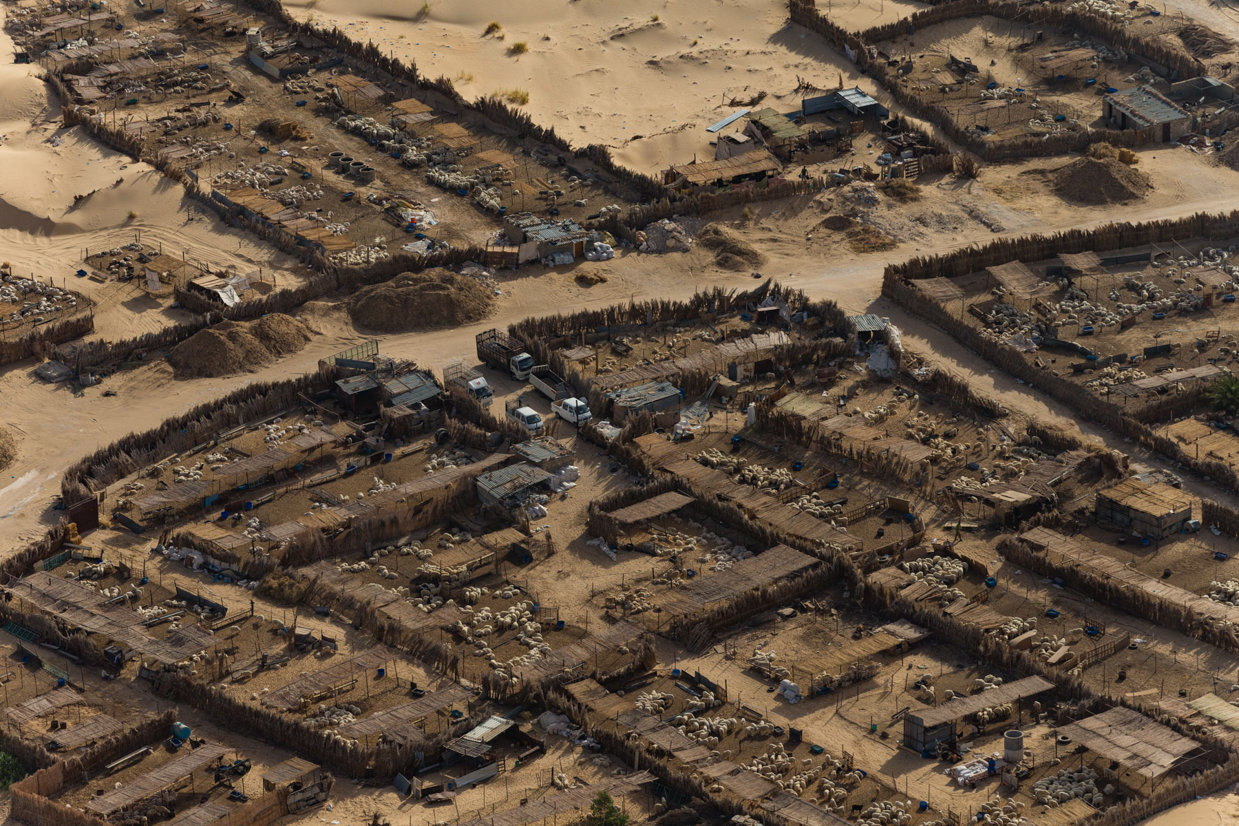 Troupeau de dromadaires et irrigations circulaires près de El Oued, région du Souf, Wilaya d'El Oued, Algérie (33° 9'52.38"N - 6°53'34.66"E)