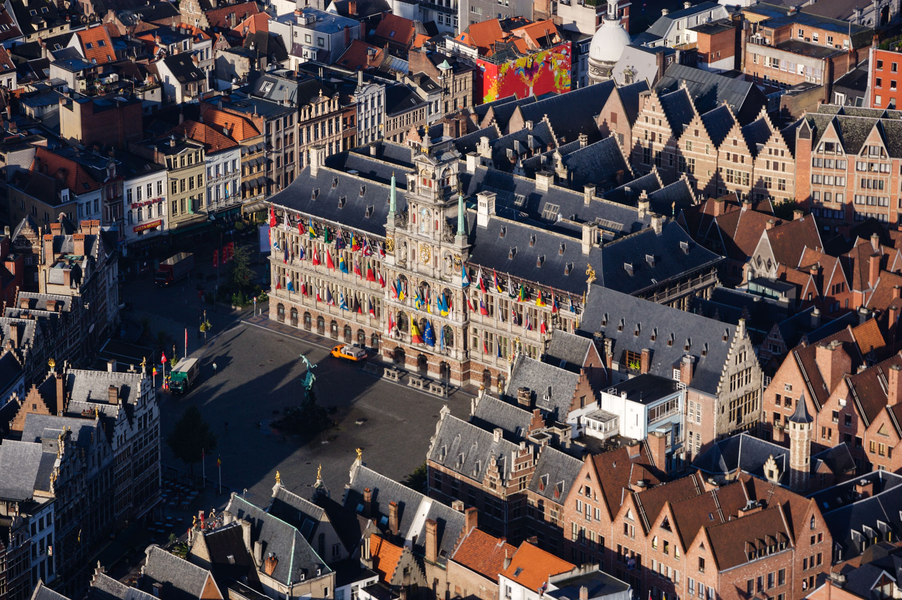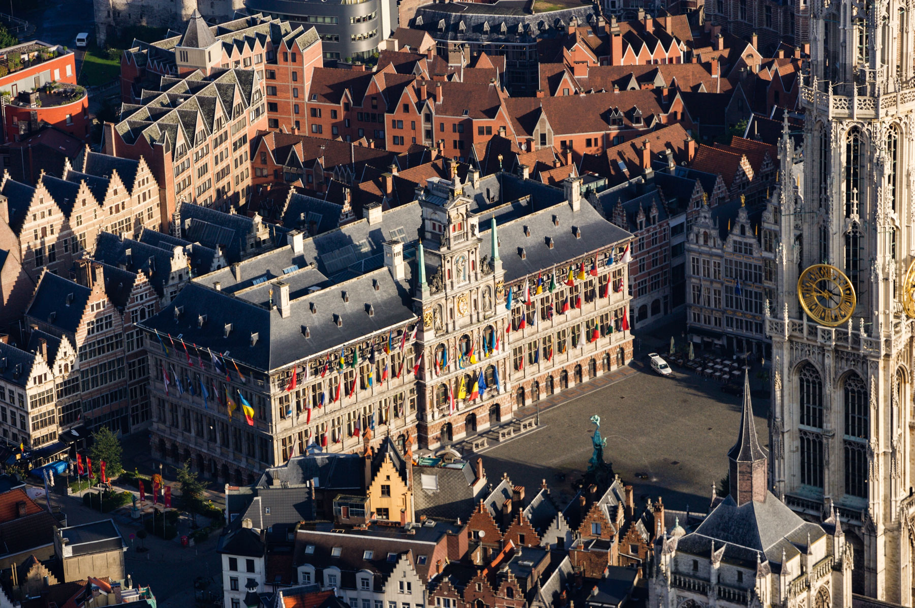 Antwerp - The Cathedral and the Town hall at the Main Square - Belgium (51°13’ N, 4°24’ E).
