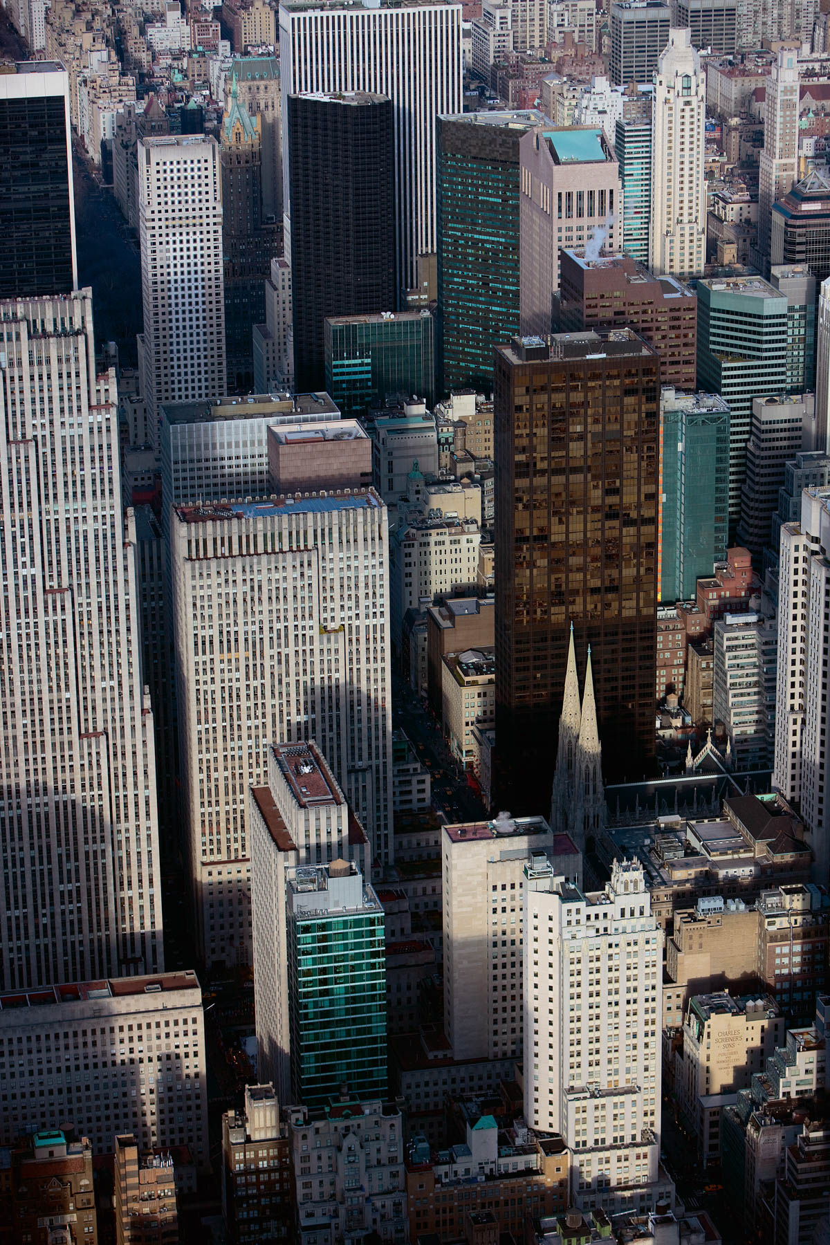 Midtown and Saint Patrick's Cathedral, from 47th Street and Fifth Avenue, Manhattan, New York, United States (40°45′31″N, 73°58′35″W).