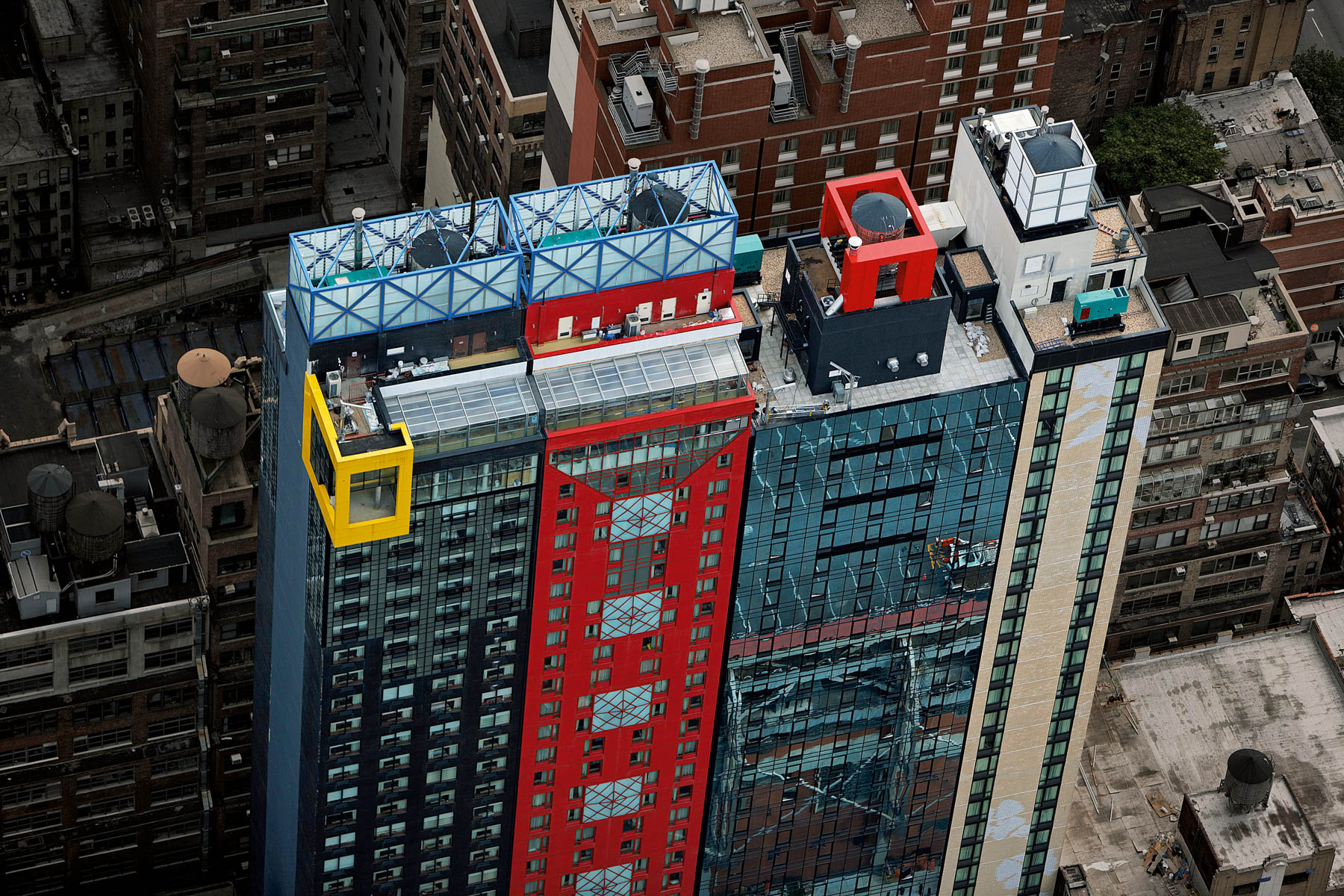 New Hotel Row: Sheraton, Marriott, Staybridge Suites and Distrikt Hotel, Times Square, Clinton, Manhattan, New York, United States (40°45’ N, 73°60’ W).