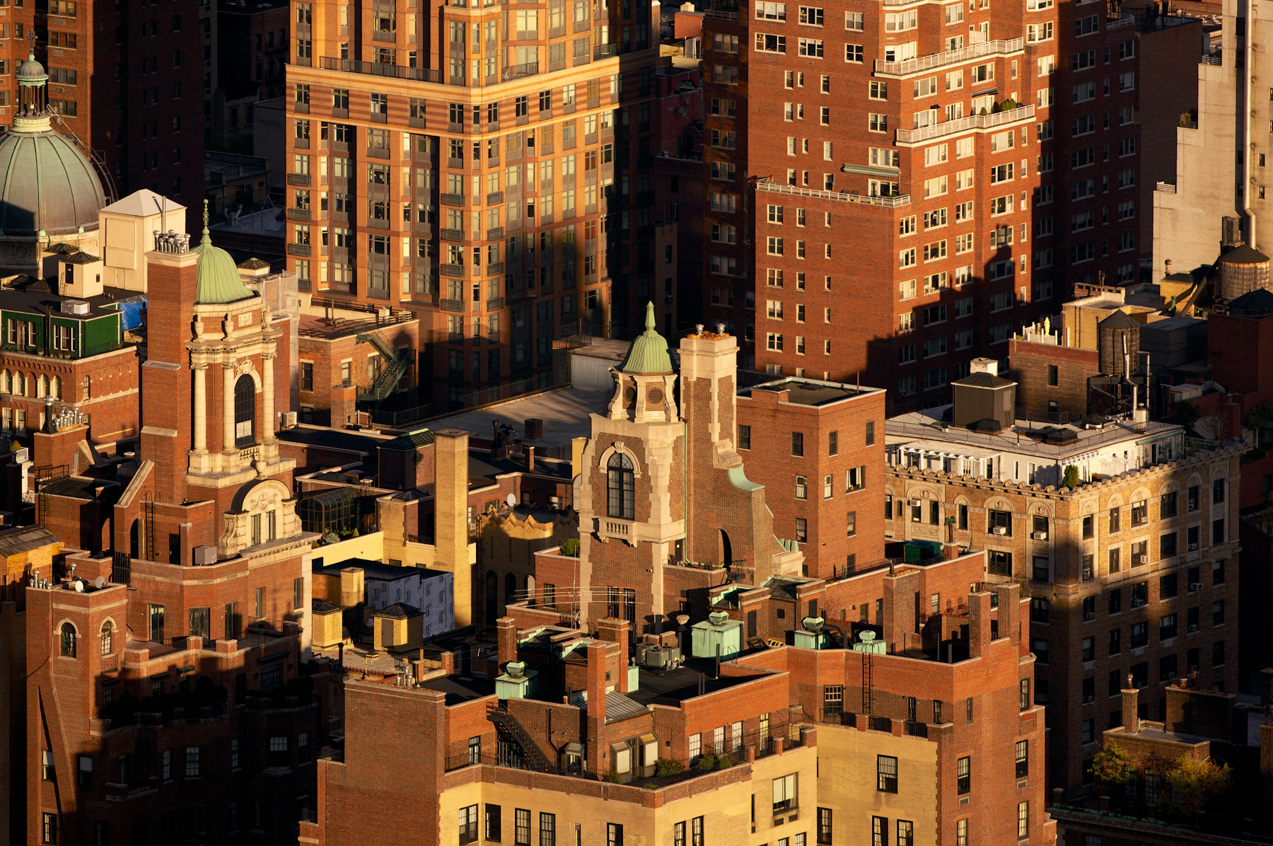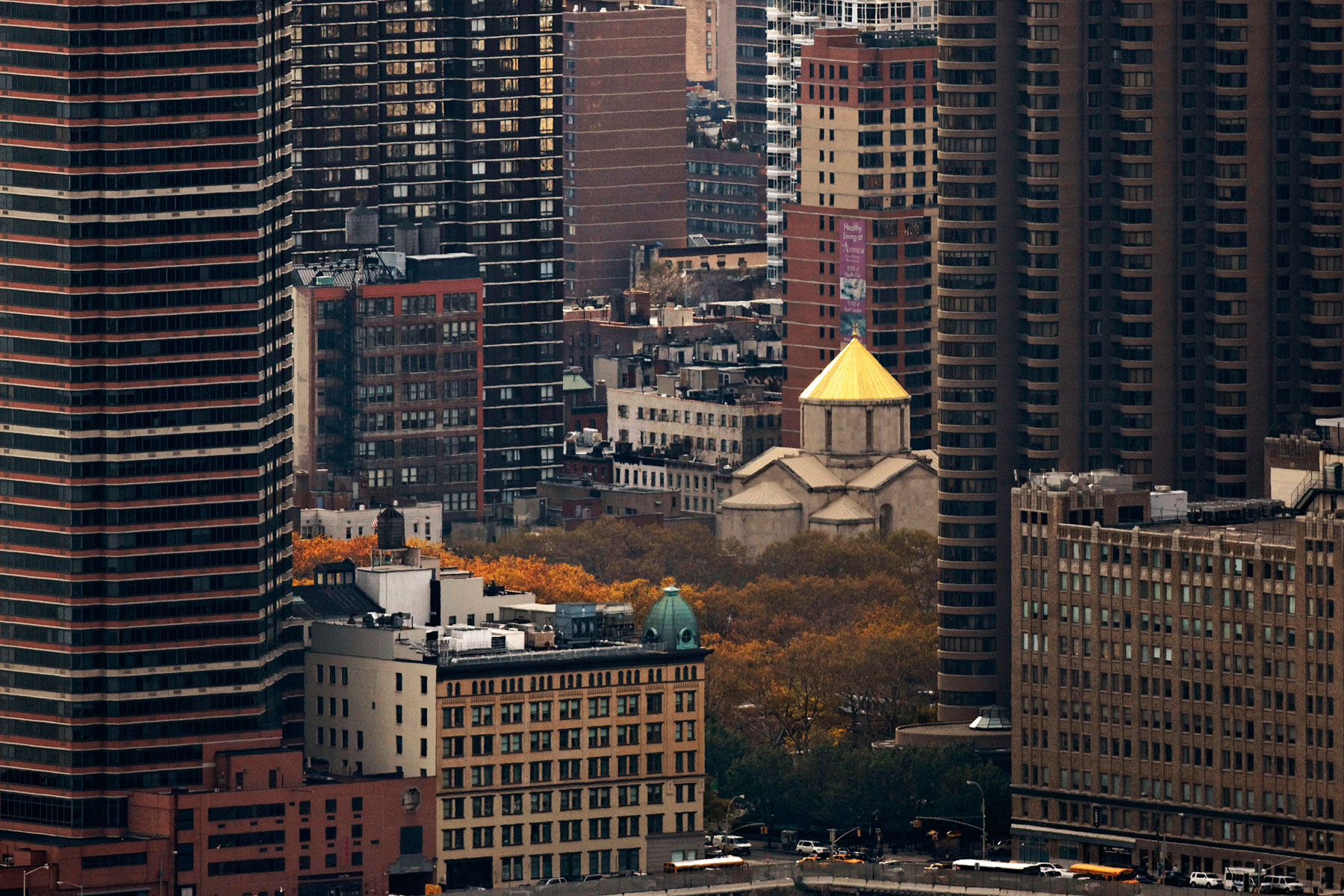 View from 30th to 40th Street East and Saint Vartan Cathedral, Kips Bay, Manhattan, New York, United States (40°45’ N, 73°59’ W).
