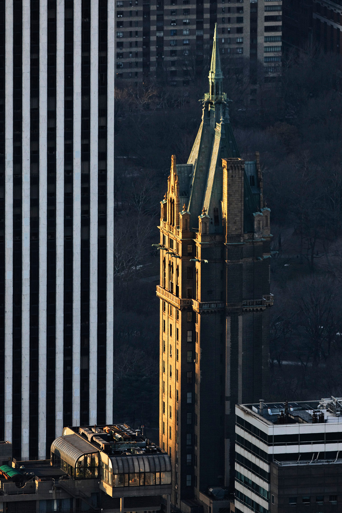 Top of San Remo Apartments and the Rowboat Lake in Central Park, Upper West Side, Manhattan, New York, United States (40°47′18.1″N, 73°58′2.66″W).