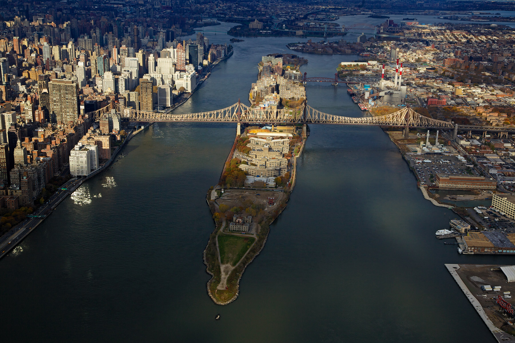 The Mayor Edward Koch Bridge or Queensboro Bridge and Roosevelt Island in the East River, between Manhattan and Queens, New York, United States (40°45’ N, 73°57’ W).