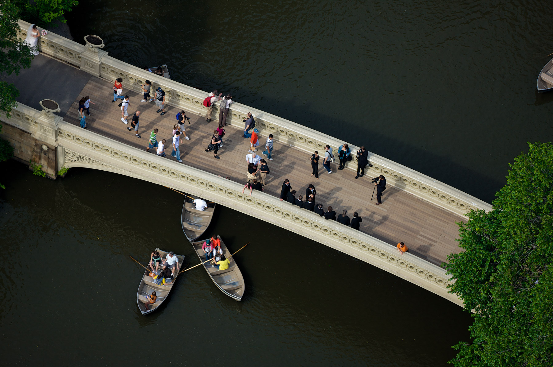 Bow Bridge and the Rowboat lake in Central Park, Manhattan, New York, United States (40°46′33″N, 73°58′18.6″W).