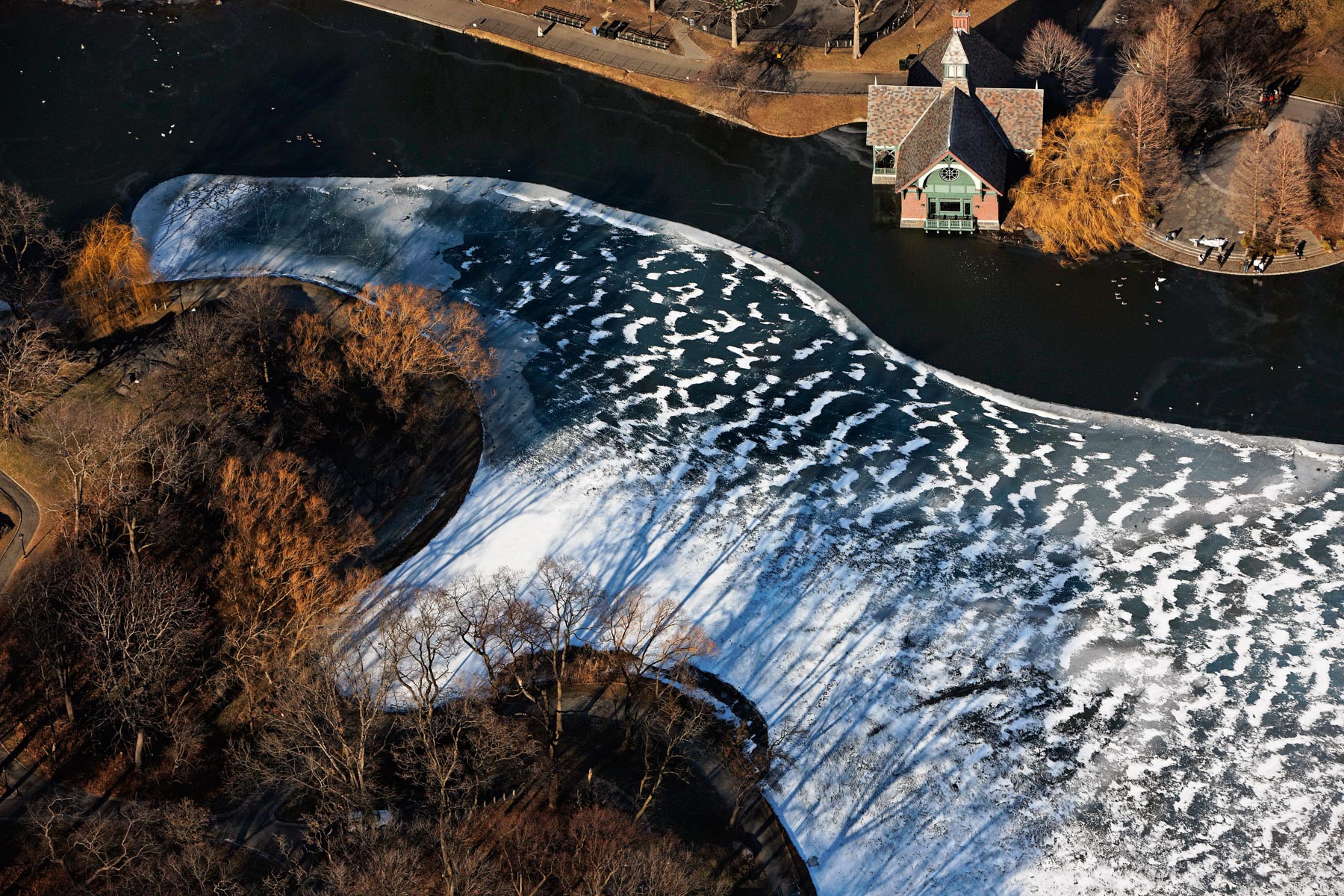 Harlem Meer and the Dana Discovery Center in winter, Central Park, Manhattan, New York, United States (40°47447.8"N, 73°57'6"W).
