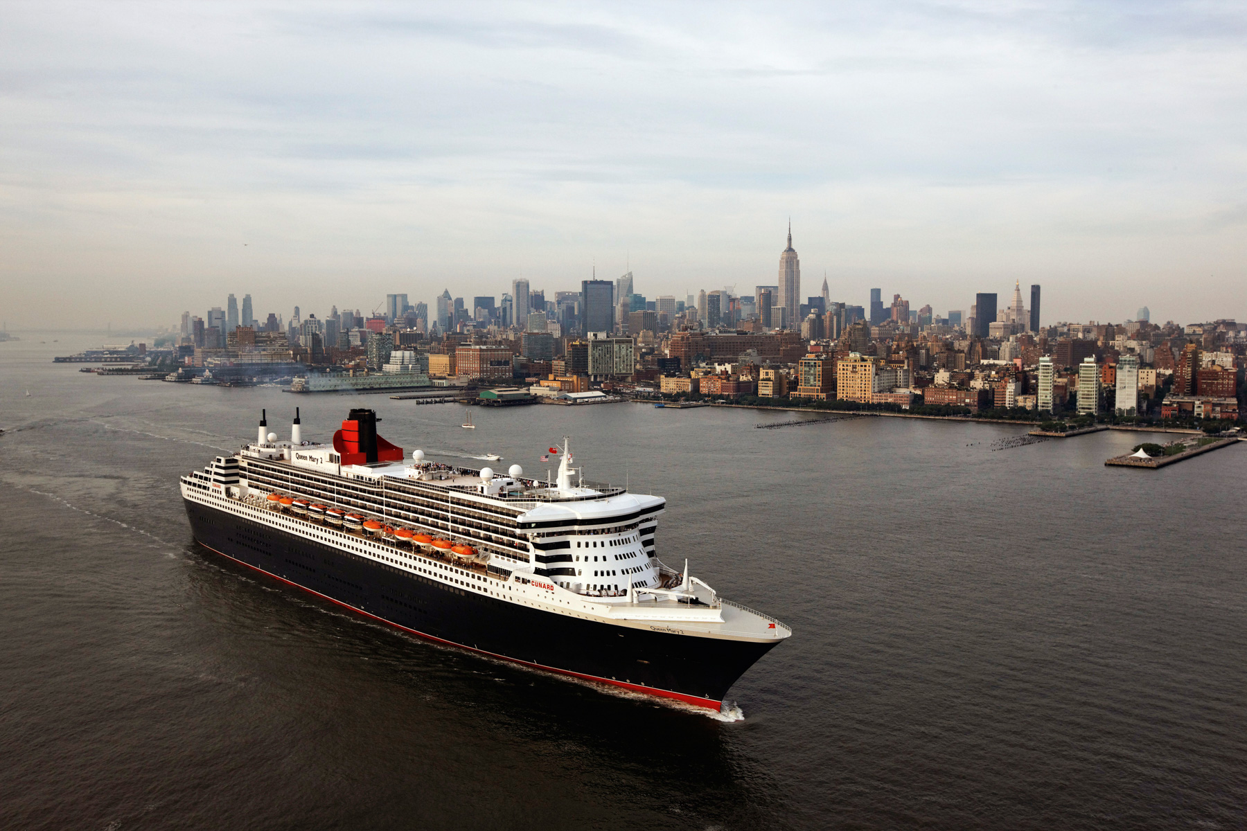 Queen Mary 2 and Manhattan, New York, United States (40°44'12.66" N, 74° 1'5.56" W)