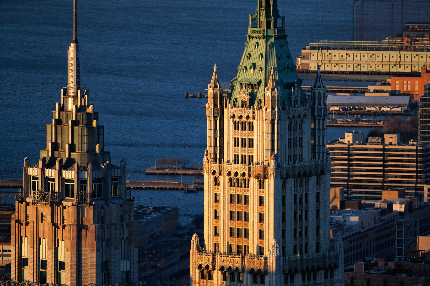 The American International Building or 70 Pine Street and the Woolworth building on the right, Financial District, Manhattan, New York, United States (40°42'22"N, 74°00'31"W).