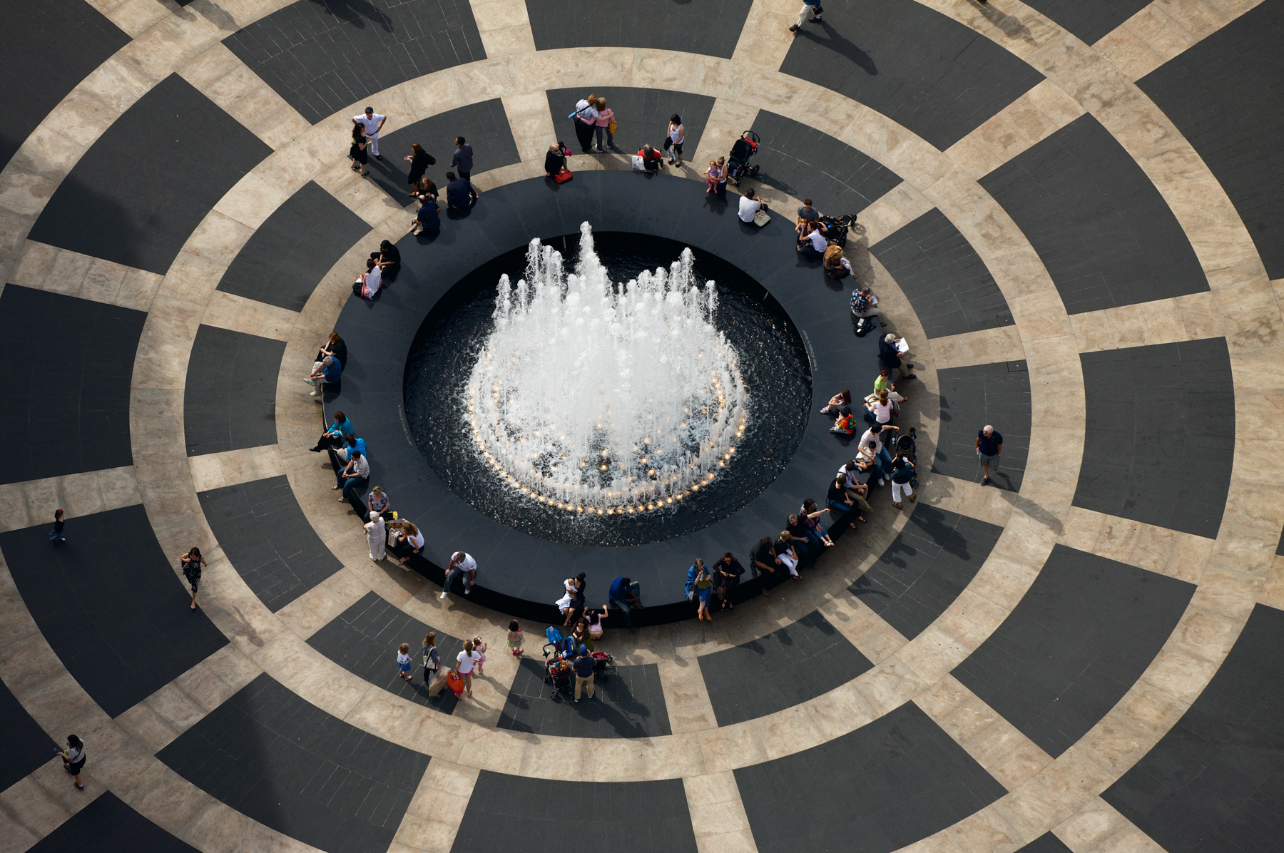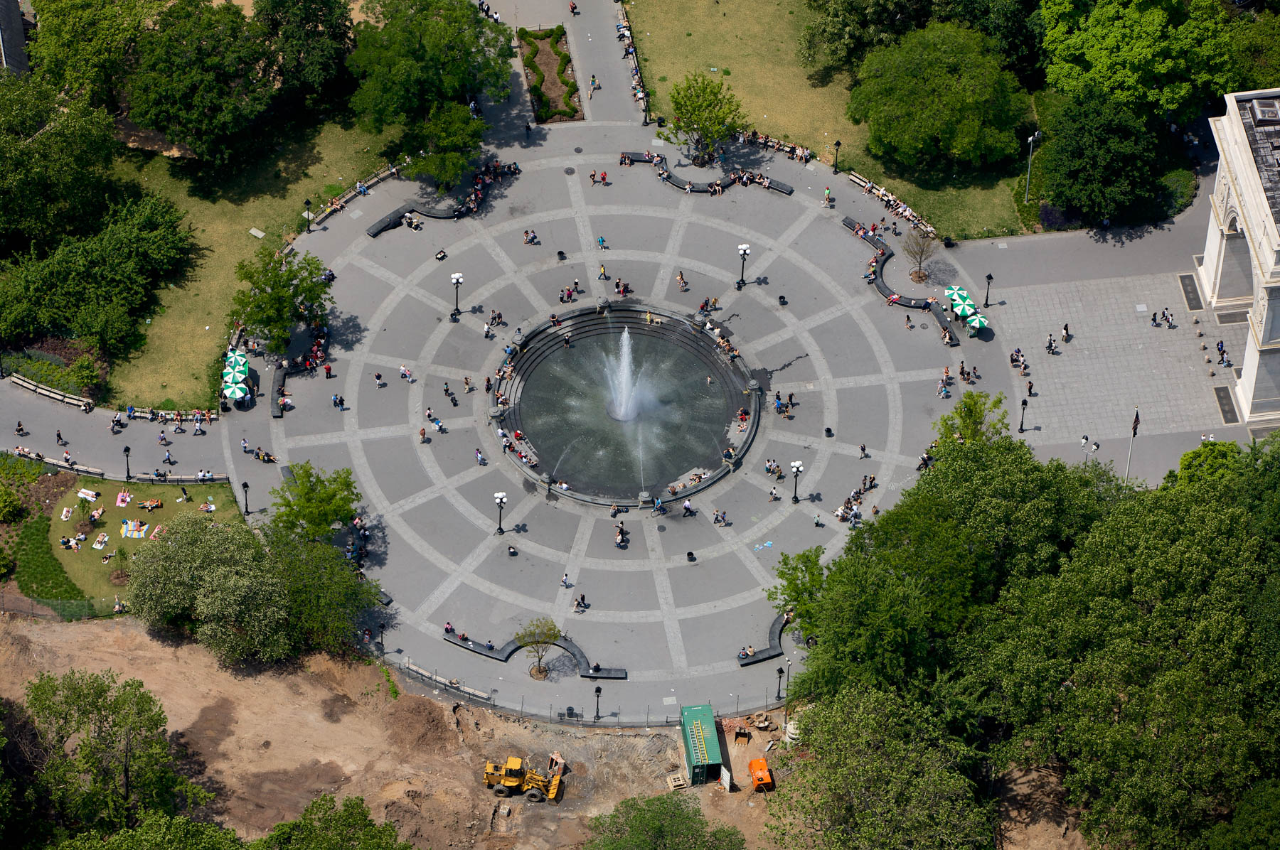 Washington Square Park Fountain, Greenwich Village, Manhattan, New York, United States (40°43′51″N, 73°59′51″W).