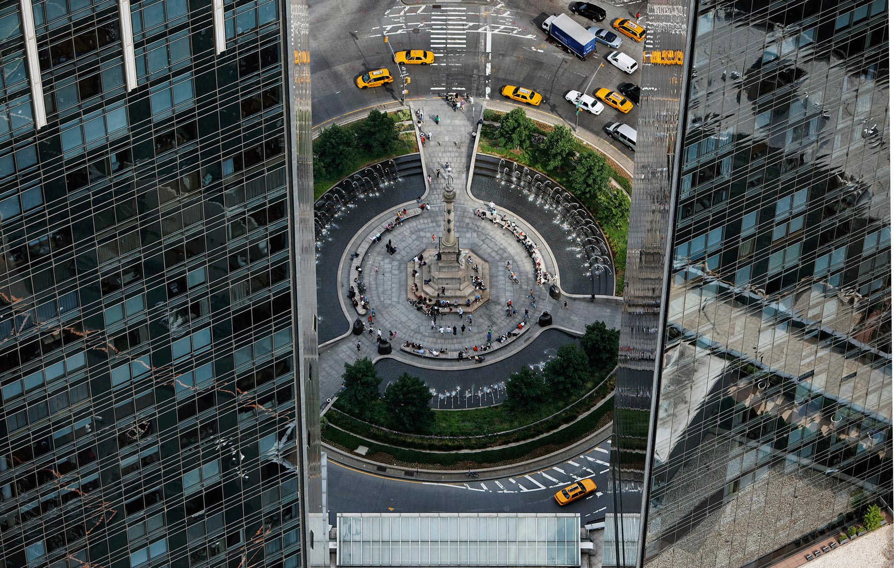 Time Warner Center Towers and the Columbus Circle fountain, Midtown, Manhattan, New York, United States (40°46'07"N, 73°58'58"W).