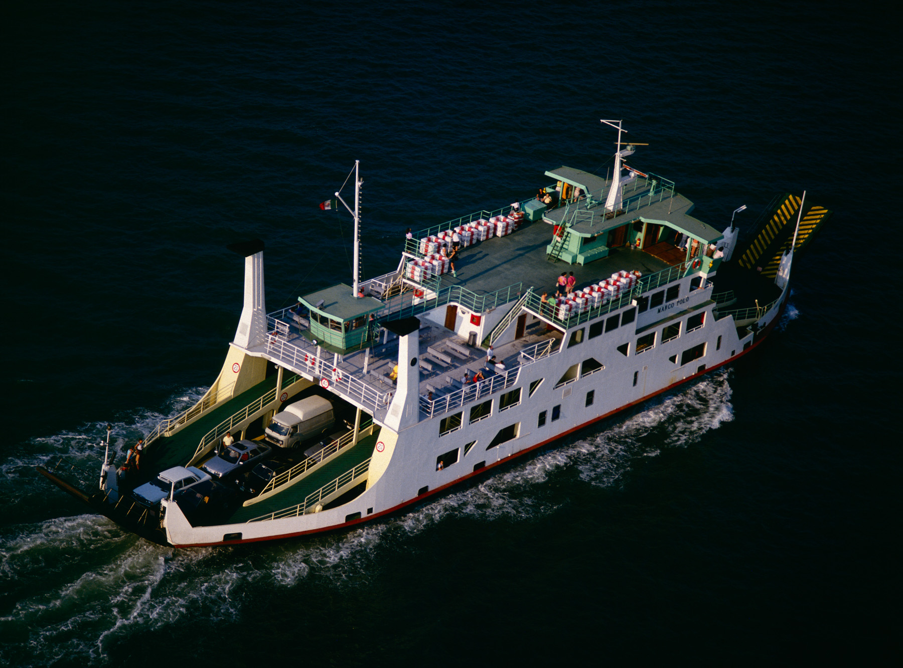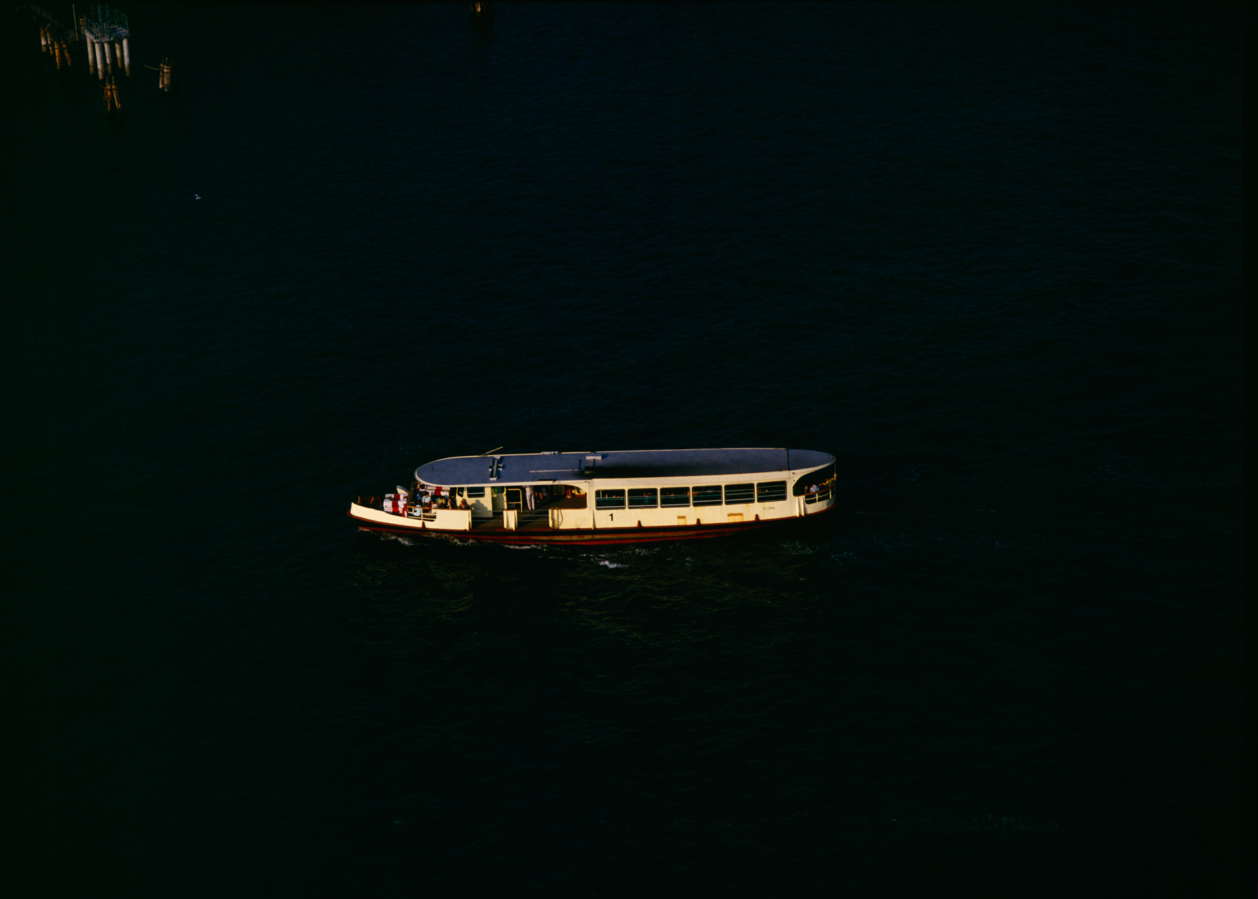 Venise : ferry devant la ville et l'île San Giorgio Maggiore au premier plan, province de Venise, Vénétie, Italie (45°26'21.32"N-12°19'43.43"E)