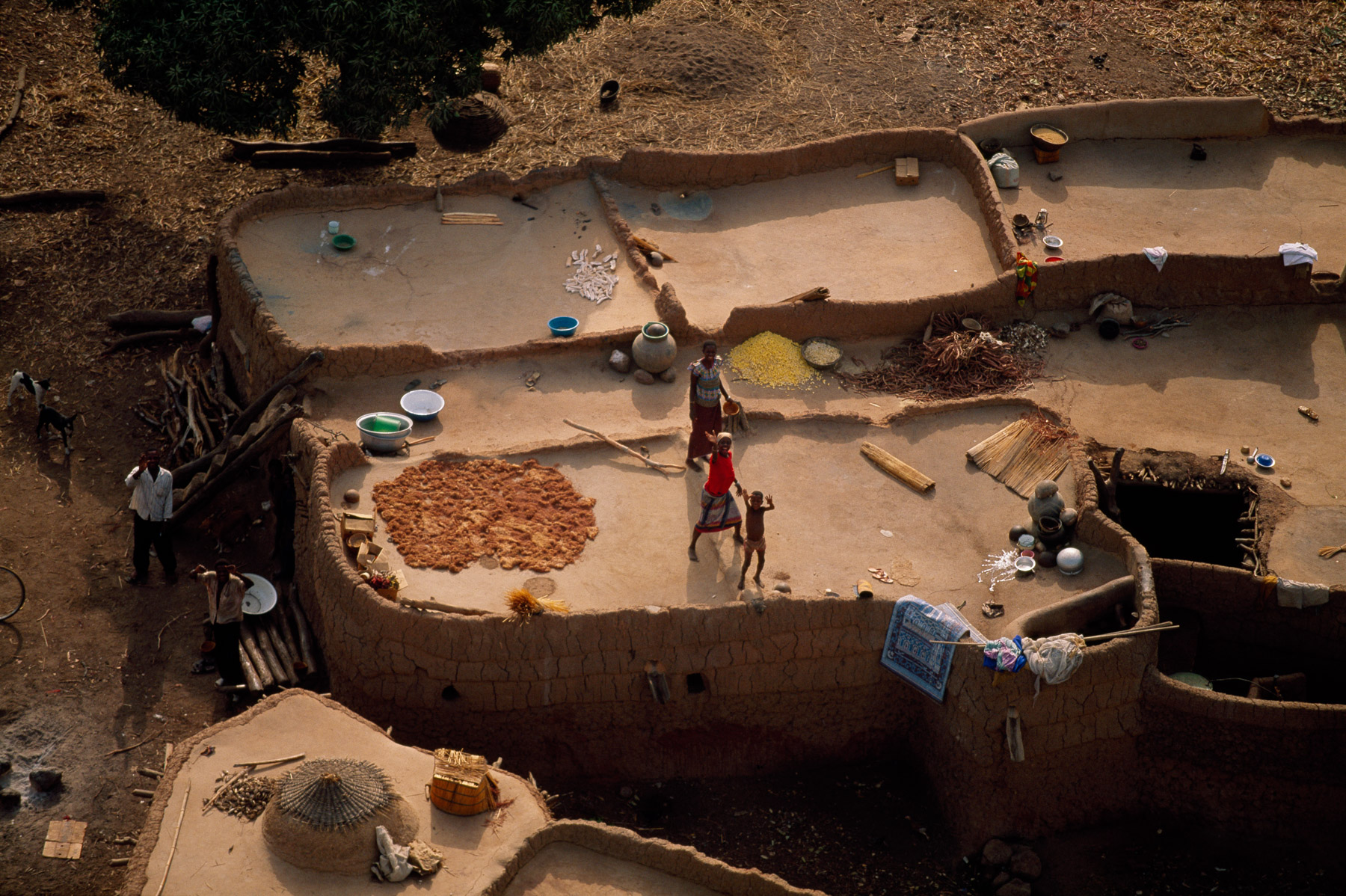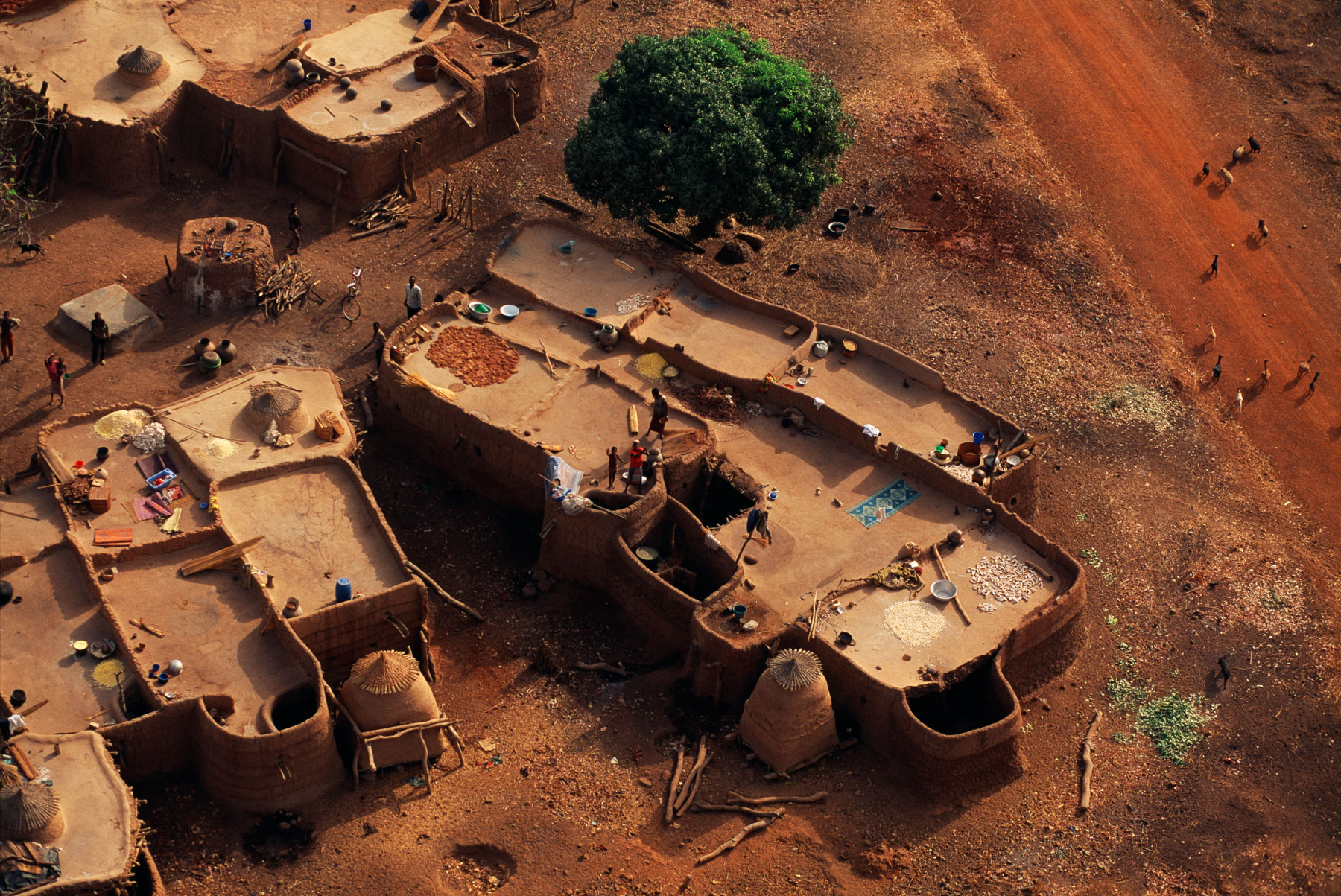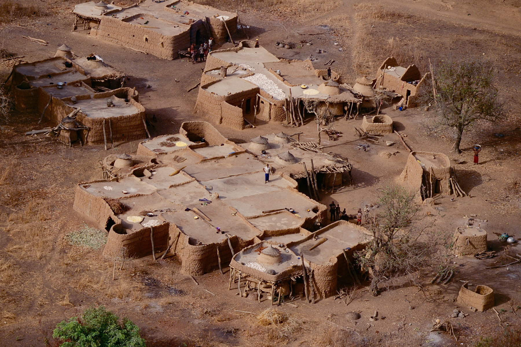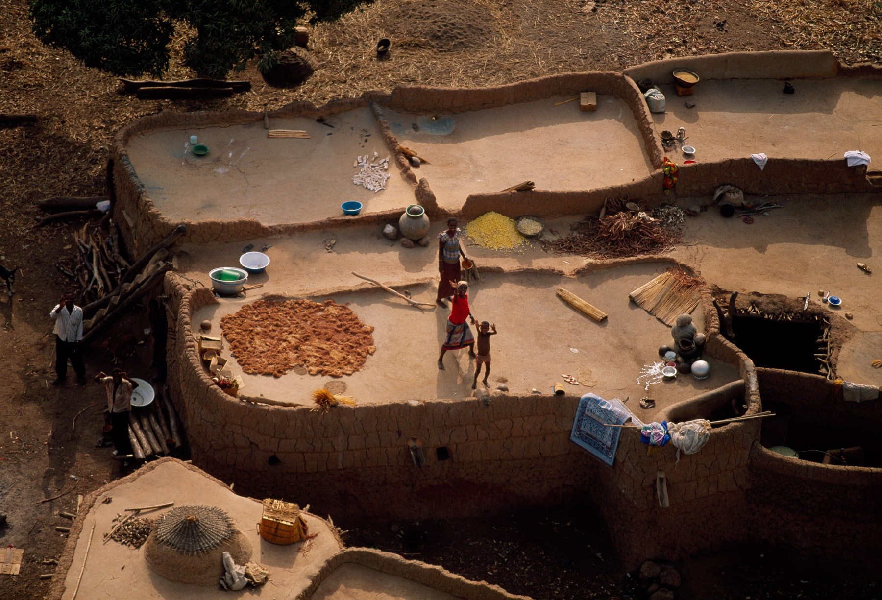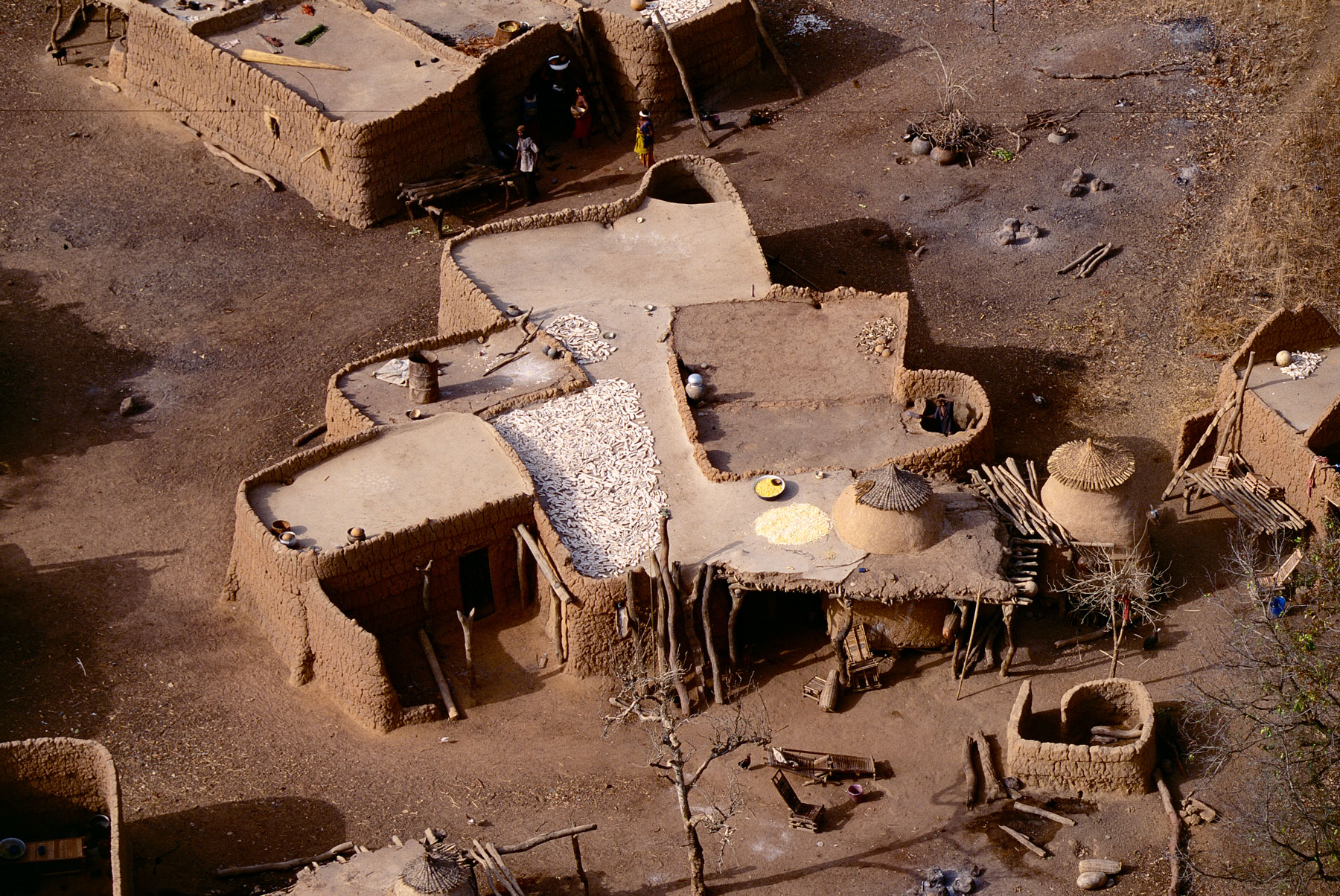 Séchage d'ignames sur les toits d'un village du Nord de Bouna