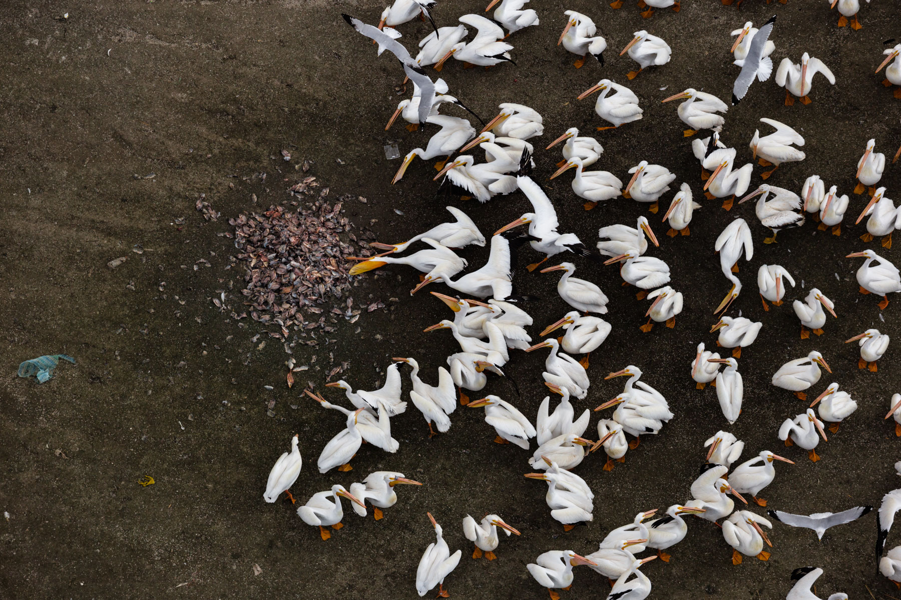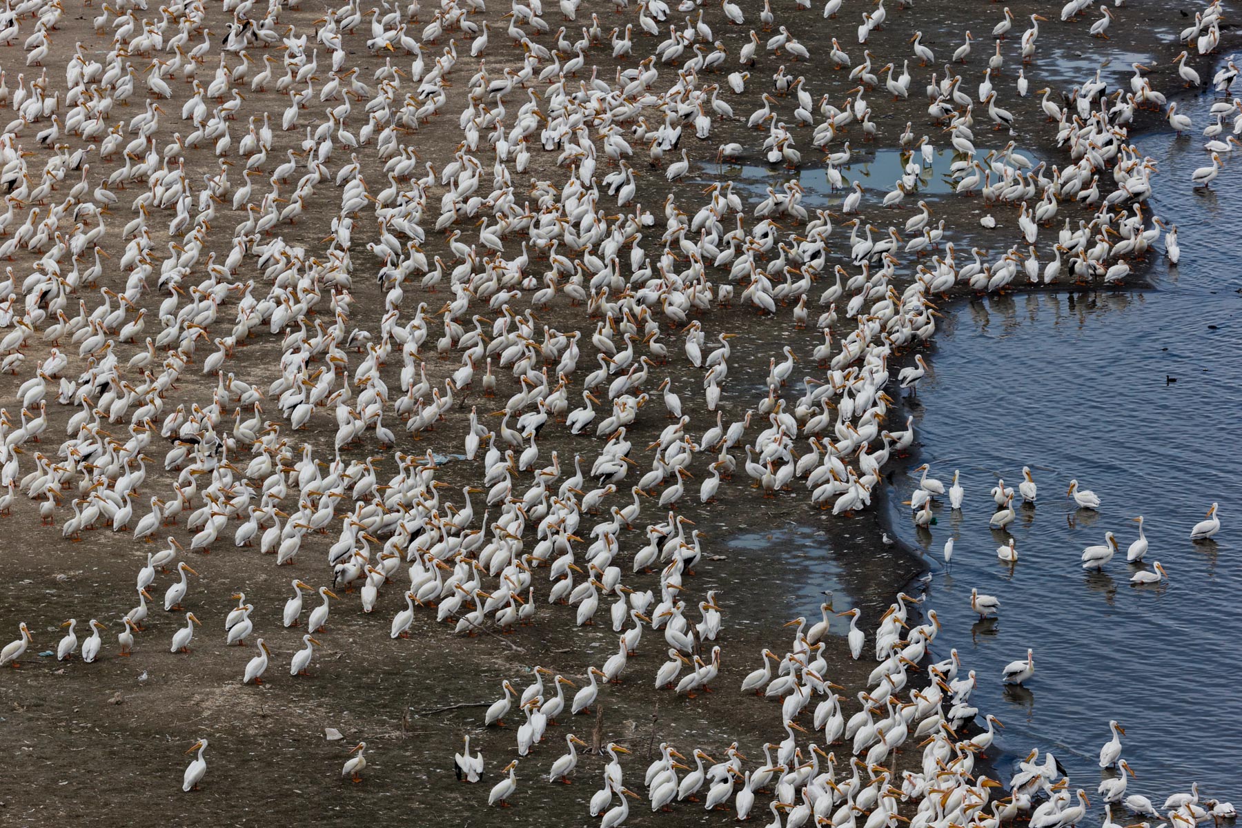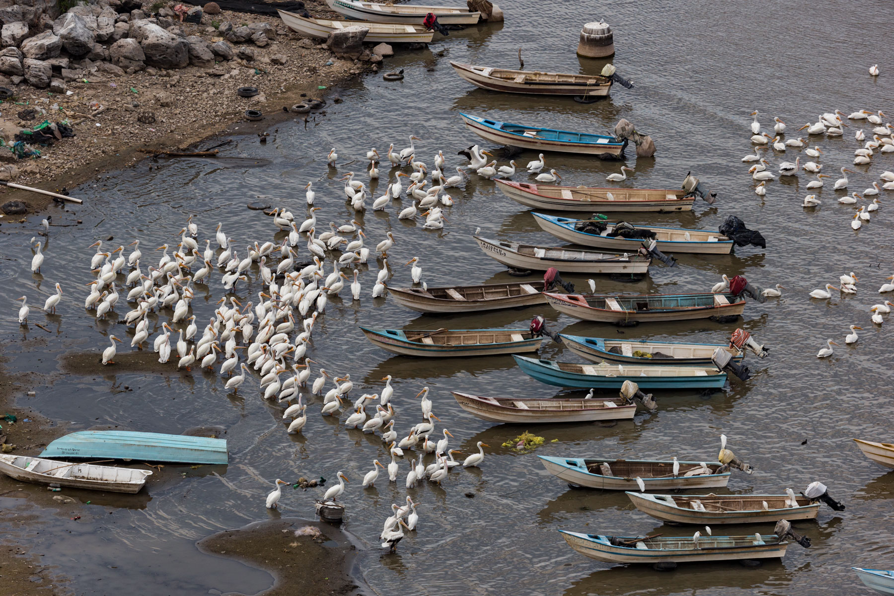 Pélicans blancs sur la rive du lac de Chapala, près de Petatan, Etat de Michoacan, Mexique (19°32'3.90"N - 102°14'57.31"O)