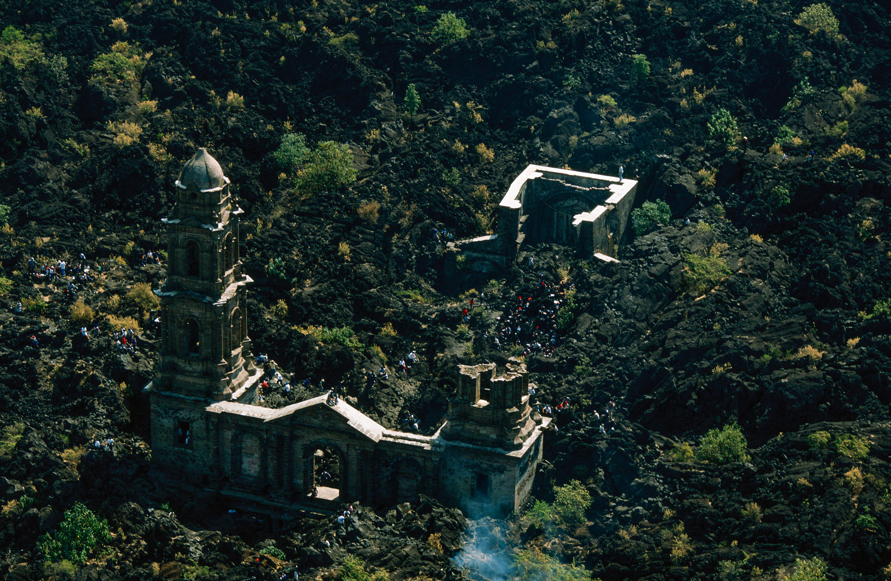 Church at the foot of the Paricutín volcano, San Juan Parangaricutiro, Michoacán, Mexico (19°32' N, 102°15' W).