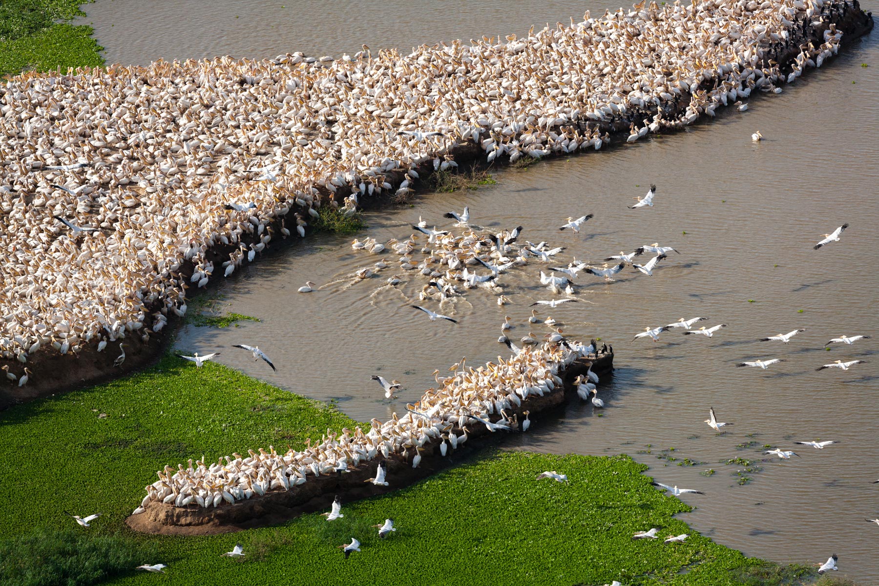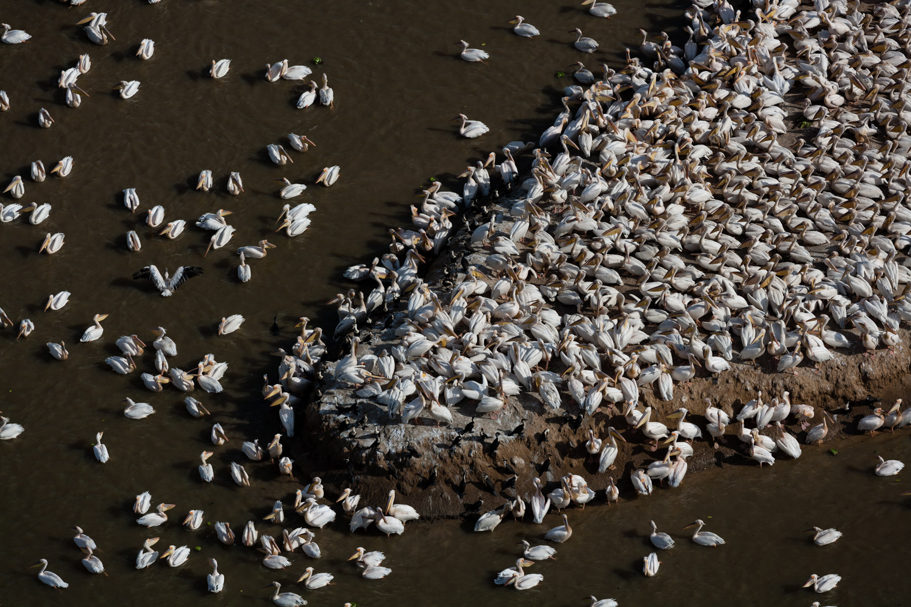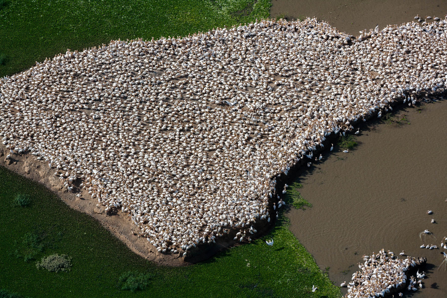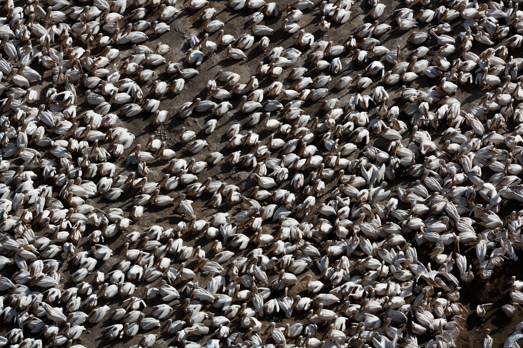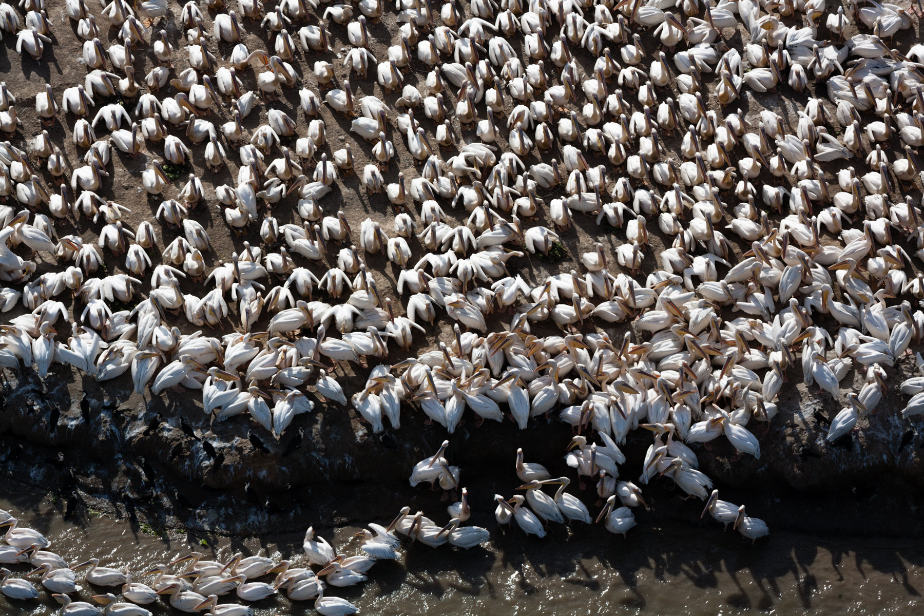 White Pelicans in the Senegal River Delta near St. Louis, Djoudj National Park Sanctuary, Senegal (16° 25' N – 16°16' W).