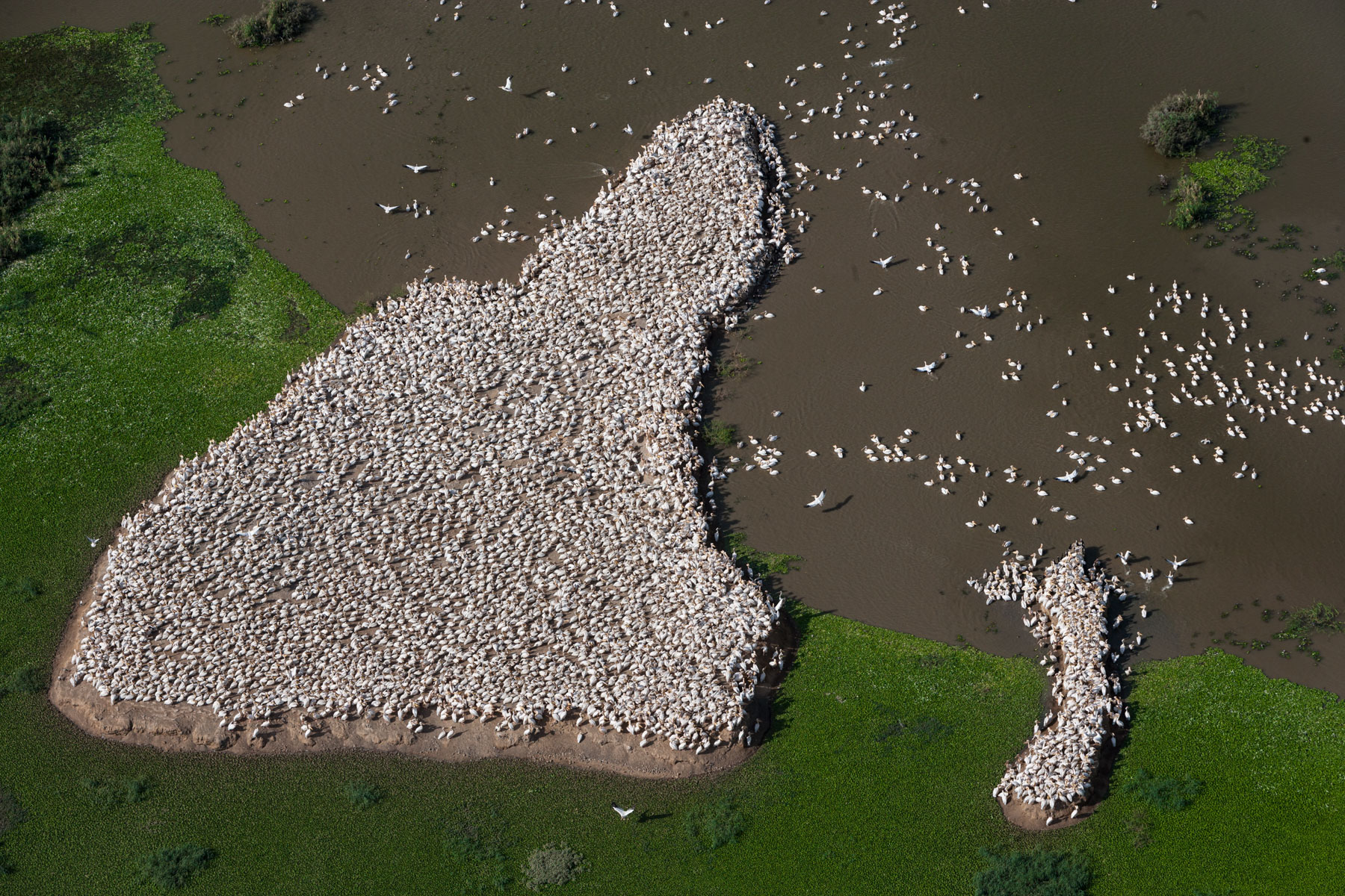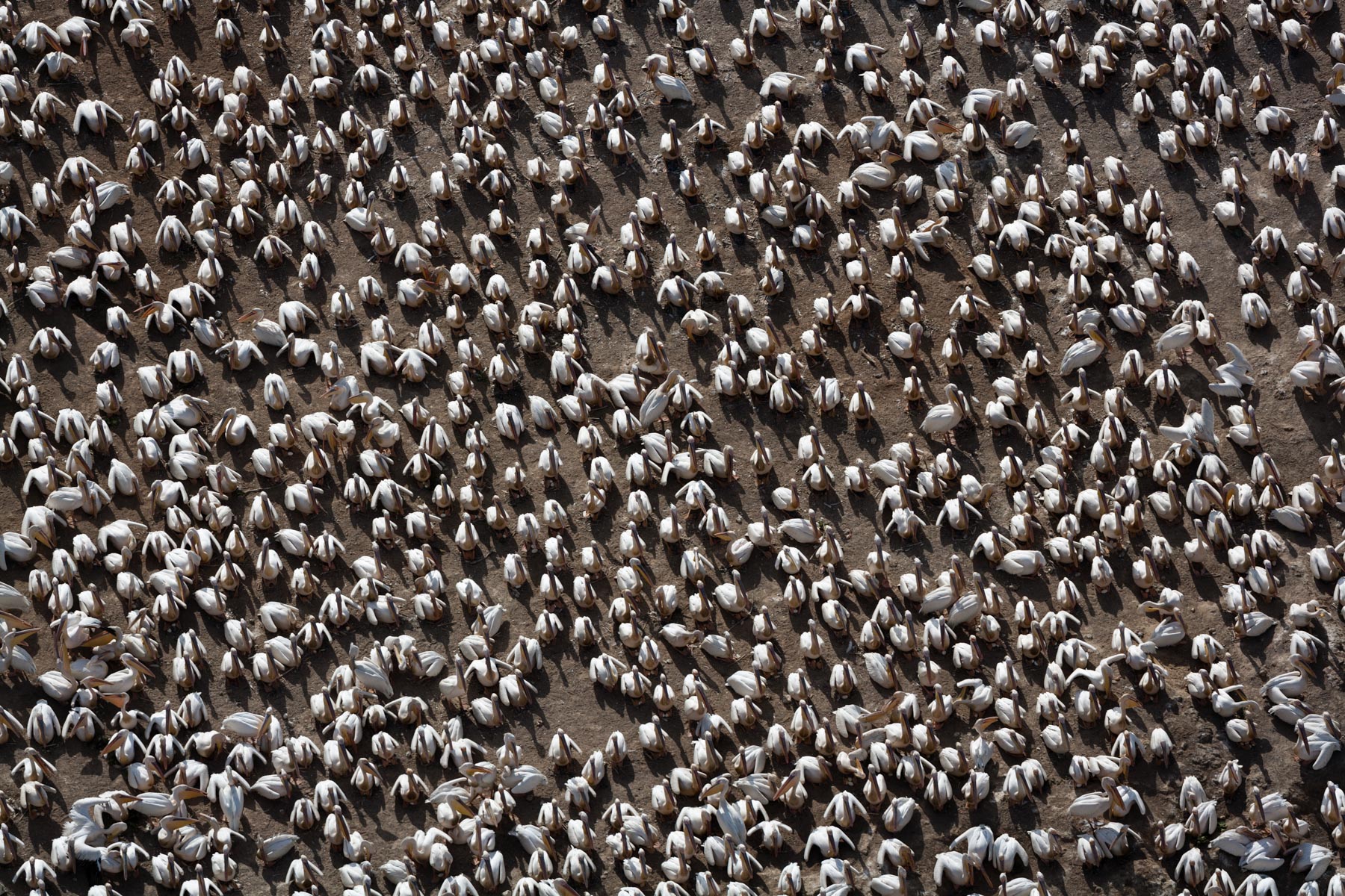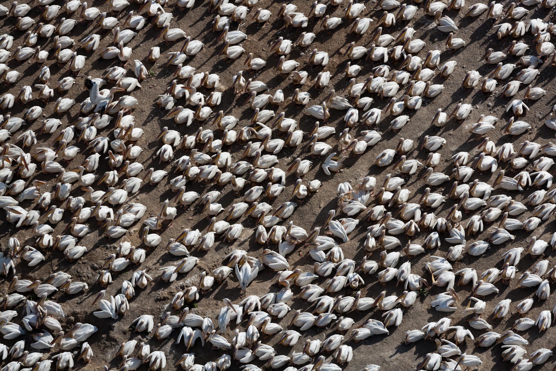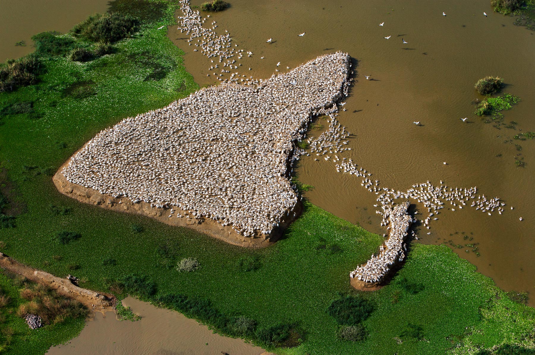 White Pelicans in the Senegal River Delta near St. Louis, Djoudj National Park Sanctuary, Senegal (16° 25' N – 16°16' W).