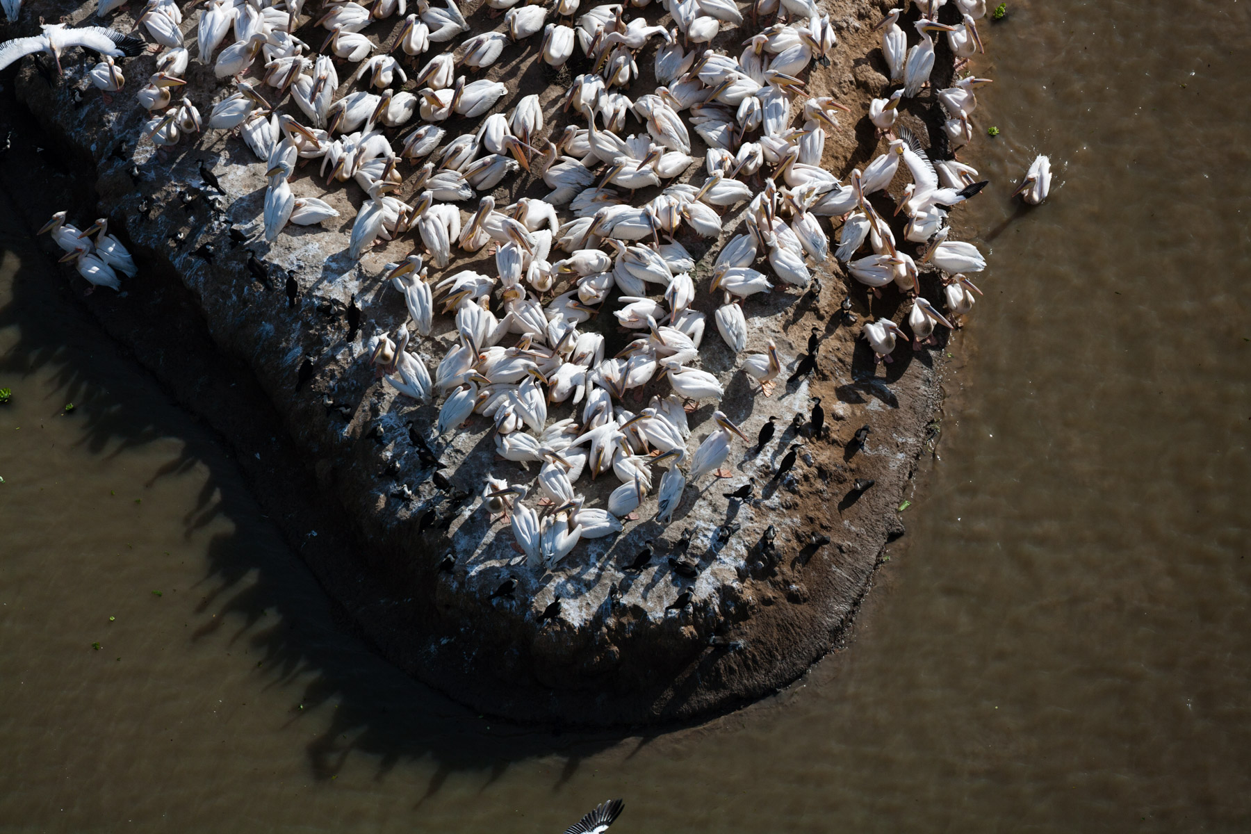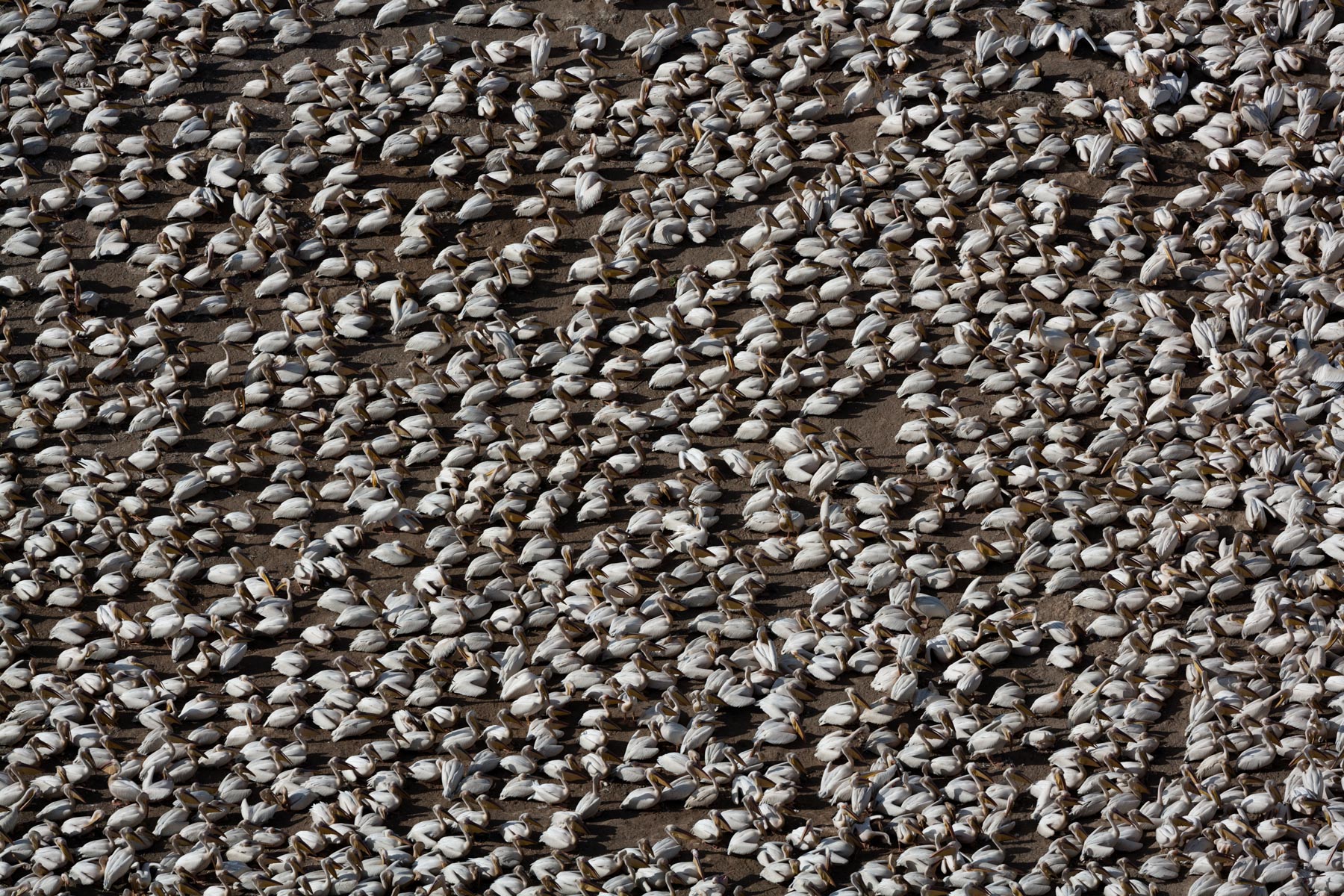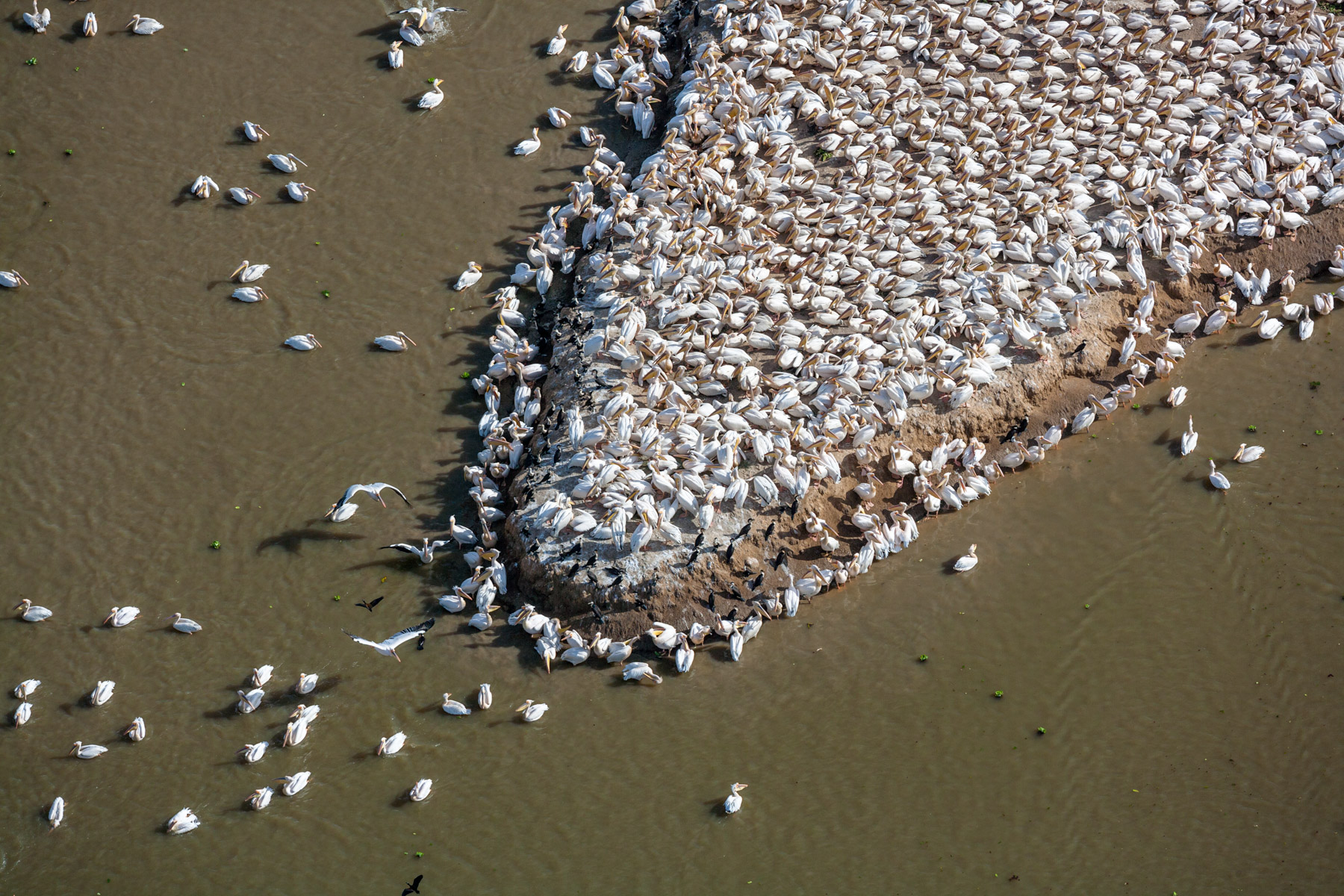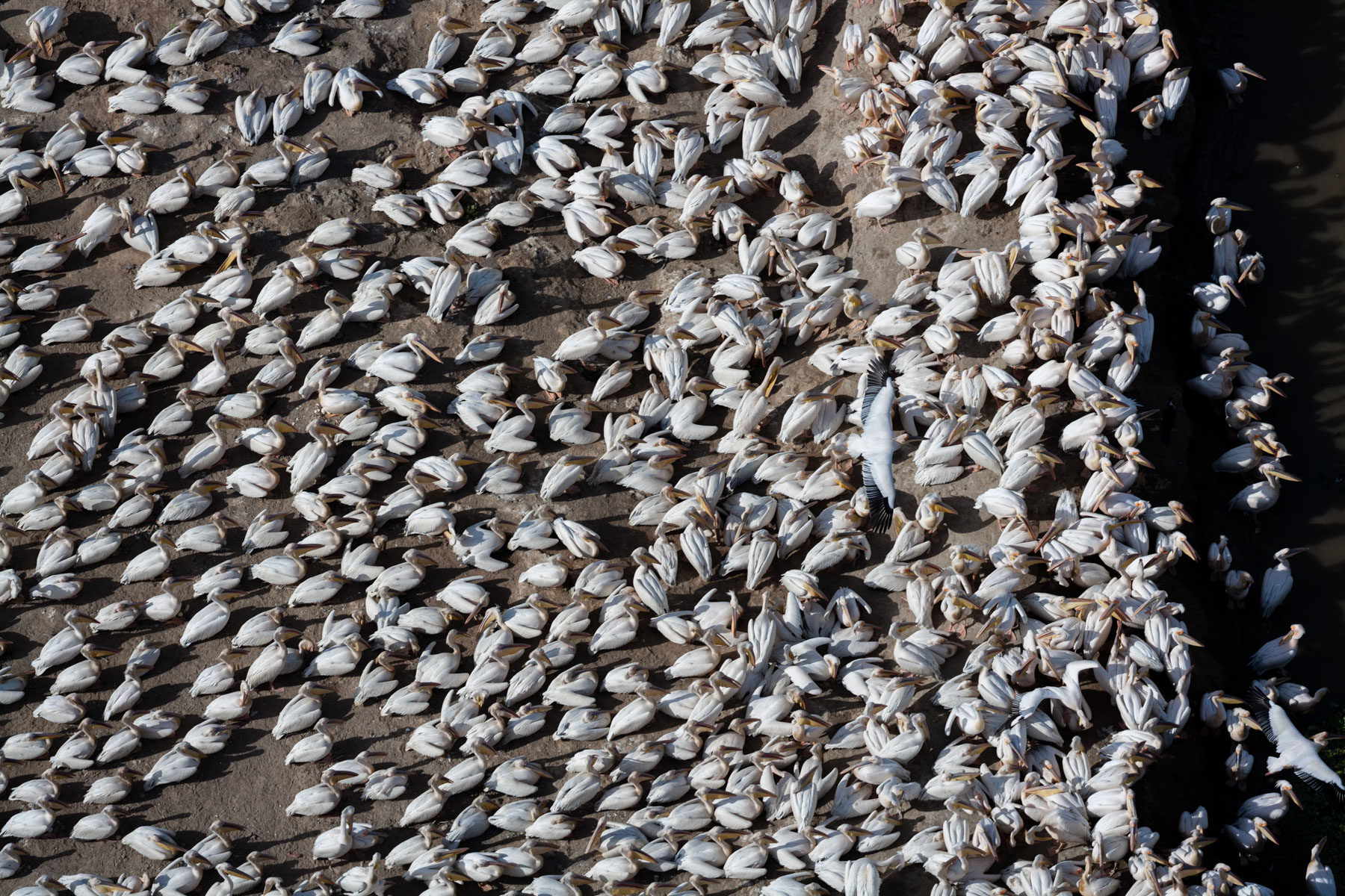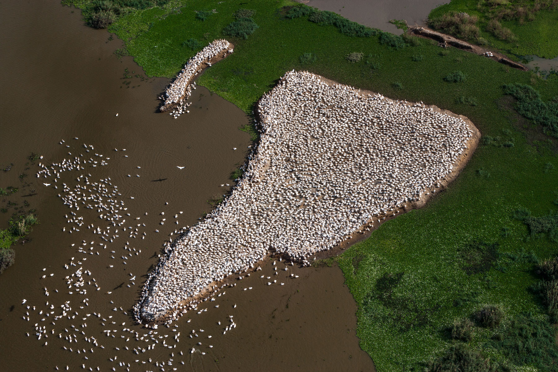 White Pelicans in the Senegal River Delta near St. Louis, Djoudj National Park Sanctuary, Senegal (16° 25' N – 16°16' W).