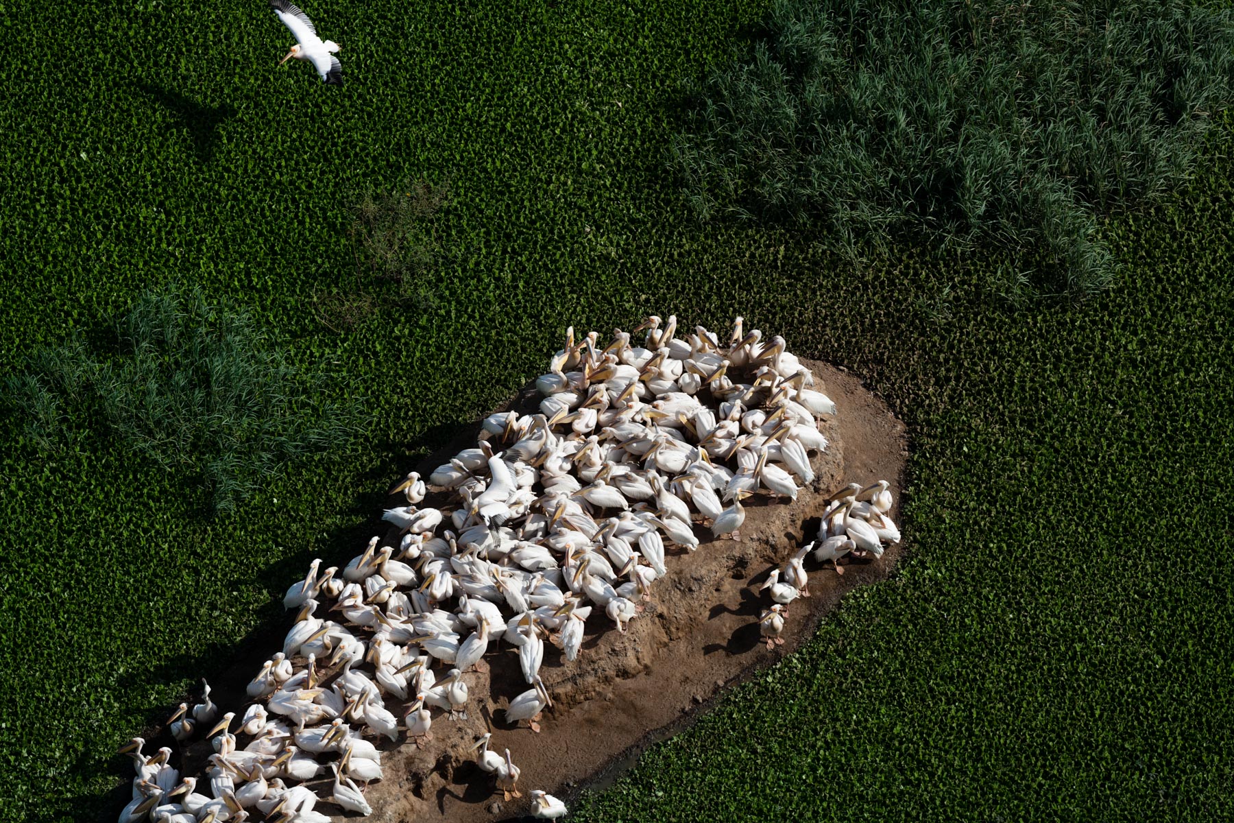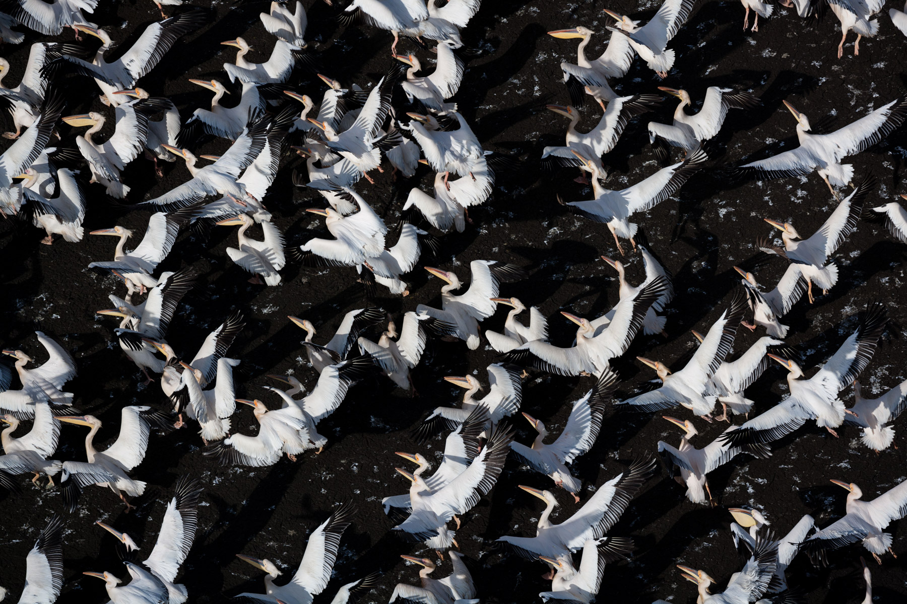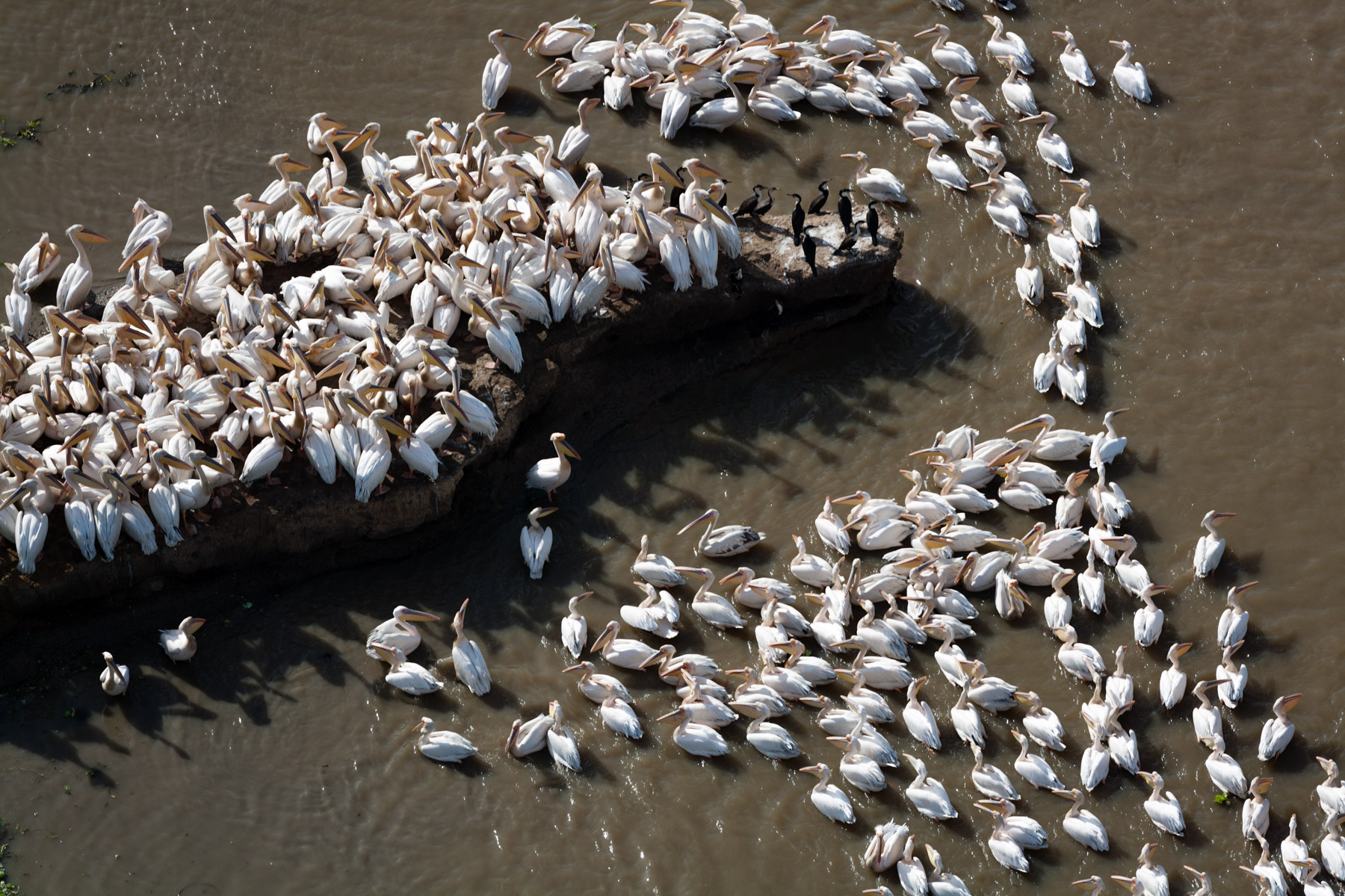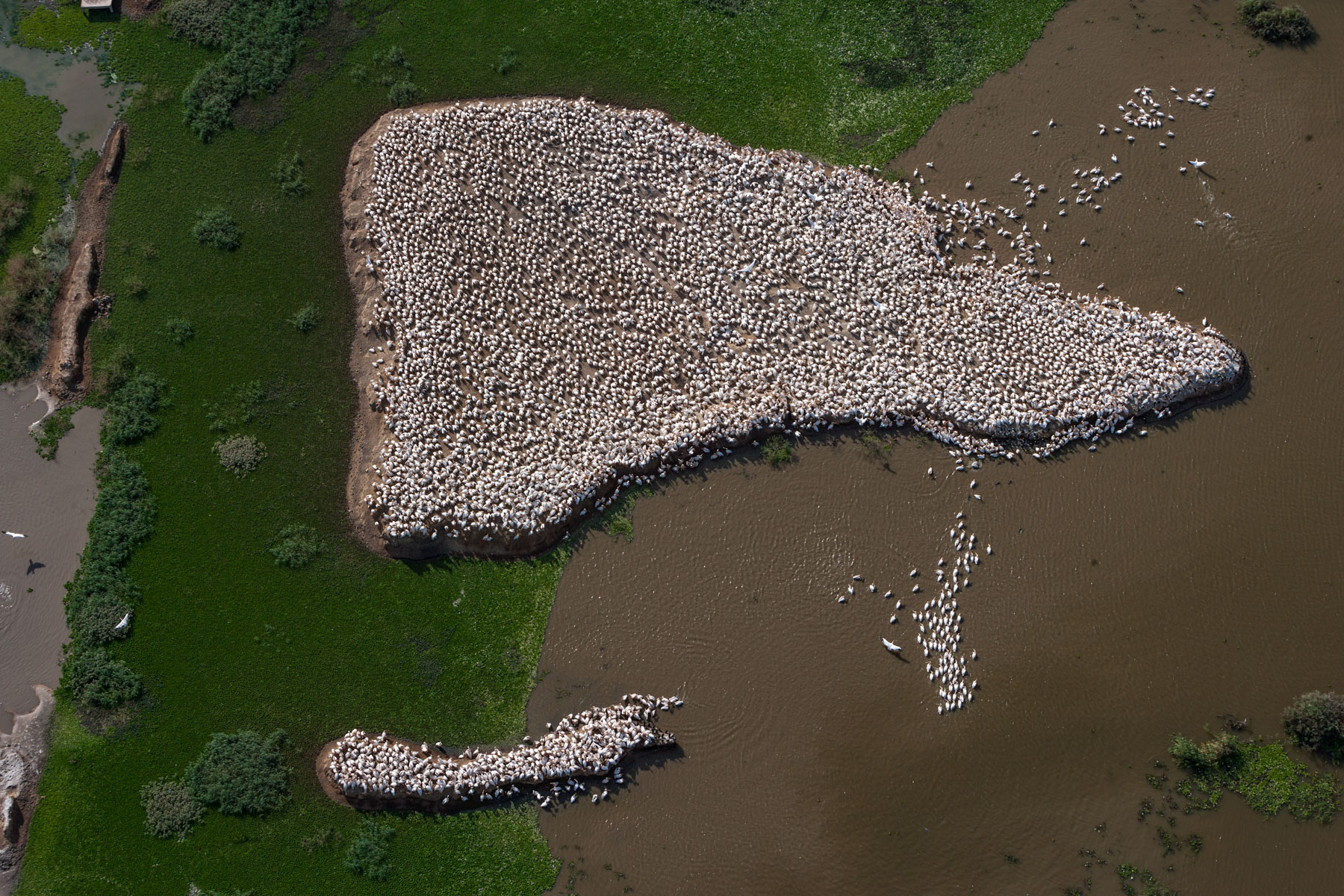 White Pelicans in the Senegal River Delta near St. Louis, Djoudj National Park Sanctuary, Senegal (16° 25' N – 16°16' W).
