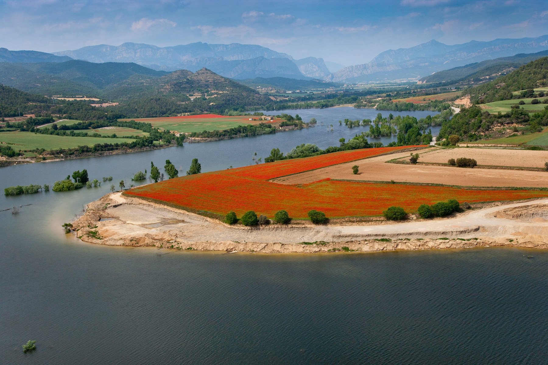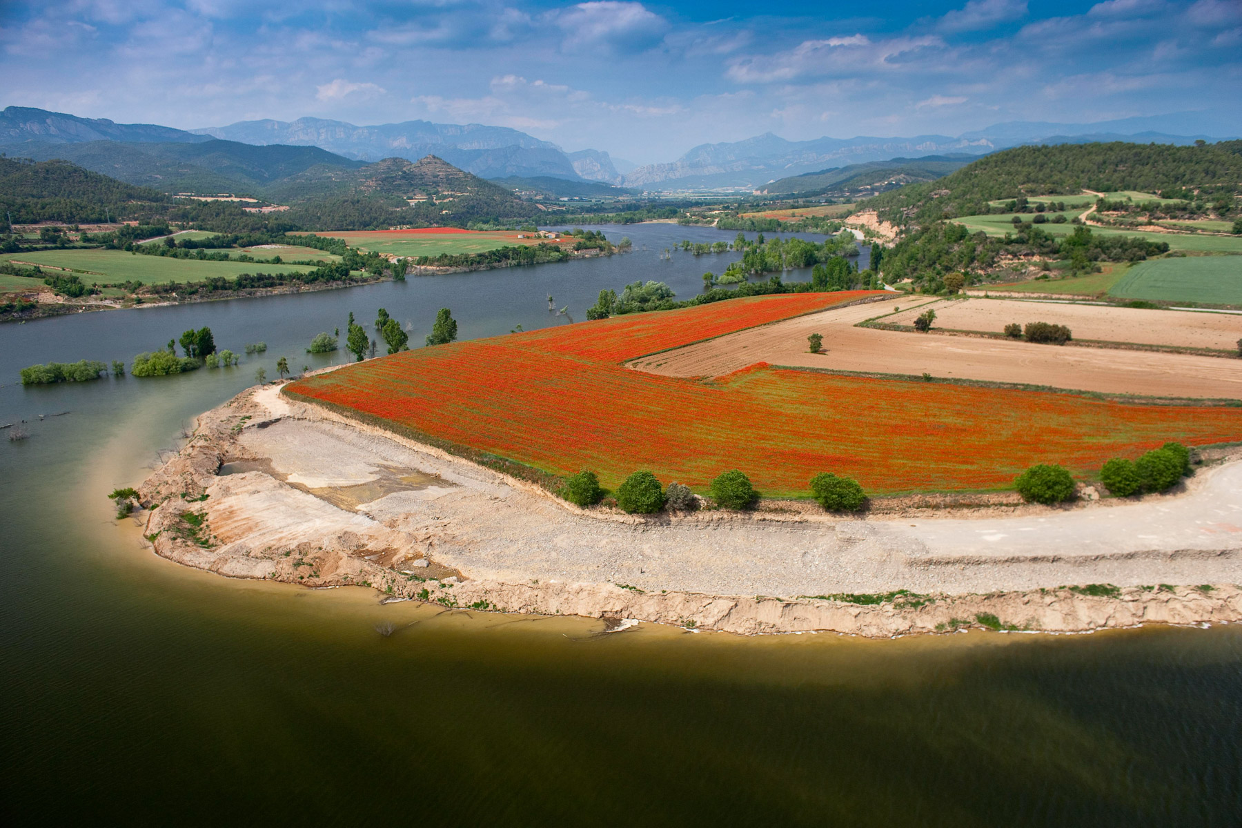 Champs de coquelicots sur les rives du Lac de Rialb, Catalogne, Espagne