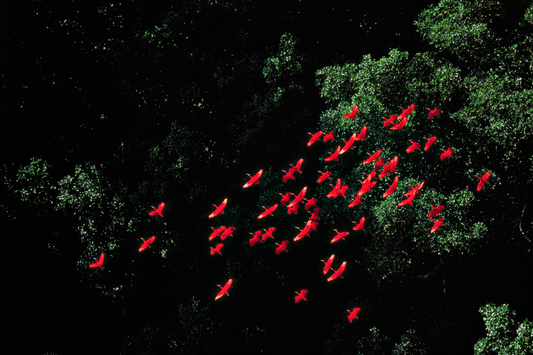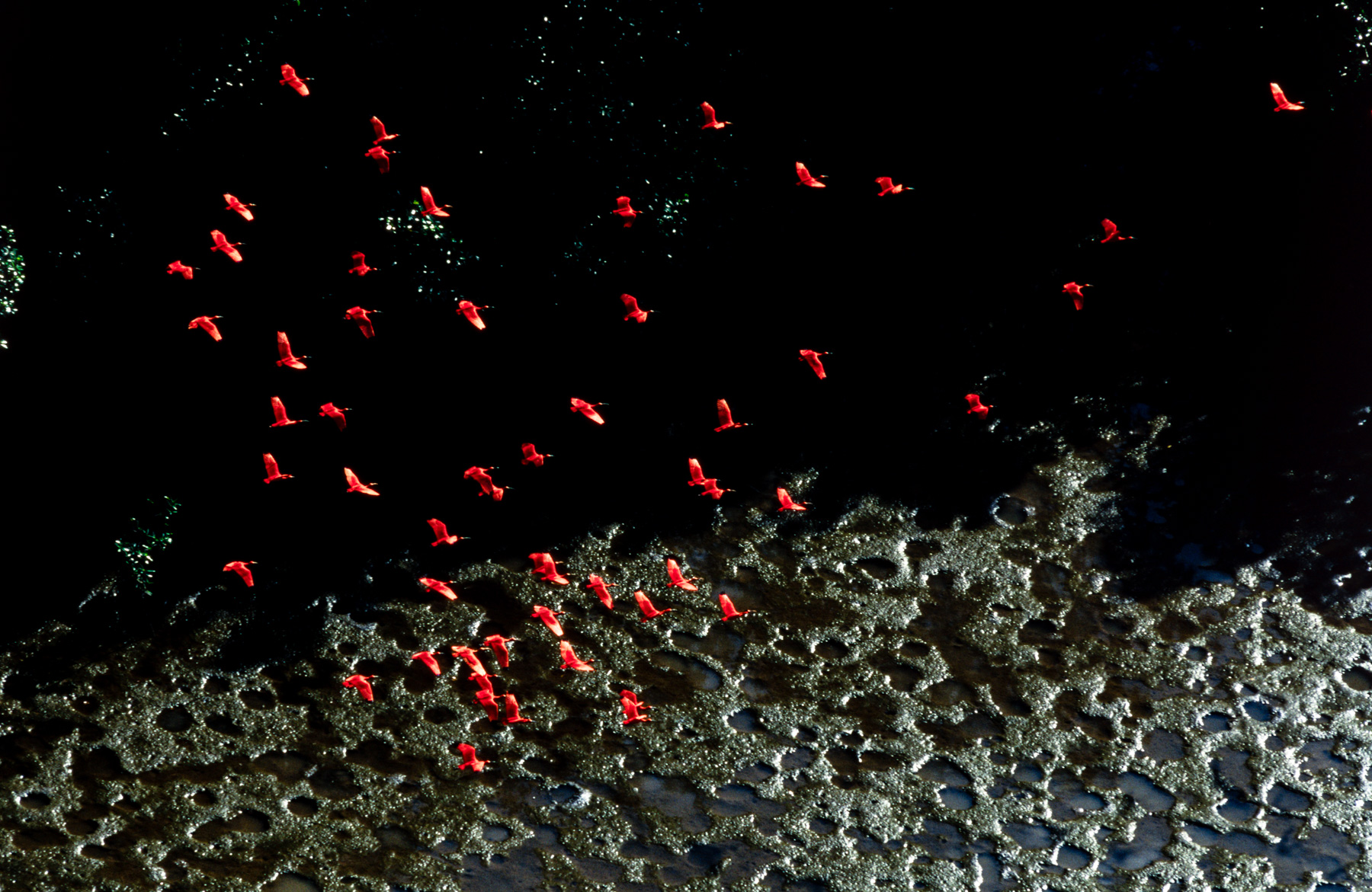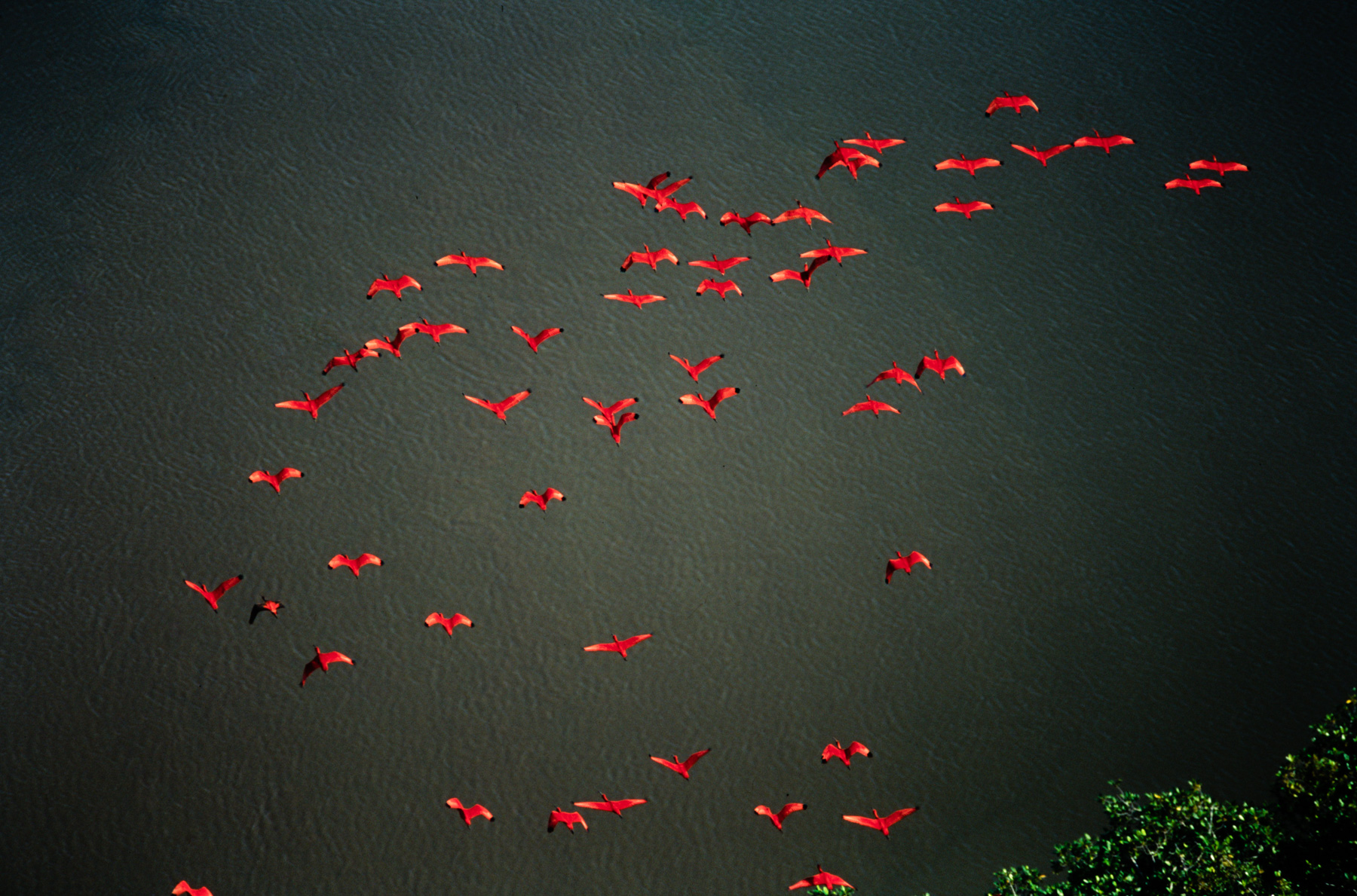 Vol d’ibis rouges près de Pedernales, delta Amacuro, Venezuela (9°57’ N – 62°21’ O).