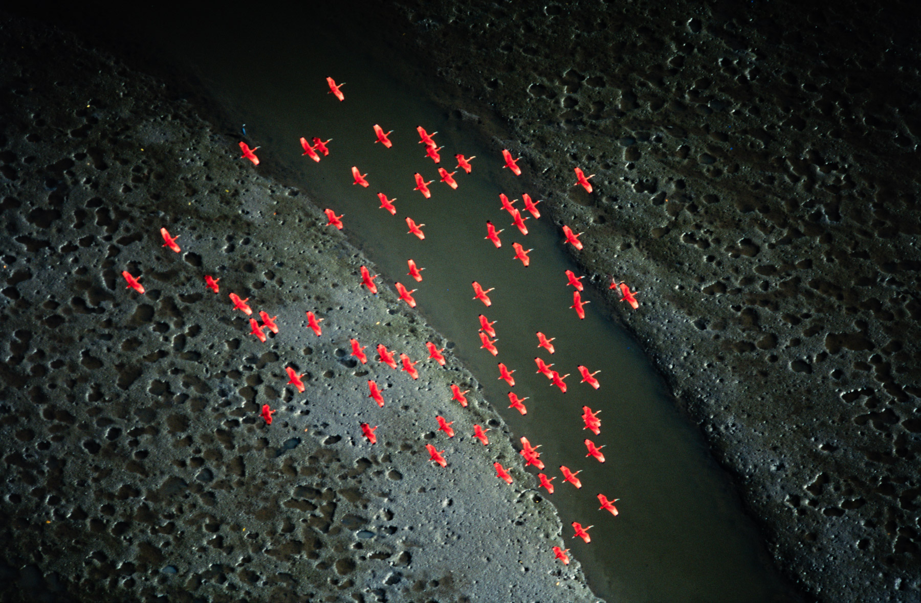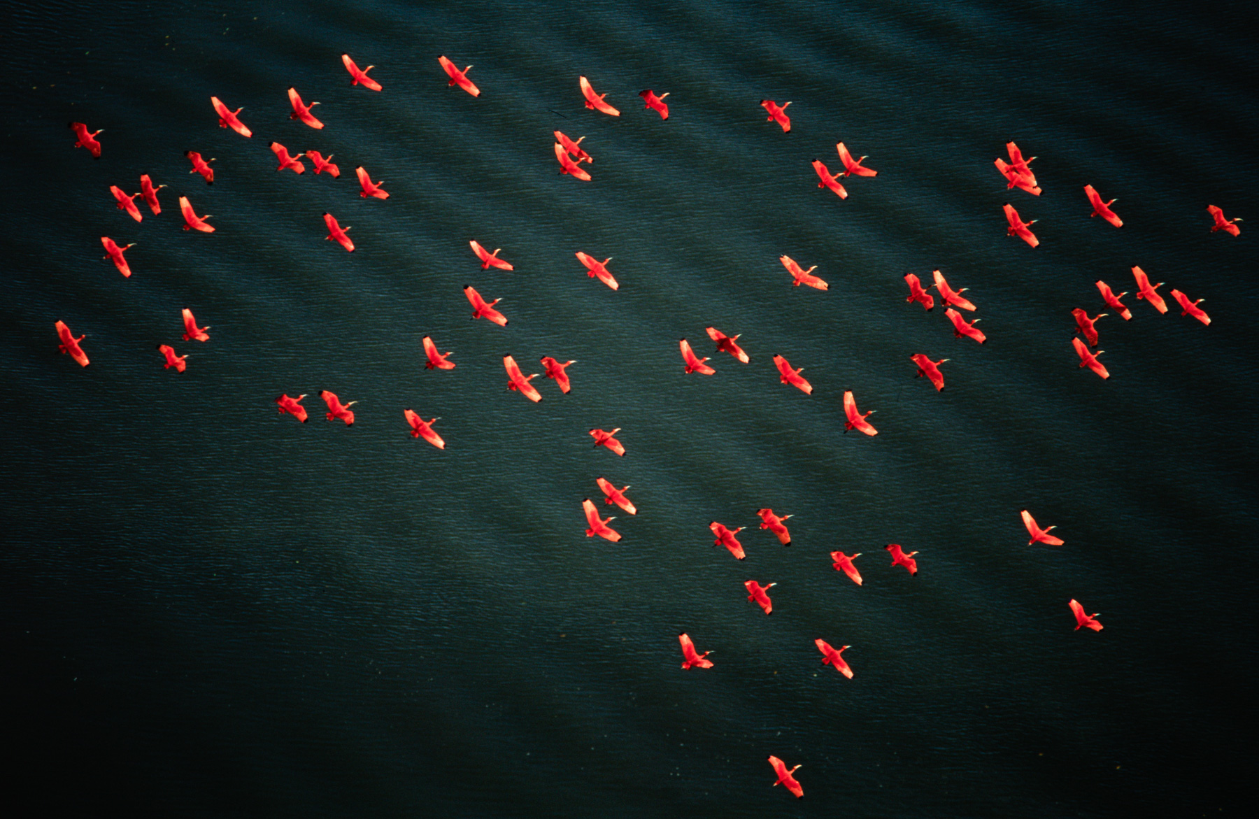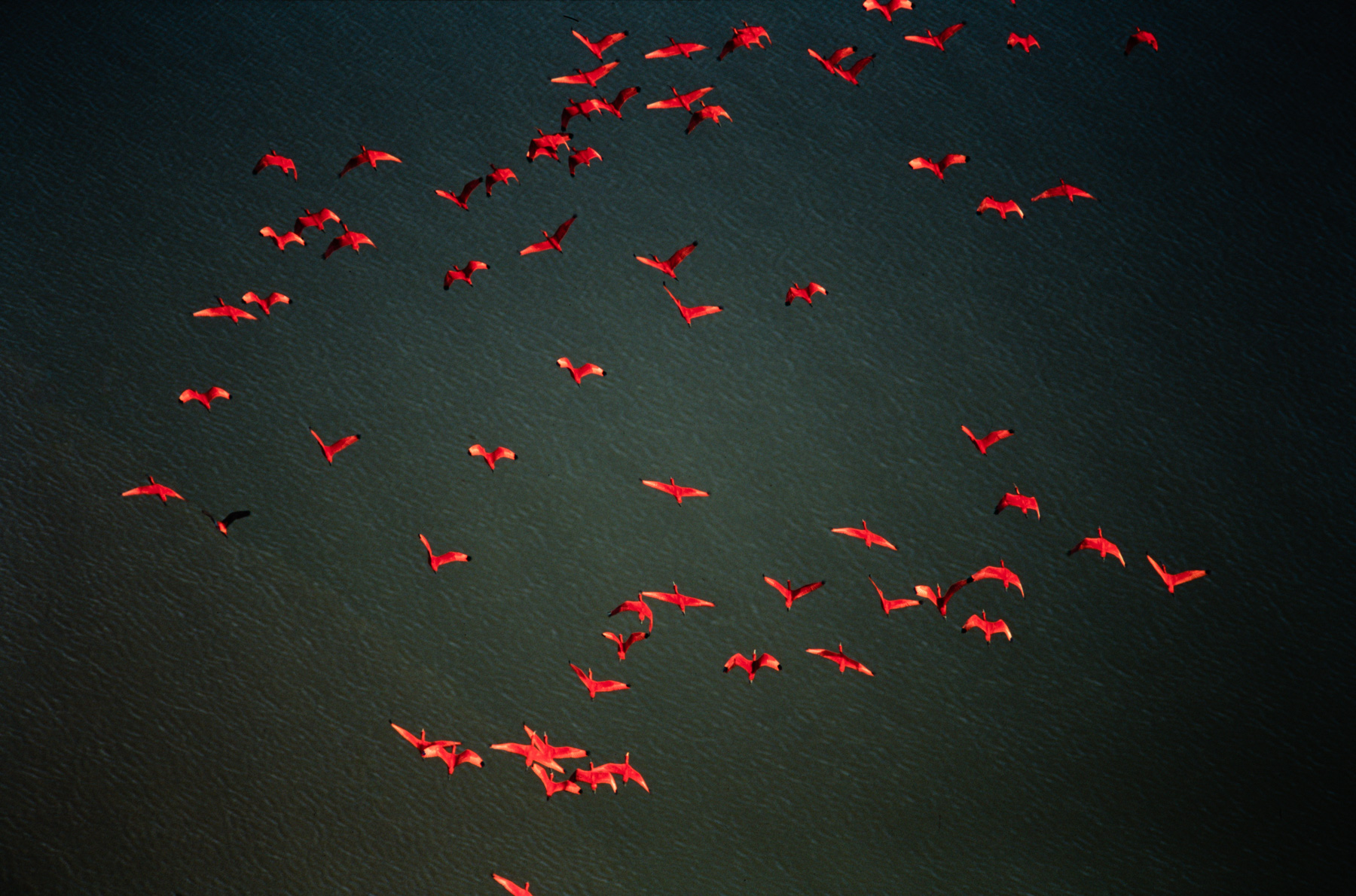 Vol d’ibis rouges près de Pedernales, delta Amacuro, Venezuela (9°57’ N – 62°21’ O).