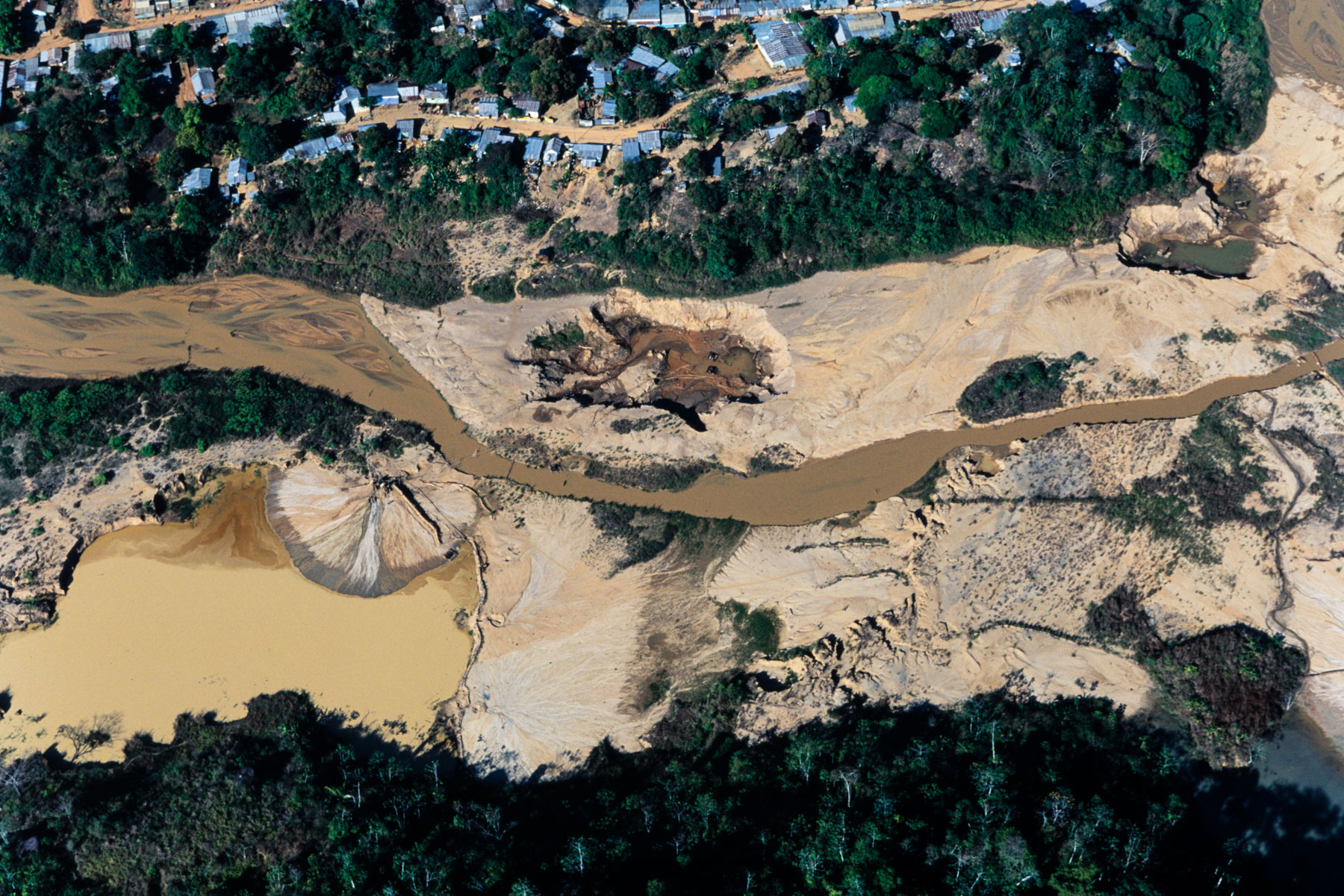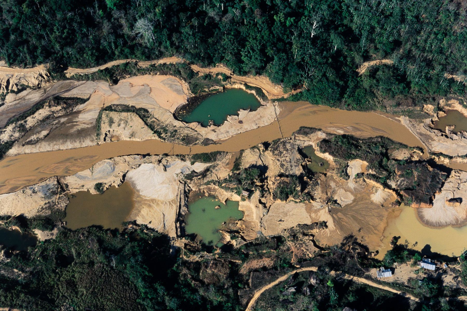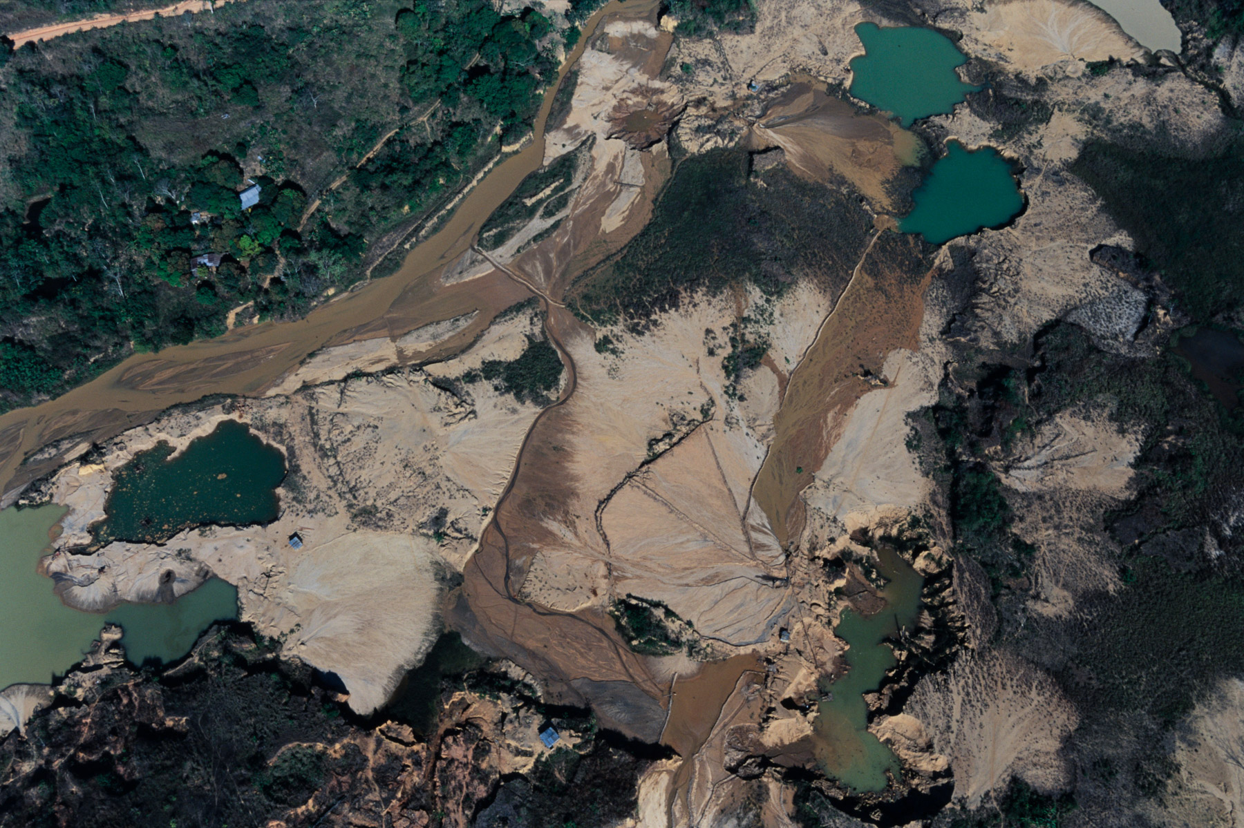 Barges d’orpailleurs sur la rivière Caroni, État de Bolivar, Venezuela (5°20' N – 62°40' O).