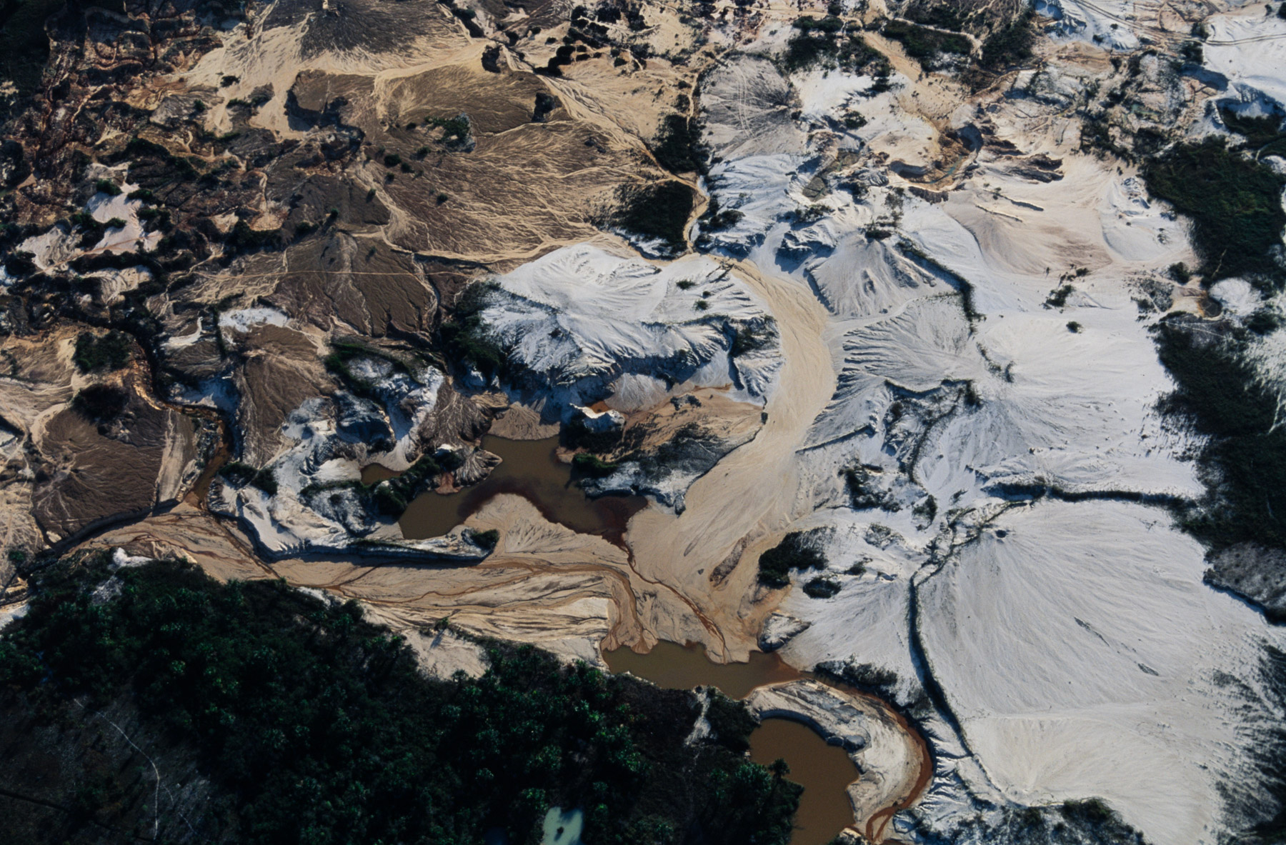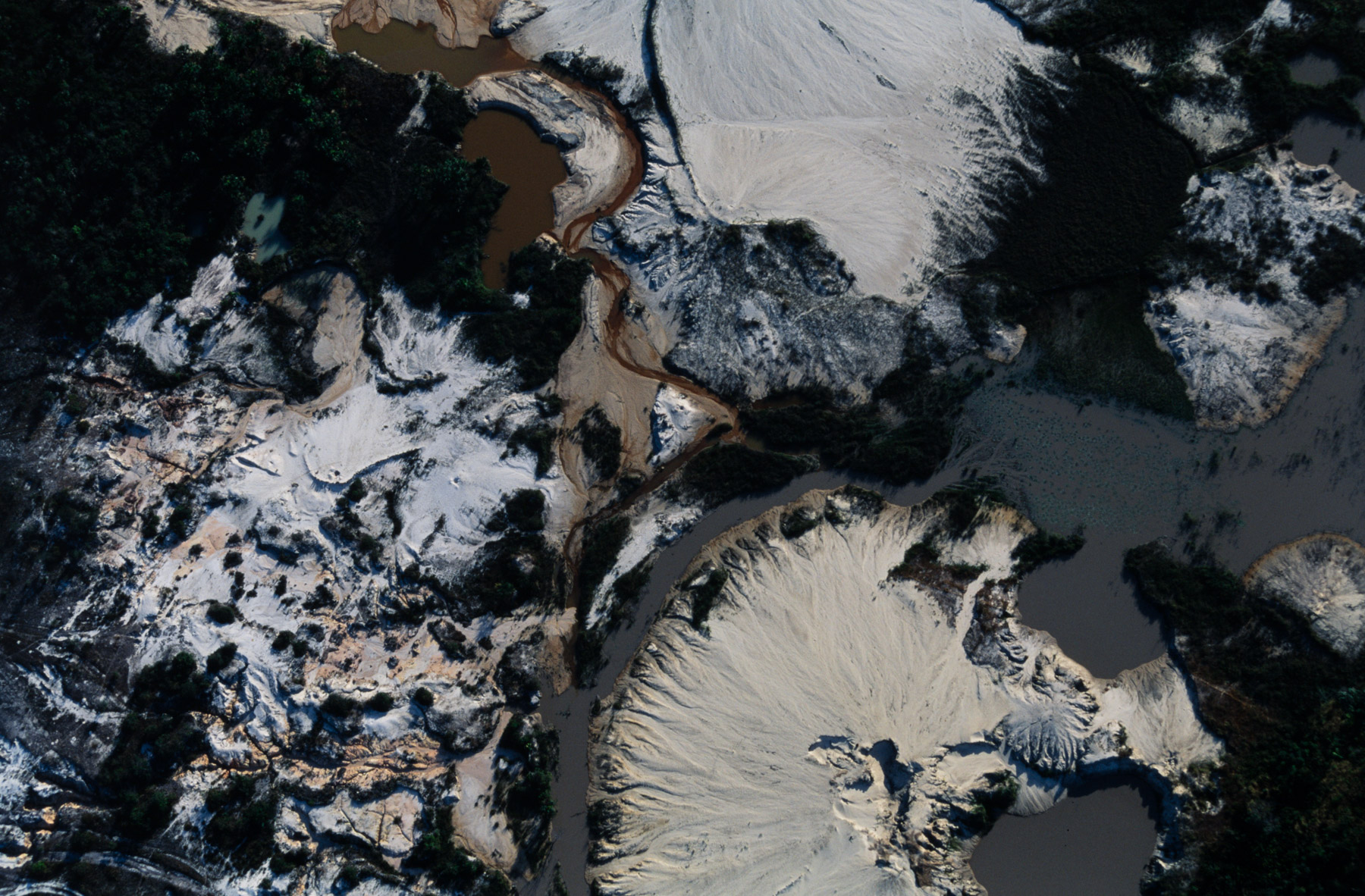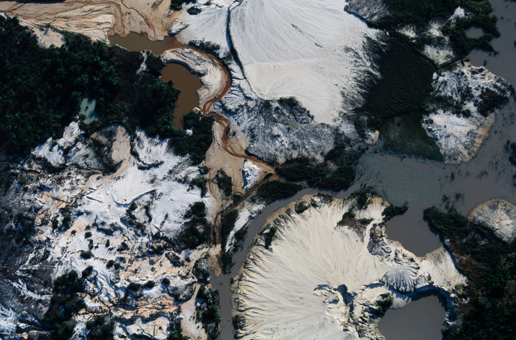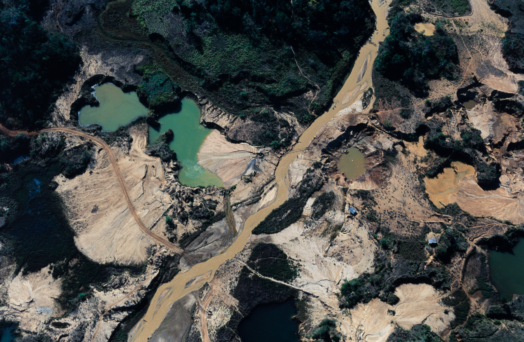 Barges d’orpailleurs sur la rivière Caroni, État de Bolivar, Venezuela (5°20' N – 62°40' O).