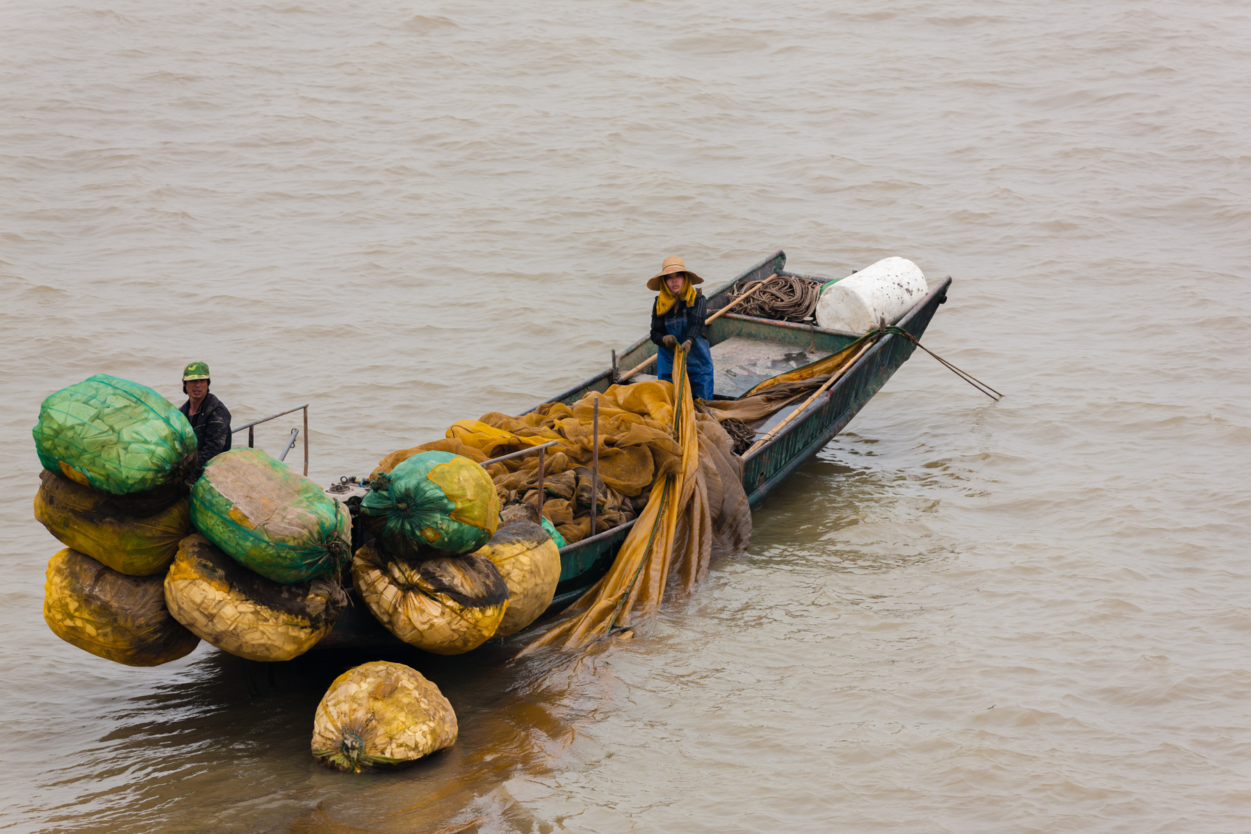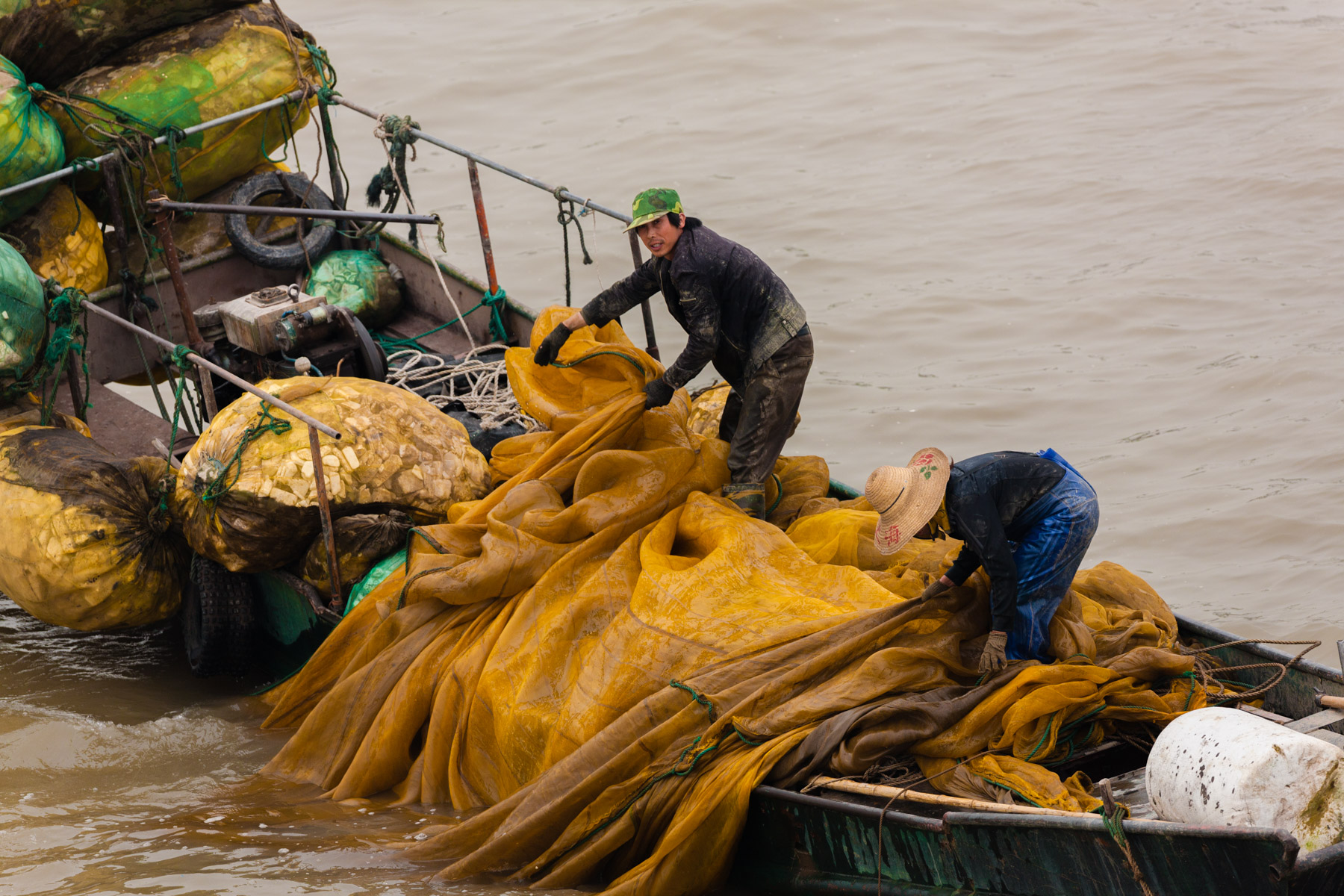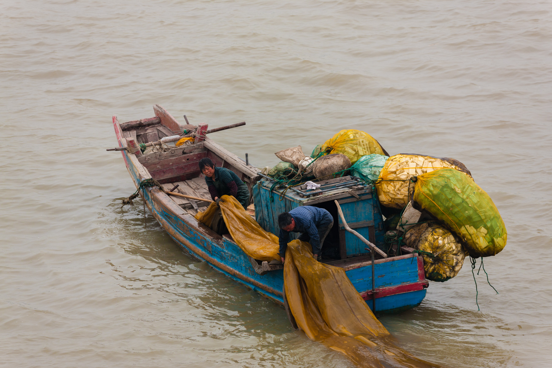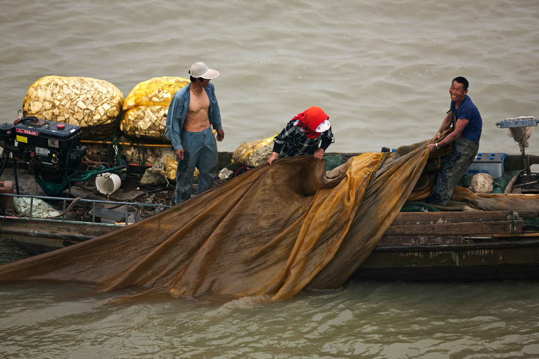 Bateau de pêche sur le Yangtsé au large de Shanghai, Chine (31°28' N - 121°27' E). Le fleuve Yangtsé est le plus grand fleuve de Chine, et son bassin compte pour 70 % de la pêche continentale du pays. Pour autant, depuis 2002 la pêche est régulièrement interdite sur l’ensemble du fleuve chaque année pour des périodes plus ou moins longues afin de permettre la reconstitution des stocks de poissons, notamment pendant la période de reproduction. Beaucoup d’espèces sont au bord de l’extinction et pourrait connaître le sort du dauphin de Chine (Lipotes vexillifer), un cétacé d’eau douce endémique du Yangtsé. Ce dernier a été déclaré éteint en 2007. Le marsouin du Yangtsé, un autre cétacé d’eau douce est lui en sursis. La pêche et l’aquaculture jouent un rôle de plus en plus important dans l’alimentation des hommes. Ainsi, à l’échelle de la planète, la consommation de poissons est passée de 10 kg par an et par personne dans les années 1960 à 19 kg par an et par personne en 2012, selon l’Organisation des Nations-unies pour l’alimentation et l’agriculture (FAO). Cela représente 17 % des apports protéiniques mondiaux. On estime que 60 millions de personnes travail dans le domaine de la pêche et de l’aquaculture dont 84 % en Asie. Les tonnages pêchés, de l’ordre de 80 millions de tonnes par an, sont stables mais de nombreuses pêcheries sont surexploitées. Seule l’aquaculture progresse. La Chine représente à elle seule 60 % de la production de ce dernier secteur.