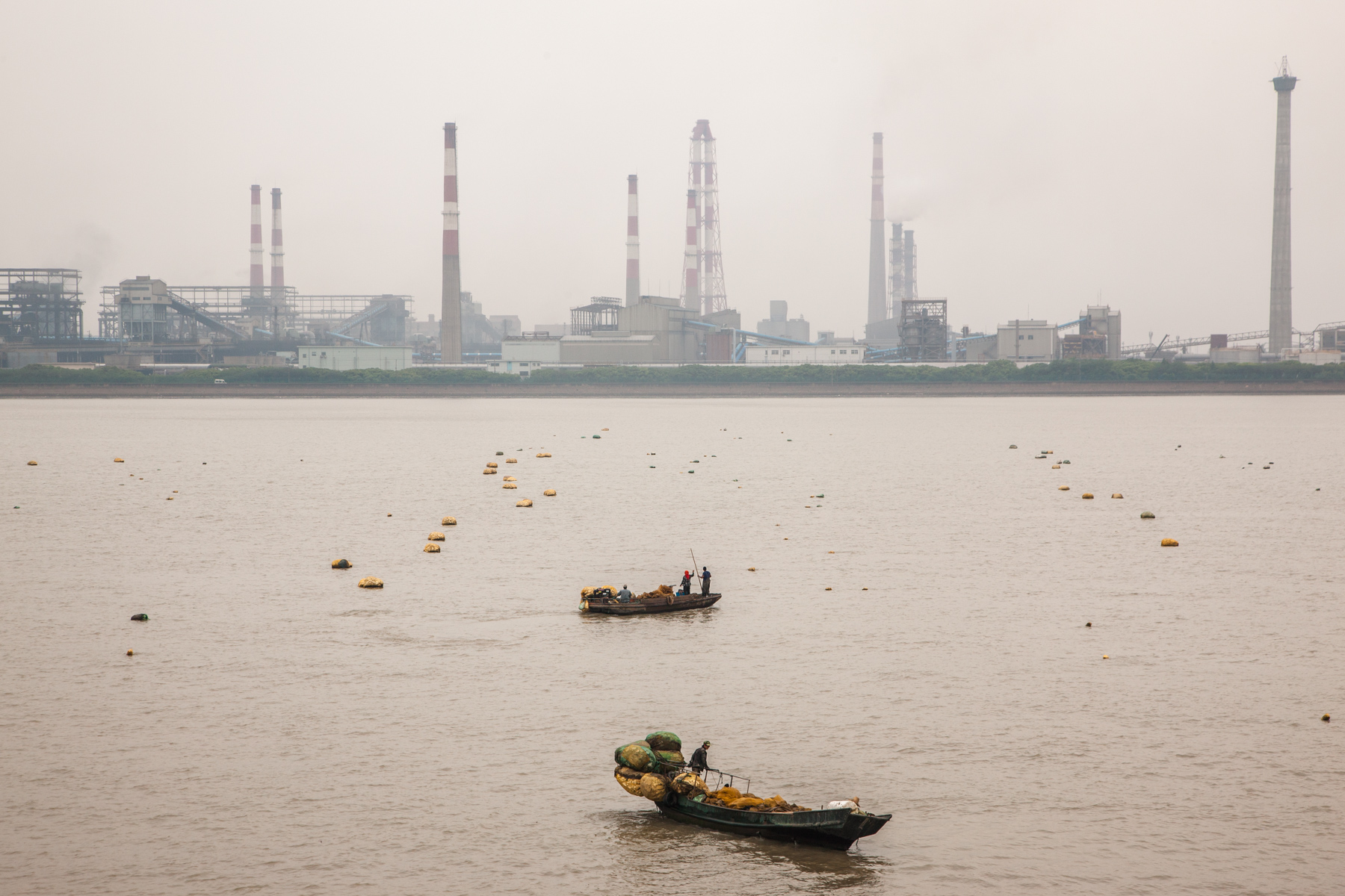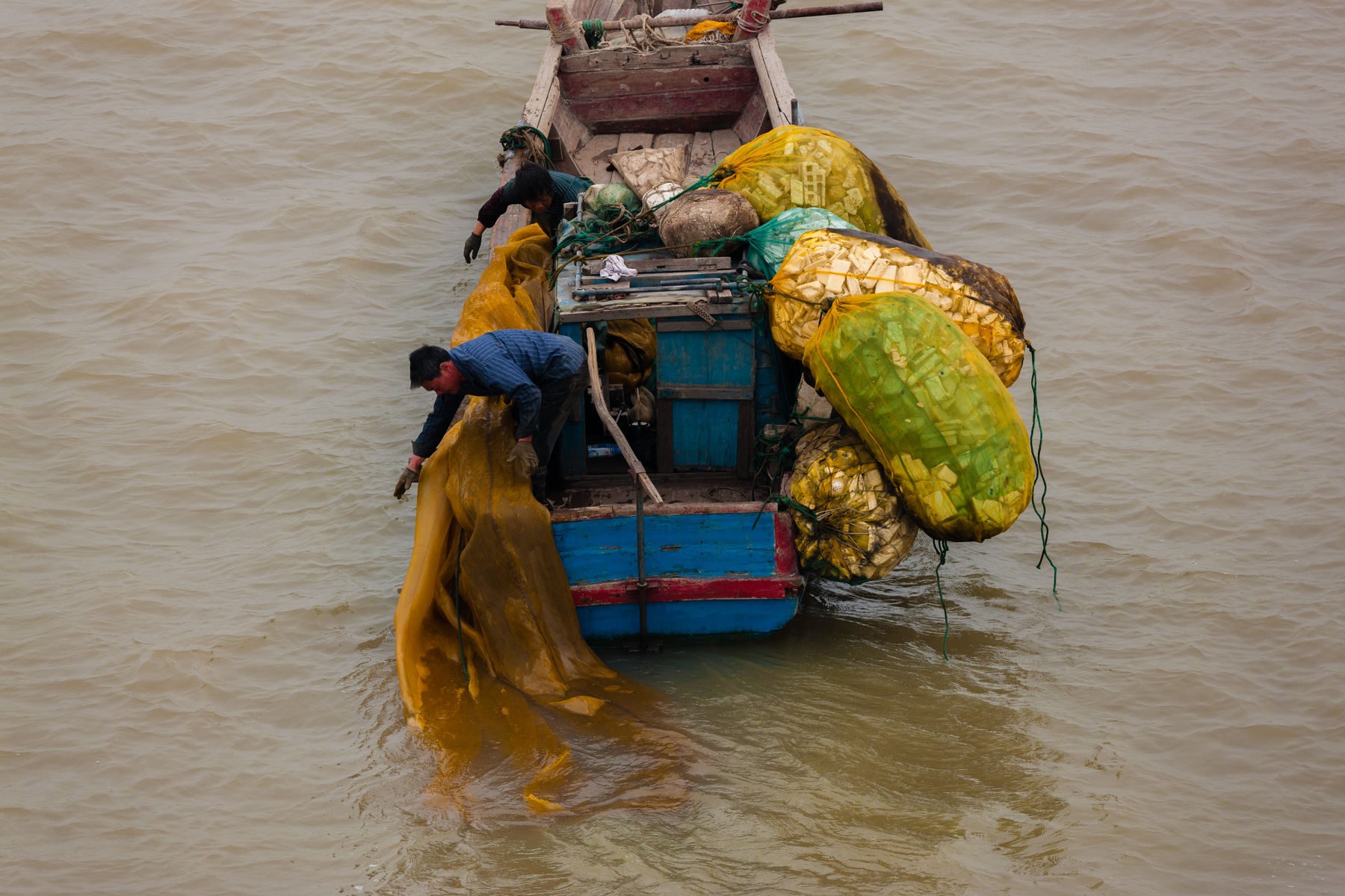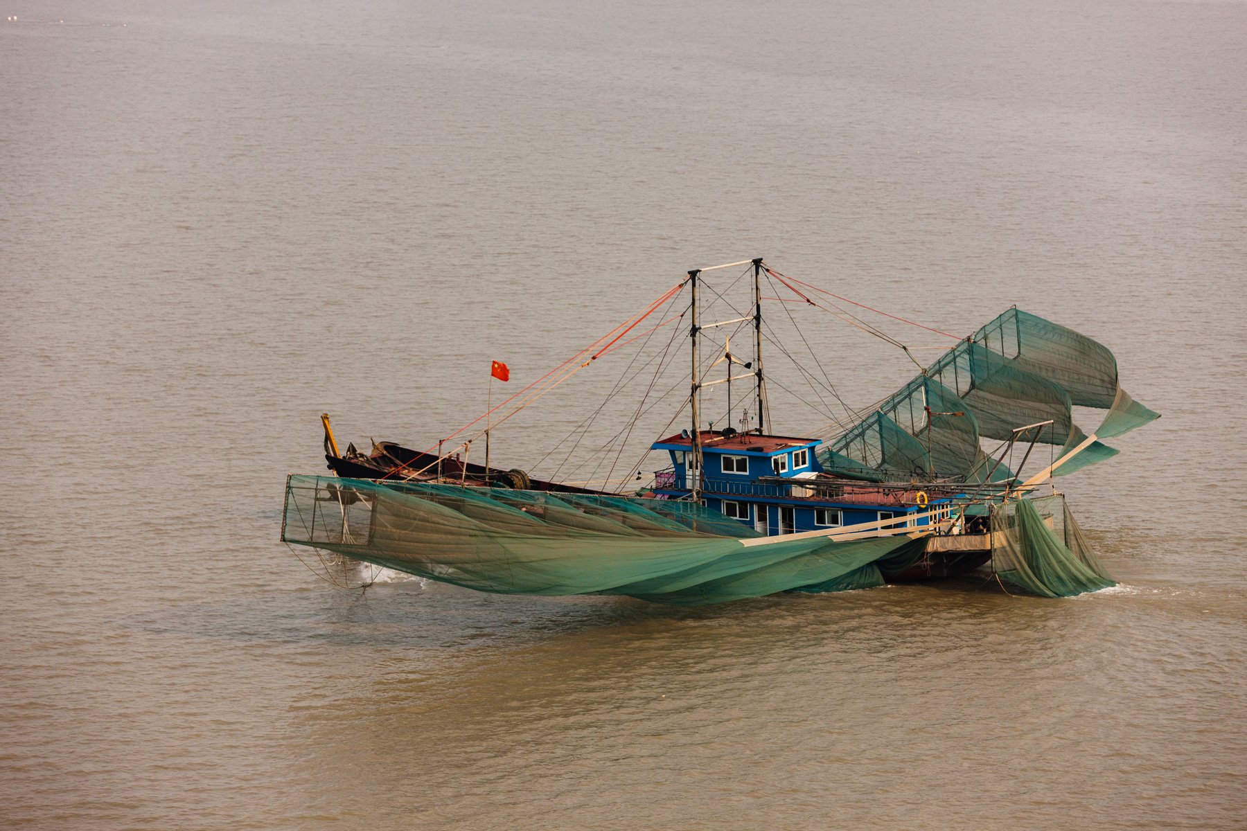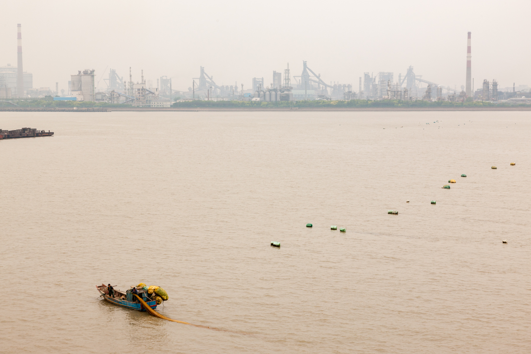 Bateau de pêche sur le Yangtsé au large de Shanghai, Chine (31°28' N - 121°27' E). Le fleuve Yangtsé est le plus grand fleuve de Chine, et son bassin compte pour 70 % de la pêche continentale du pays. Pour autant, depuis 2002 la pêche est régulièrement interdite sur l’ensemble du fleuve chaque année pour des périodes plus ou moins longues afin de permettre la reconstitution des stocks de poissons, notamment pendant la période de reproduction. Beaucoup d’espèces sont au bord de l’extinction et pourrait connaître le sort du dauphin de Chine (Lipotes vexillifer), un cétacé d’eau douce endémique du Yangtsé. Ce dernier a été déclaré éteint en 2007. Le marsouin du Yangtsé, un autre cétacé d’eau douce est lui en sursis. La pêche et l’aquaculture jouent un rôle de plus en plus important dans l’alimentation des hommes. Ainsi, à l’échelle de la planète, la consommation de poissons est passée de 10 kg par an et par personne dans les années 1960 à 19 kg par an et par personne en 2012, selon l’Organisation des Nations-unies pour l’alimentation et l’agriculture (FAO). Cela représente 17 % des apports protéiniques mondiaux. On estime que 60 millions de personnes travail dans le domaine de la pêche et de l’aquaculture dont 84 % en Asie. Les tonnages pêchés, de l’ordre de 80 millions de tonnes par an, sont stables mais de nombreuses pêcheries sont surexploitées. Seule l’aquaculture progresse. La Chine représente à elle seule 60 % de la production de ce dernier secteur.