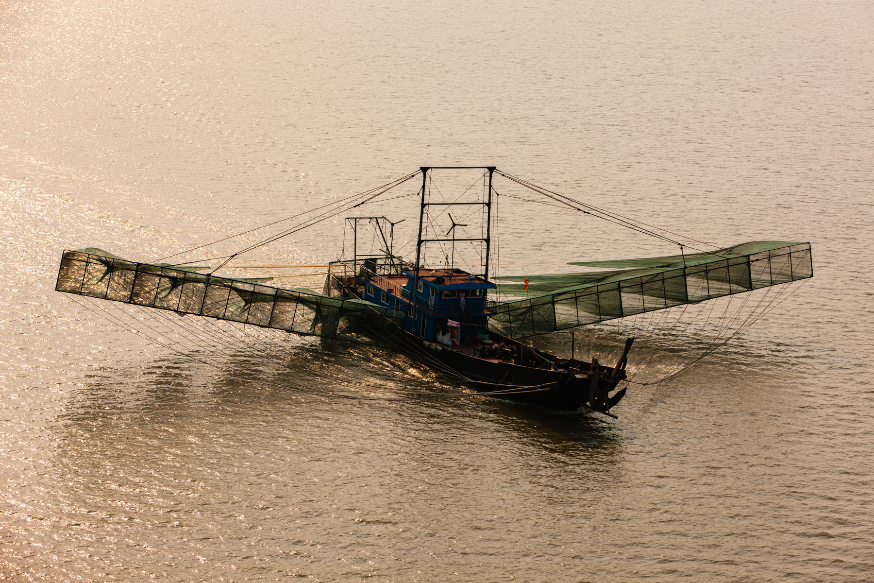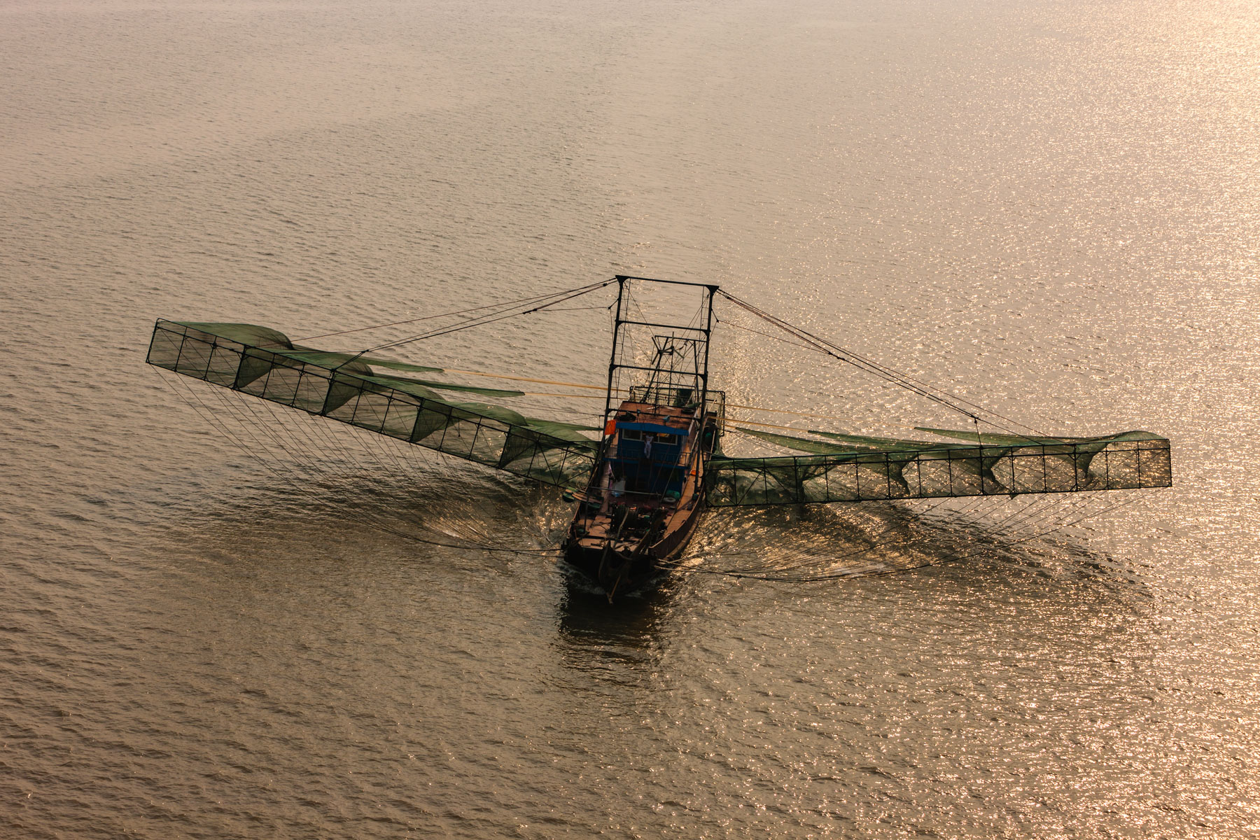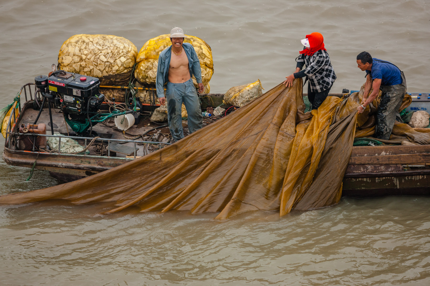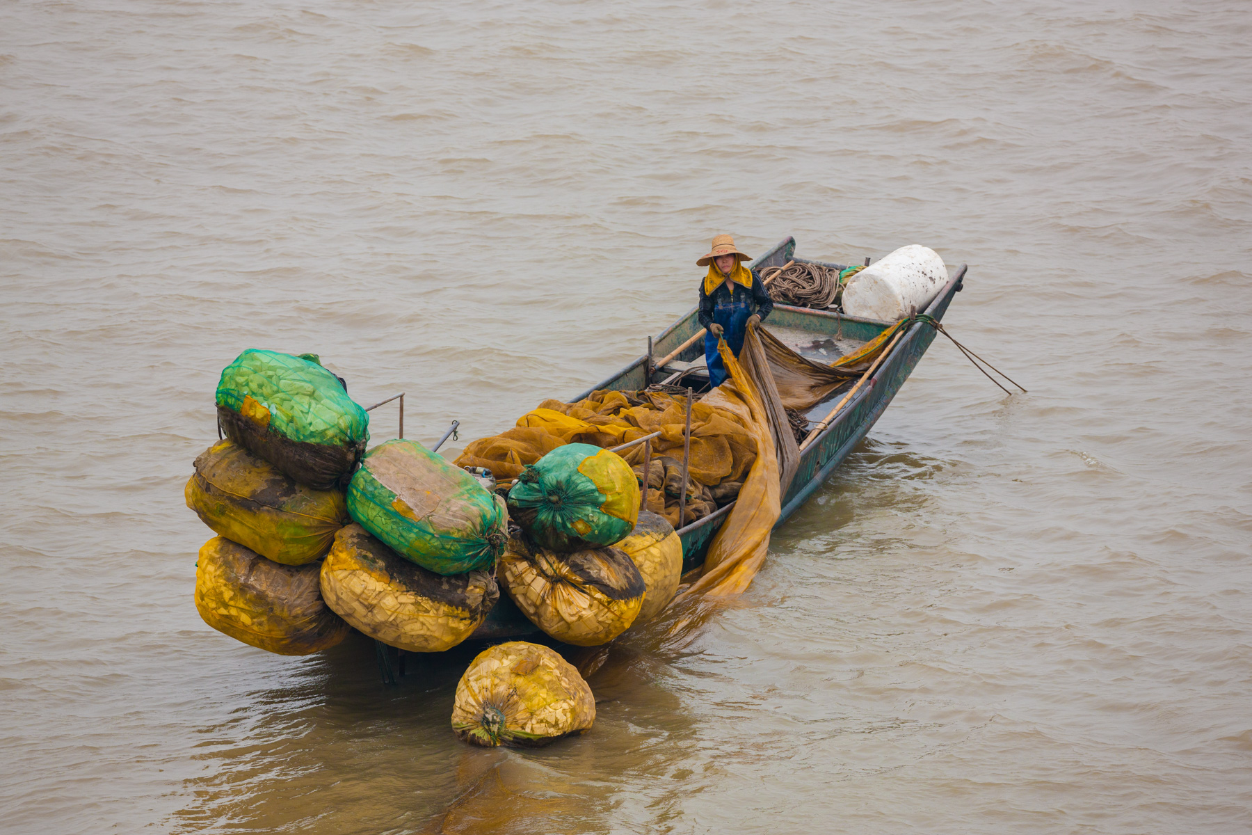 Bateau de pêche sur le Yangtsé au large de Shanghai, Chine (31°28' N - 121°27' E). Le fleuve Yangtsé est le plus grand fleuve de Chine, et son bassin compte pour 70 % de la pêche continentale du pays. Pour autant, depuis 2002 la pêche est régulièrement interdite sur l’ensemble du fleuve chaque année pour des périodes plus ou moins longues afin de permettre la reconstitution des stocks de poissons, notamment pendant la période de reproduction. Beaucoup d’espèces sont au bord de l’extinction et pourrait connaître le sort du dauphin de Chine (Lipotes vexillifer), un cétacé d’eau douce endémique du Yangtsé. Ce dernier a été déclaré éteint en 2007. Le marsouin du Yangtsé, un autre cétacé d’eau douce est lui en sursis. La pêche et l’aquaculture jouent un rôle de plus en plus important dans l’alimentation des hommes. Ainsi, à l’échelle de la planète, la consommation de poissons est passée de 10 kg par an et par personne dans les années 1960 à 19 kg par an et par personne en 2012, selon l’Organisation des Nations-unies pour l’alimentation et l’agriculture (FAO). Cela représente 17 % des apports protéiniques mondiaux. On estime que 60 millions de personnes travail dans le domaine de la pêche et de l’aquaculture dont 84 % en Asie. Les tonnages pêchés, de l’ordre de 80 millions de tonnes par an, sont stables mais de nombreuses pêcheries sont surexploitées. Seule l’aquaculture progresse. La Chine représente à elle seule 60 % de la production de ce dernier secteur.