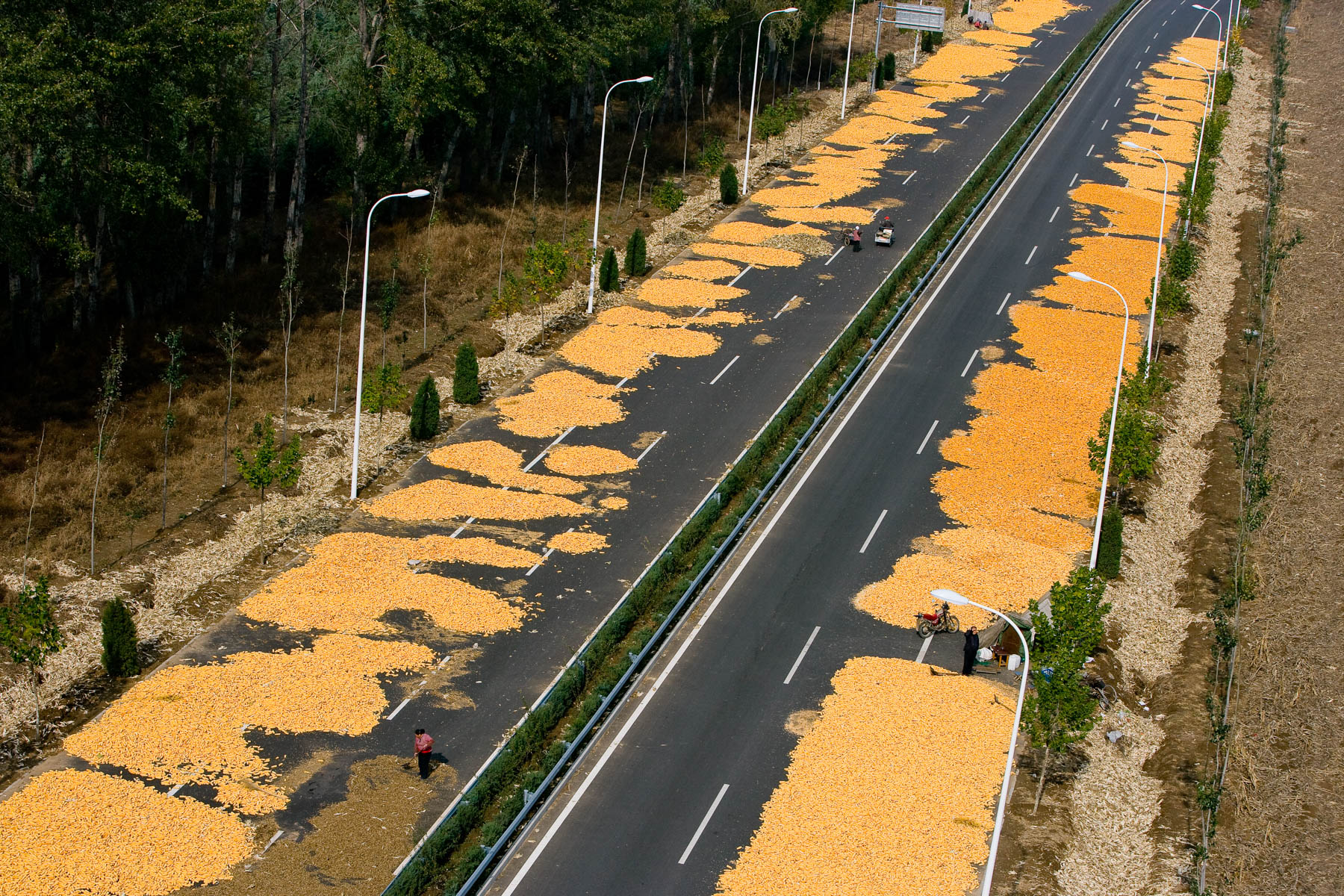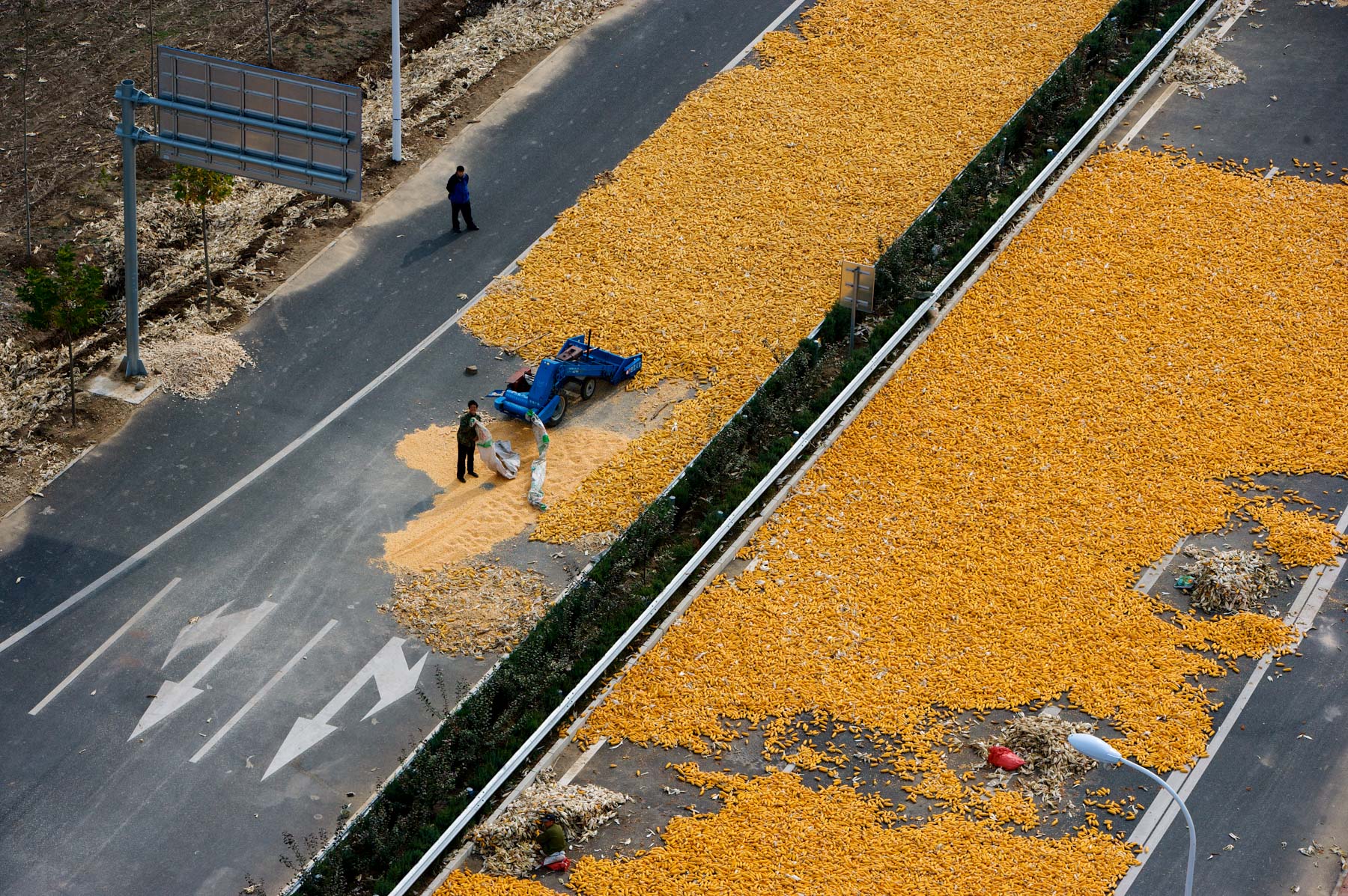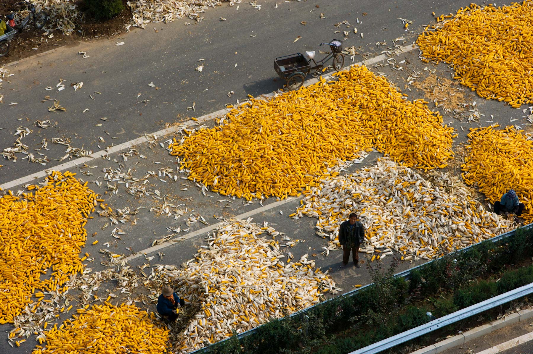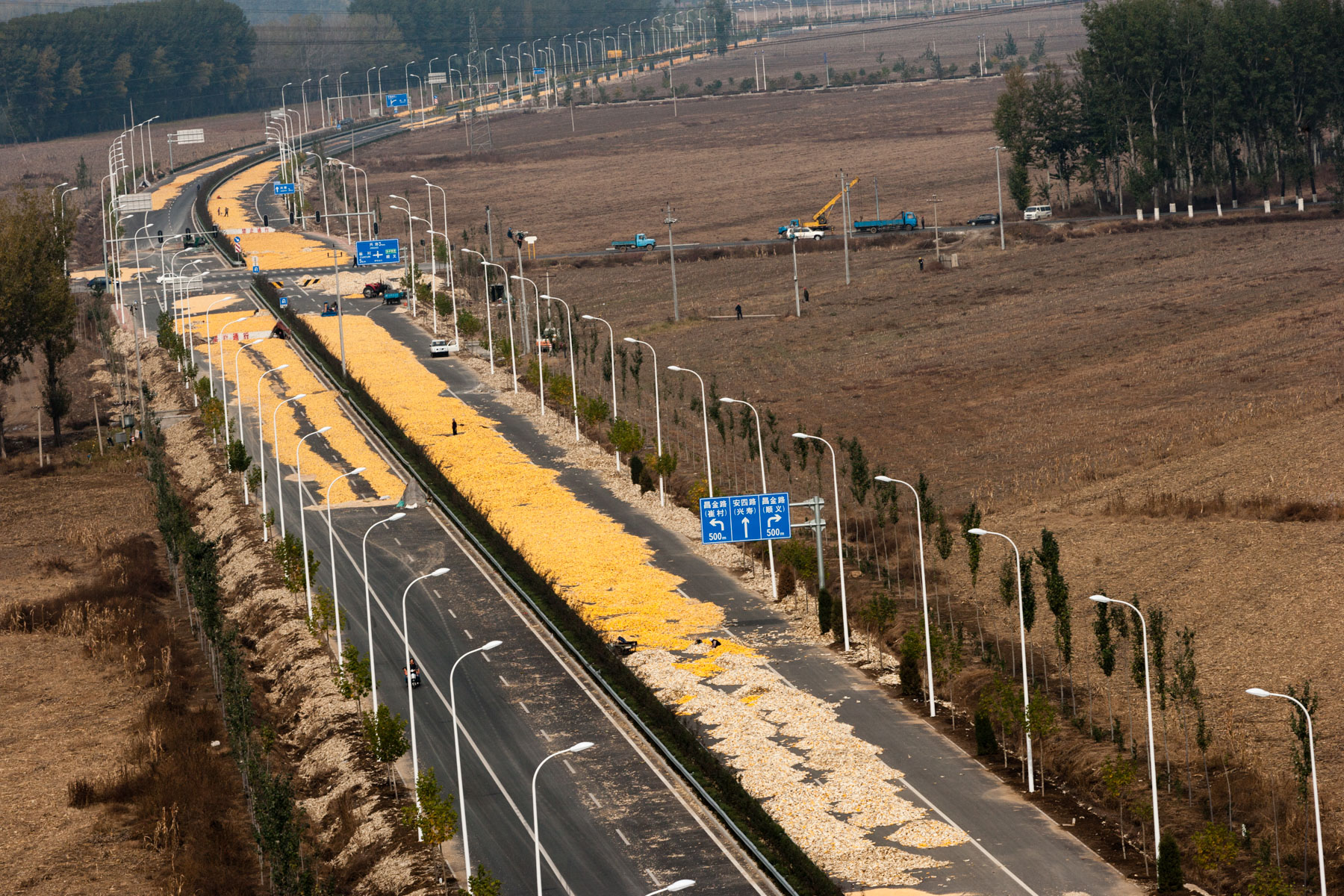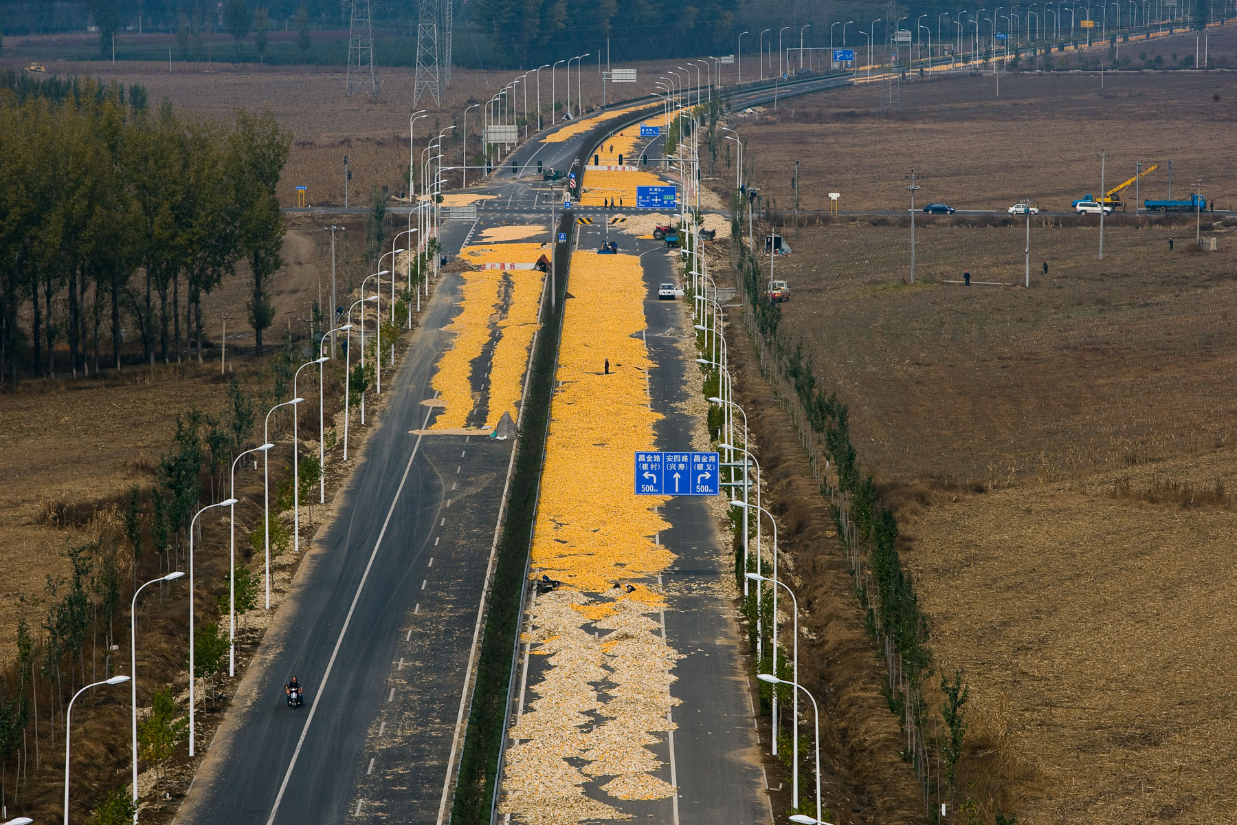 Drying corn on a highway near Cuicun, Beijing region, People’s Republic of China