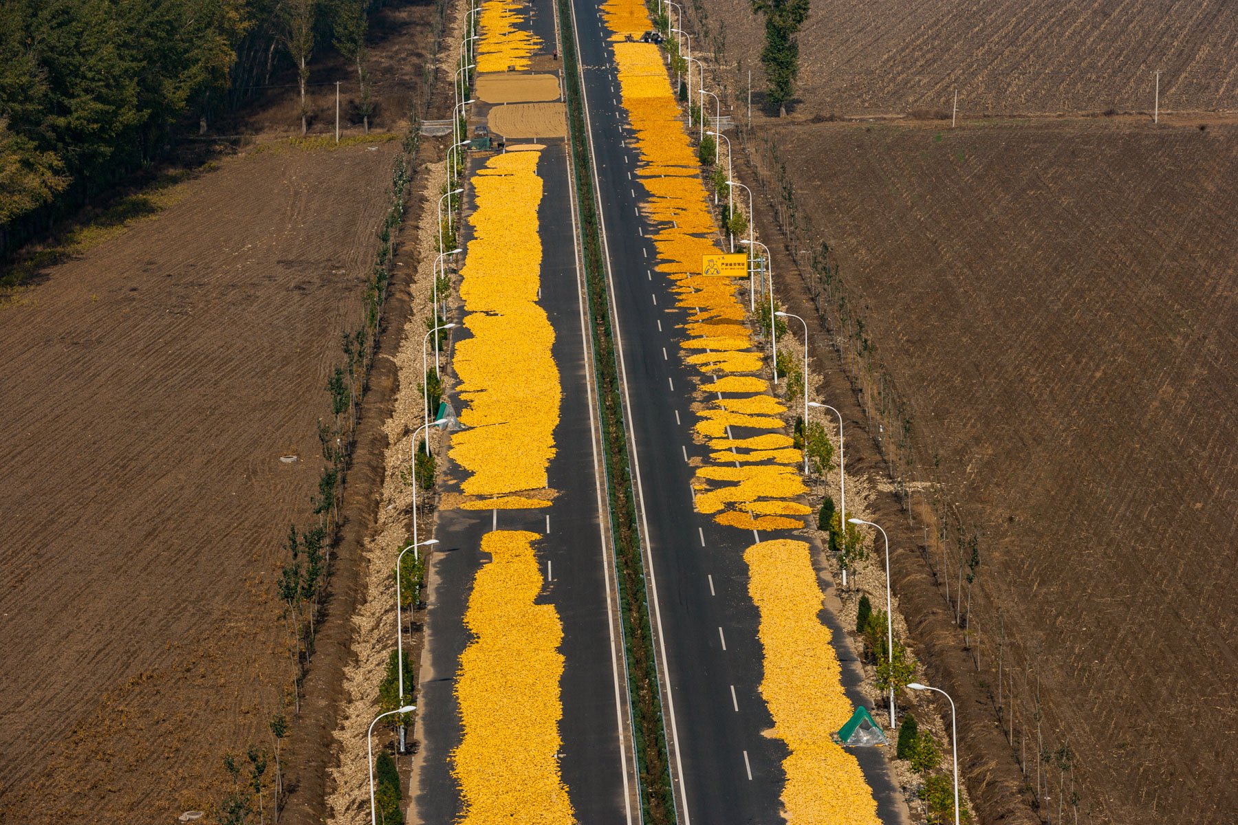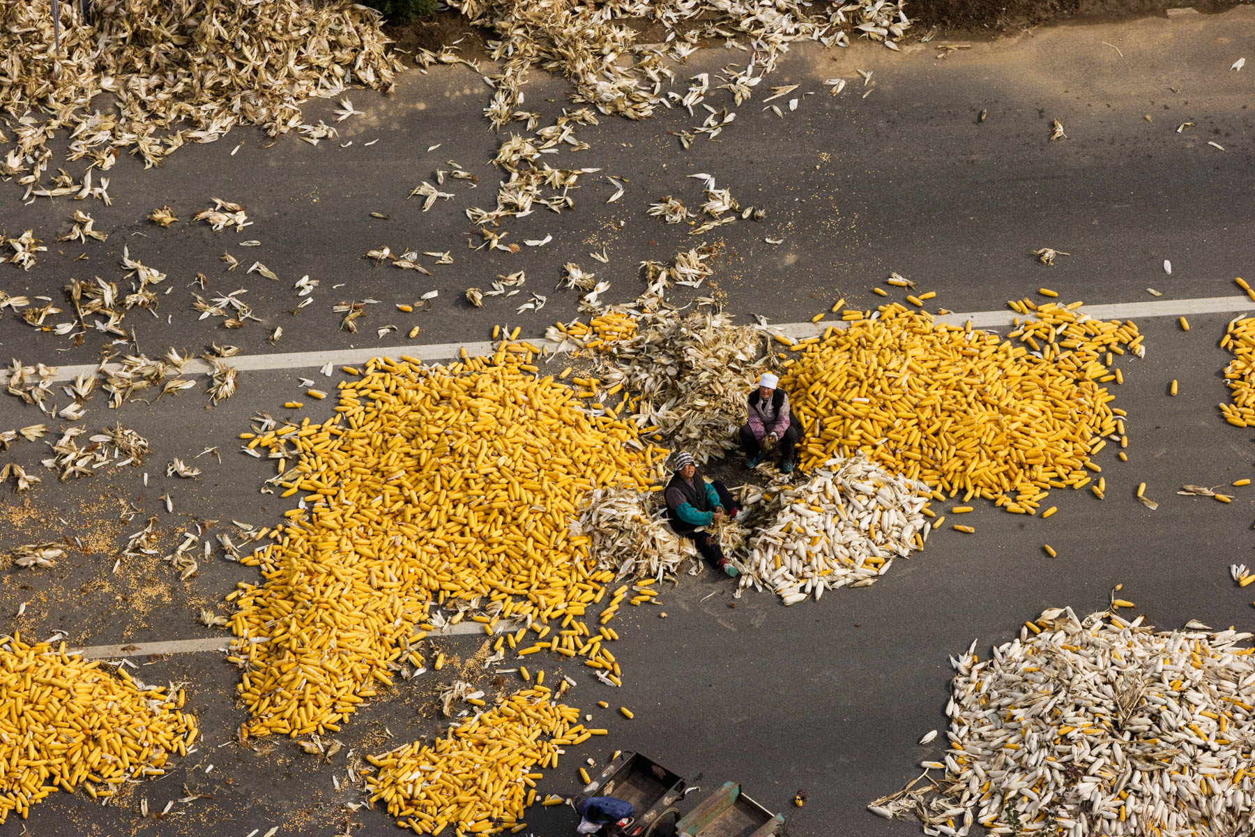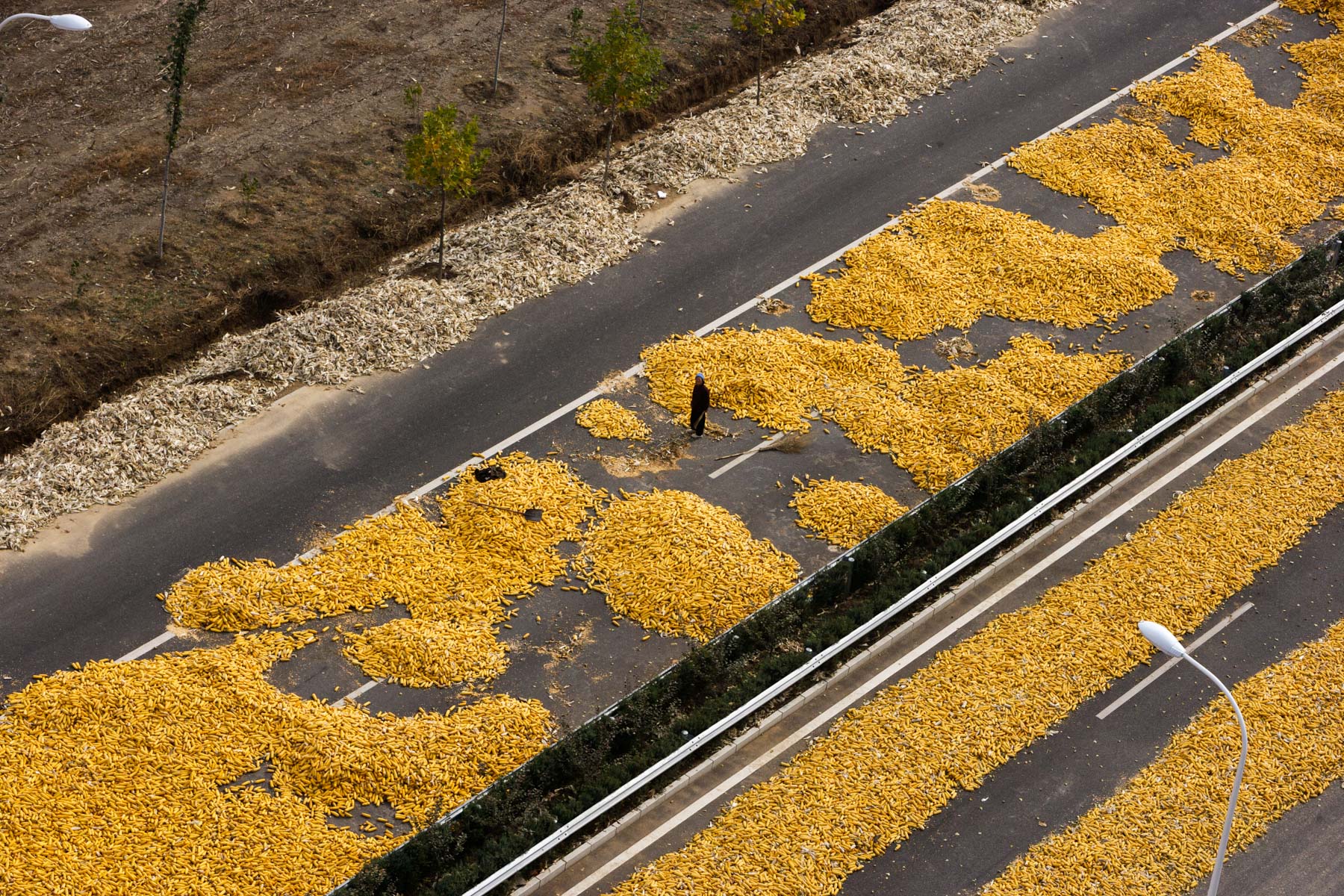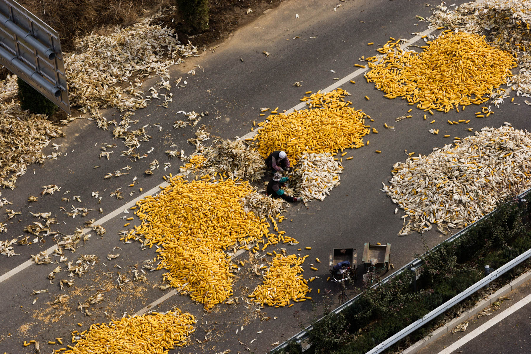 Drying corn on a highway near Cuicun, Beijing region, People’s Republic of China