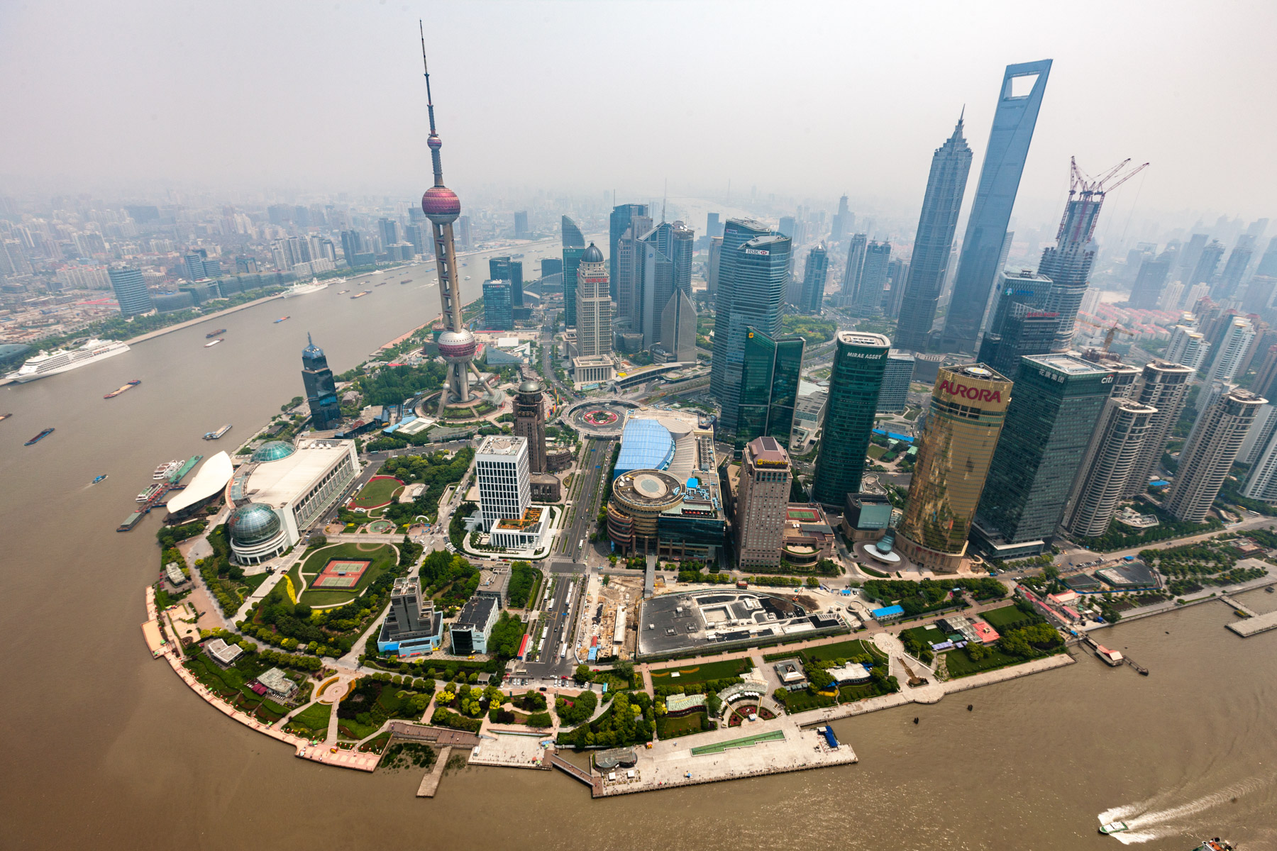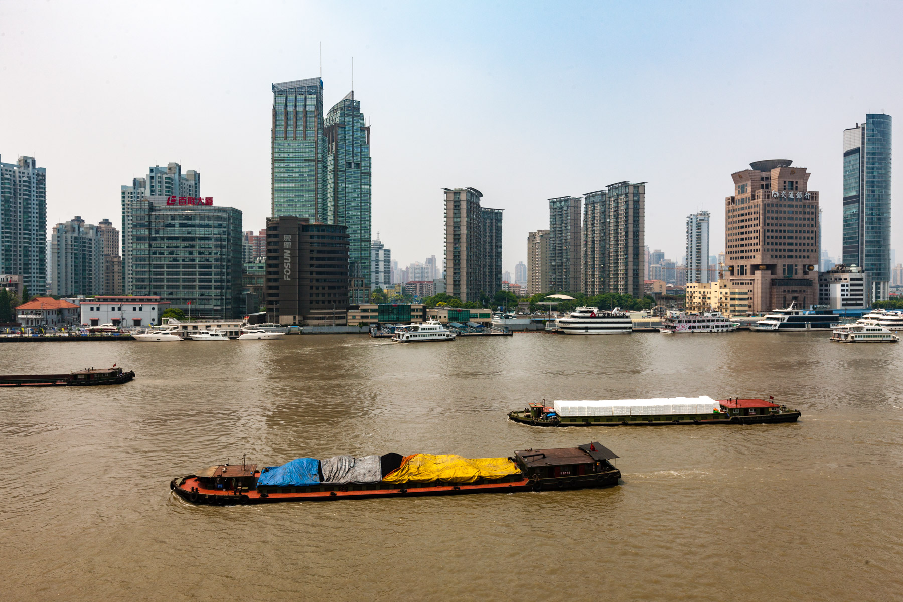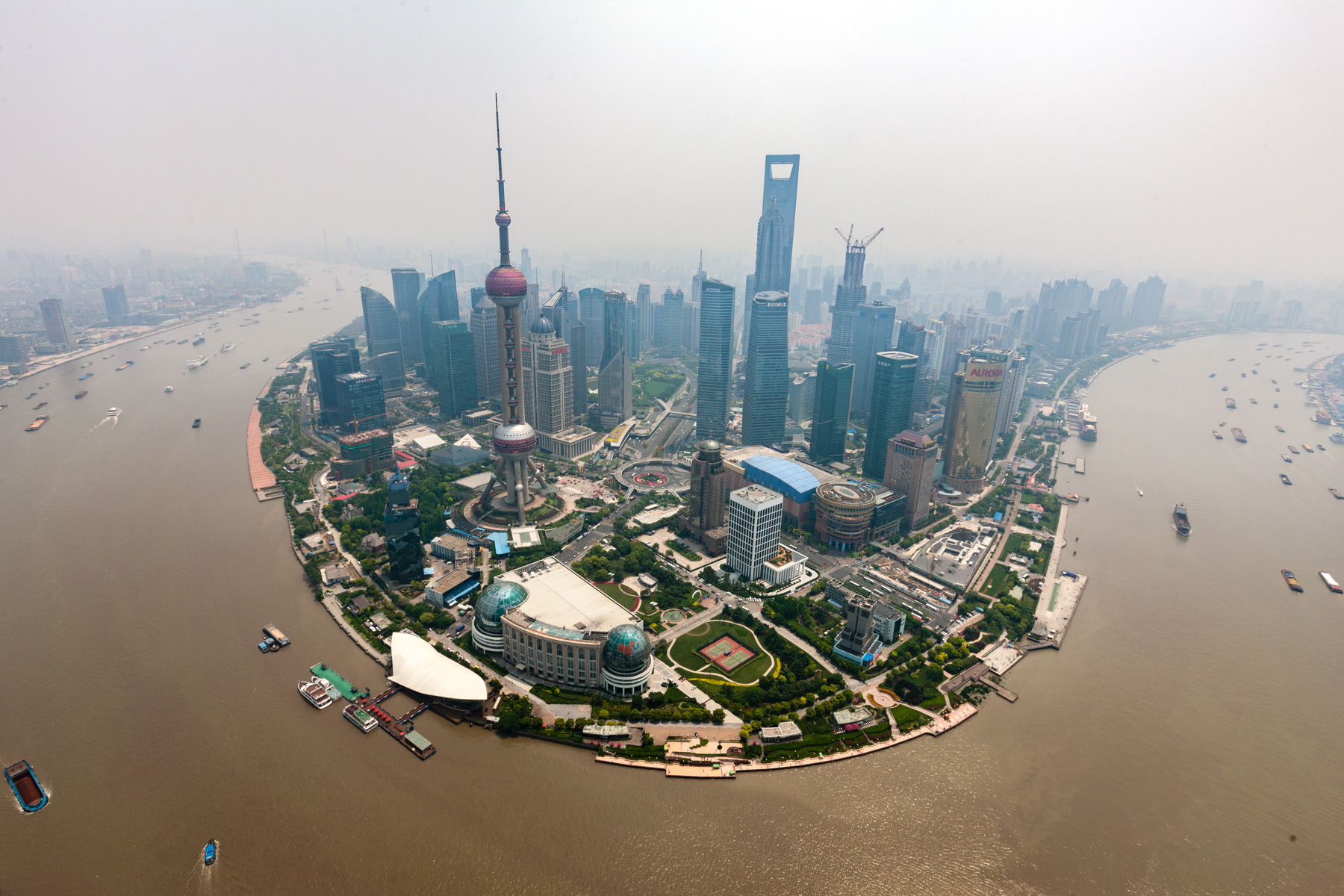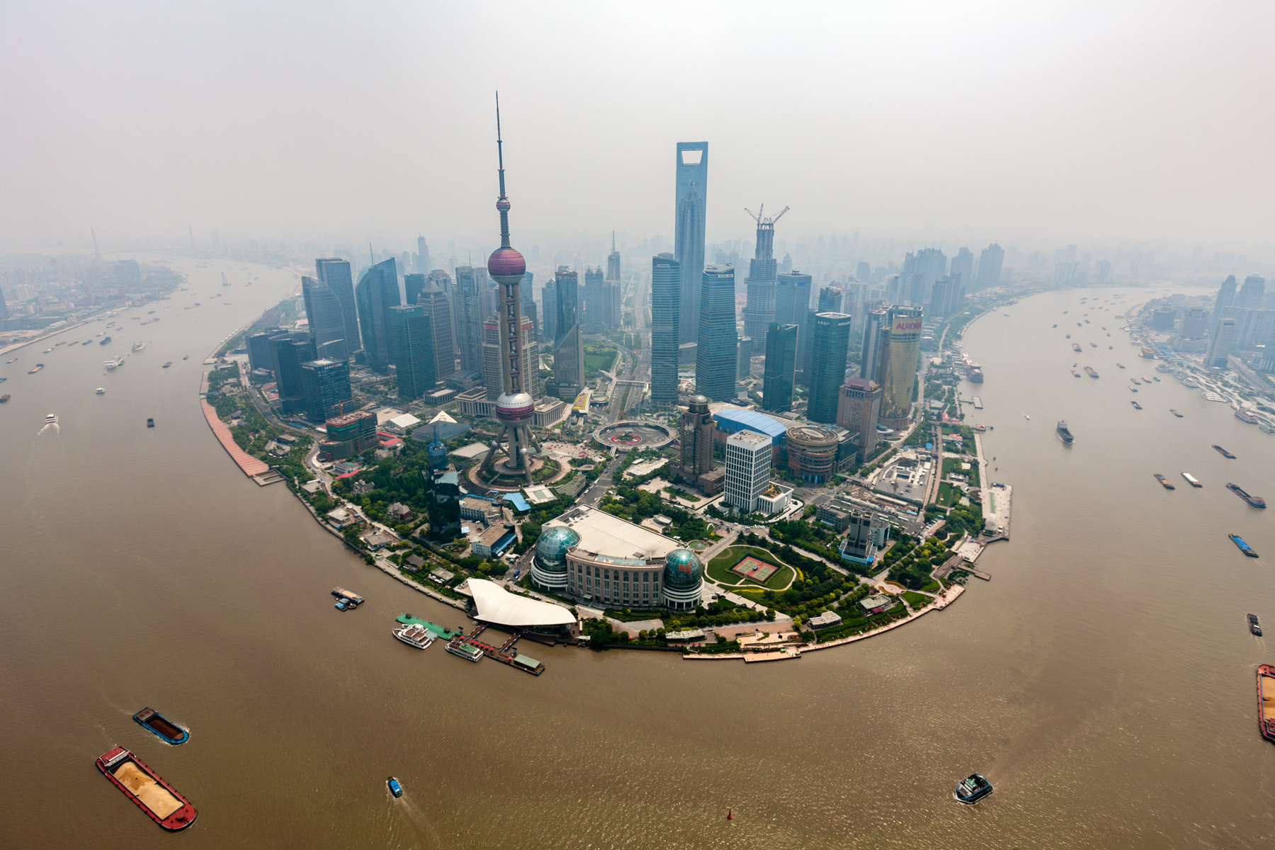 Quartier d’affaires de Pudong et le fleuve Huangpu, Shanghai, République populaire de Chine (31°14’ N – 121°30’ E).
