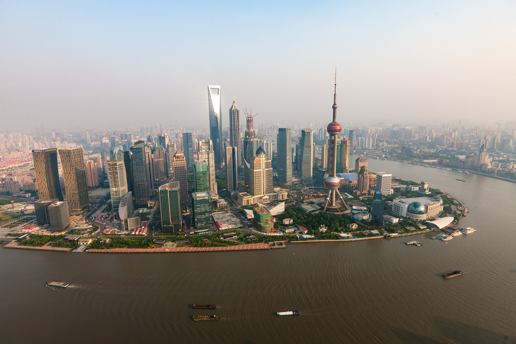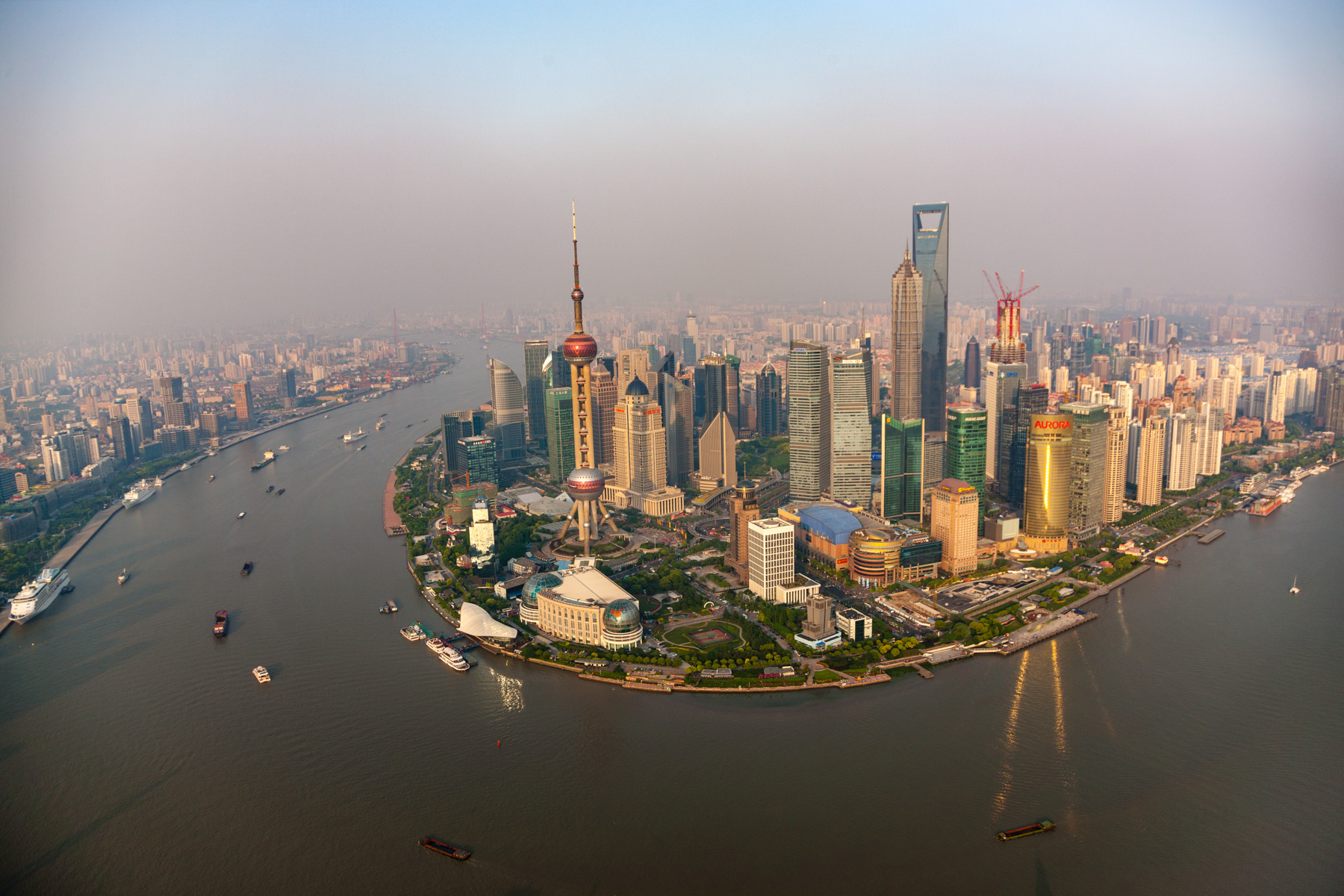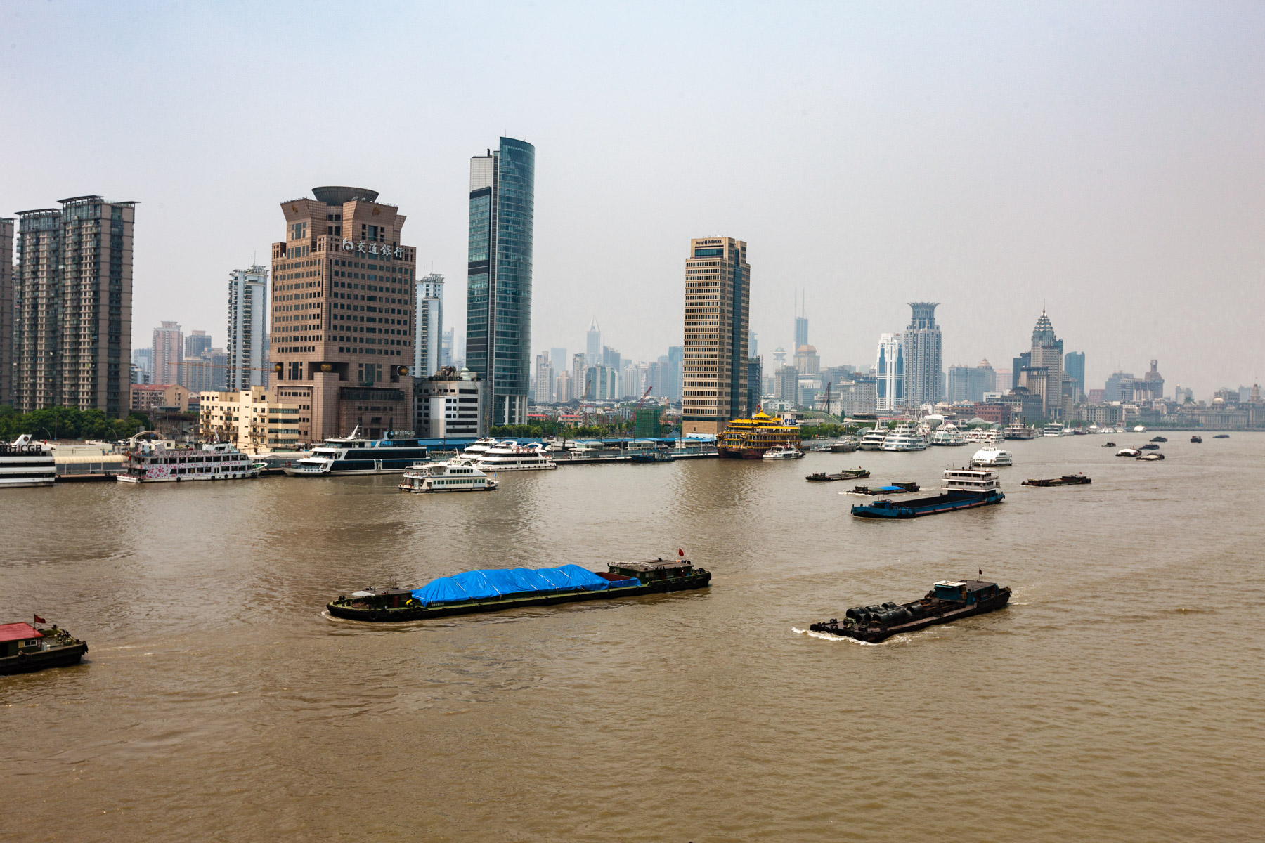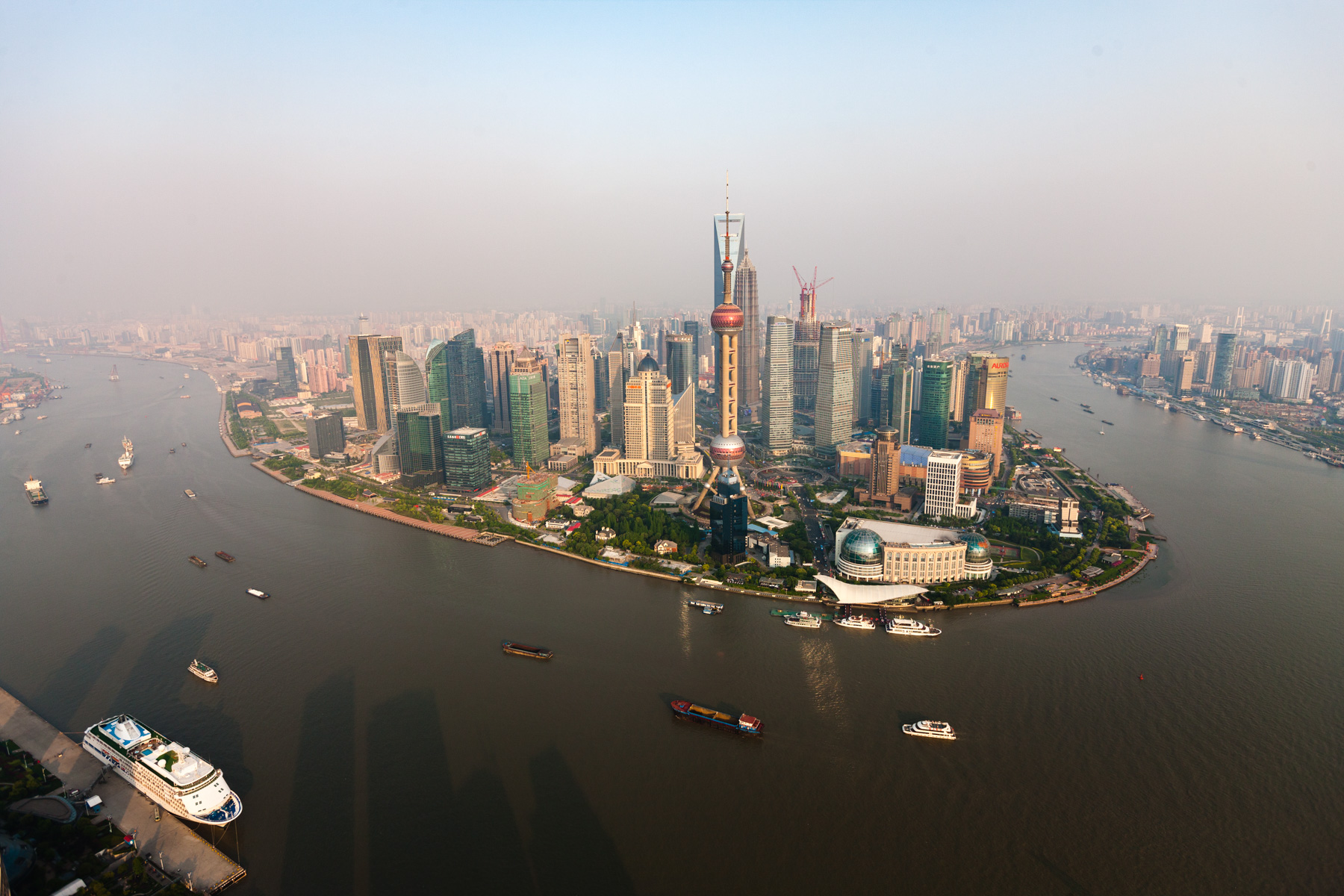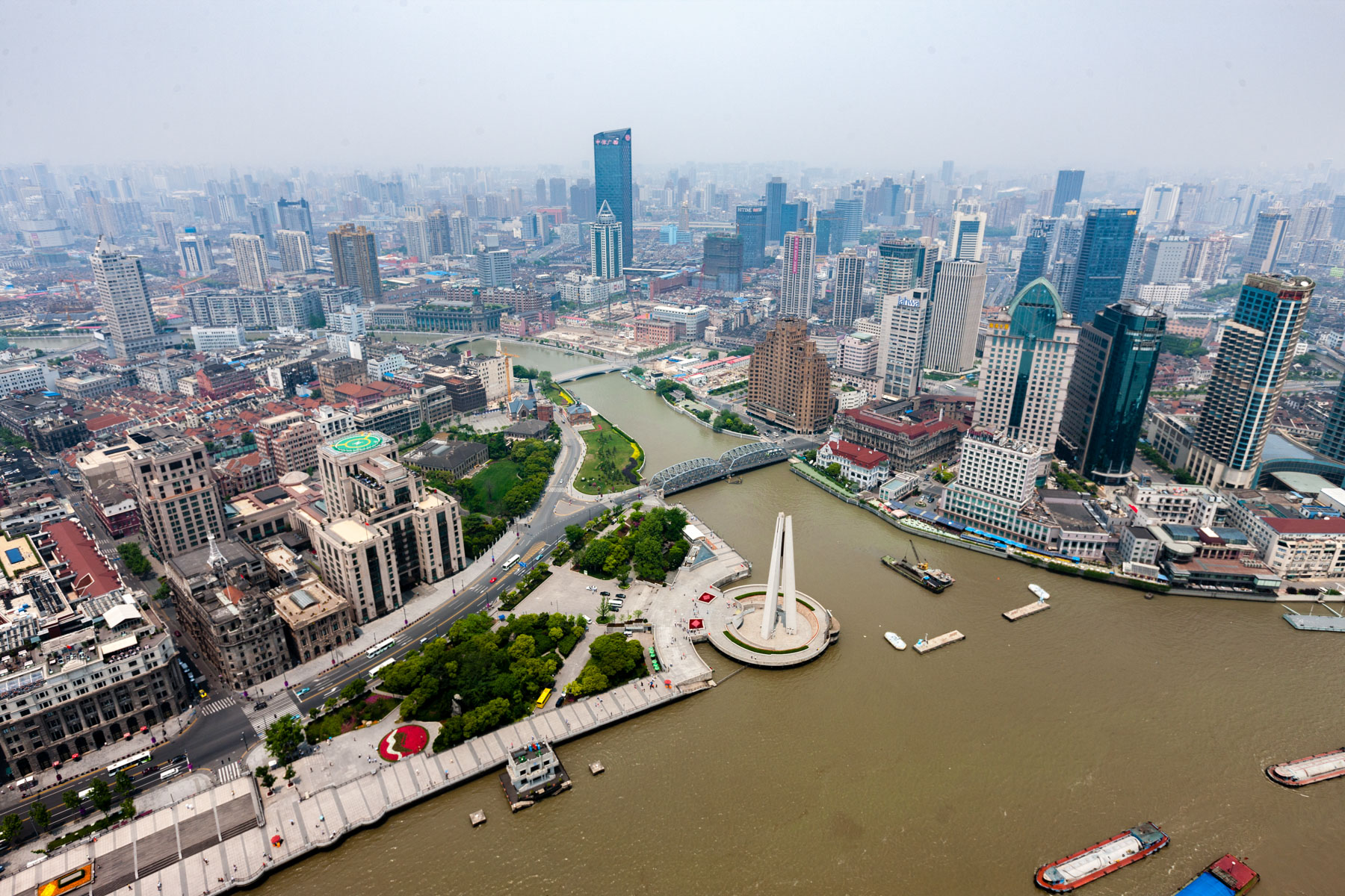 Quartier d’affaires de Pudong et le fleuve Huangpu, Shanghai, République populaire de Chine (31°14’ N – 121°30’ E).