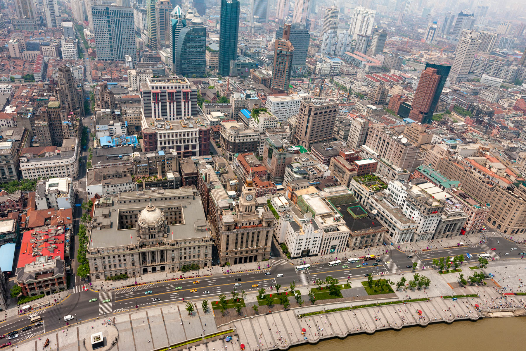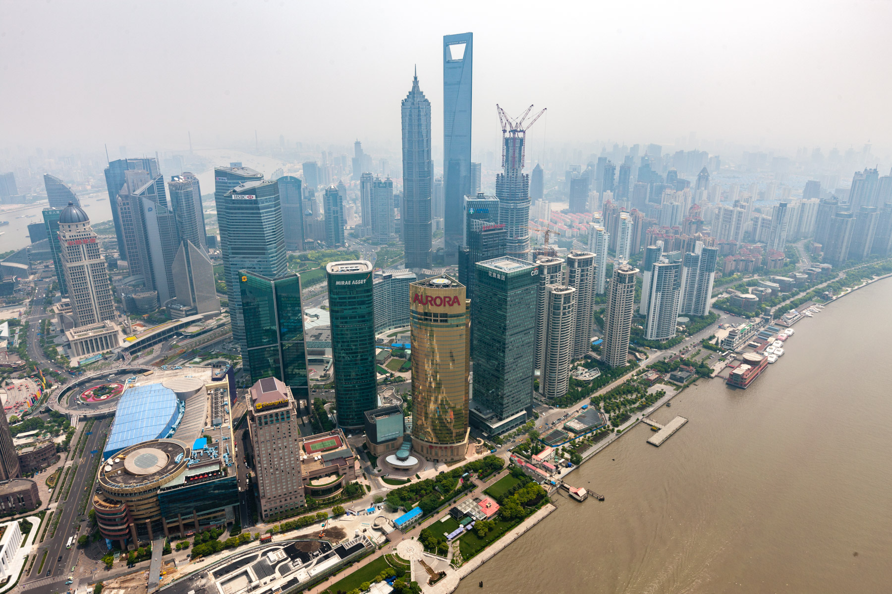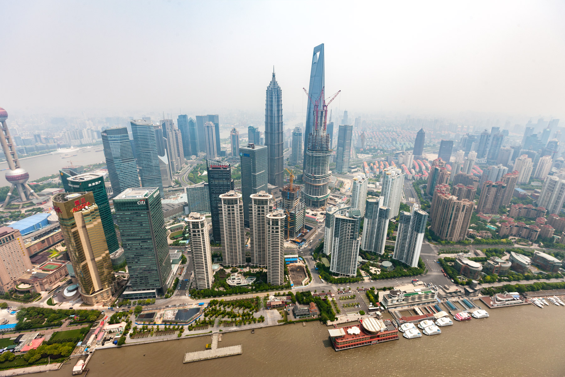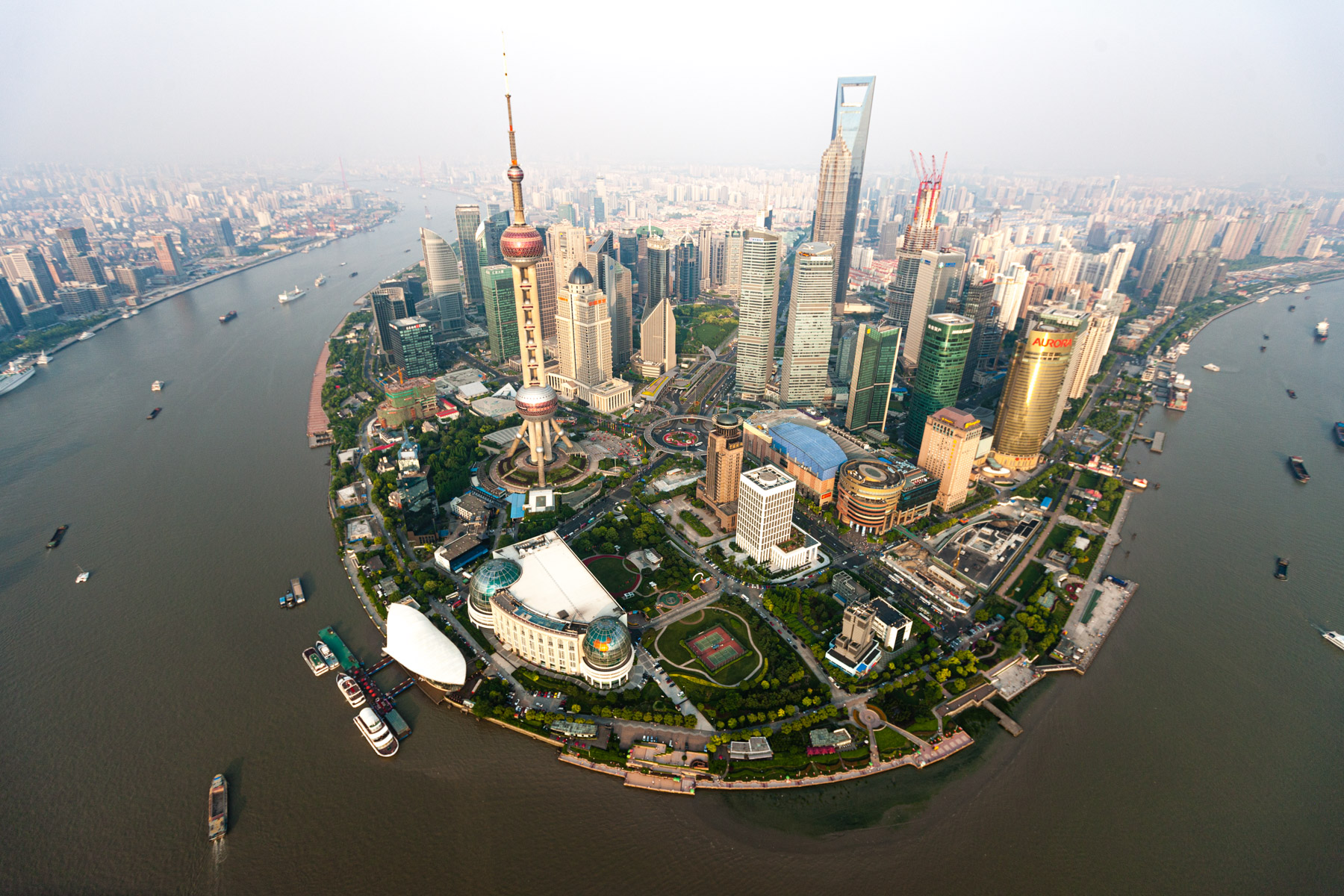 Quartier d’affaires de Pudong et le fleuve Huangpu, Shanghai, République populaire de Chine (31°14’ N – 121°30’ E).