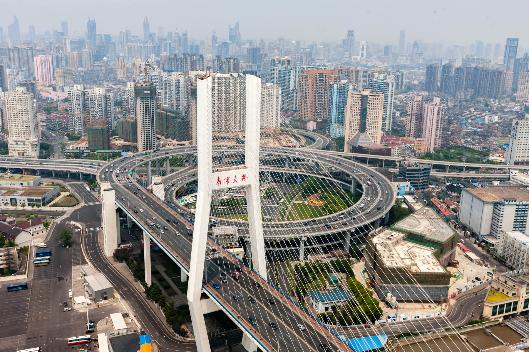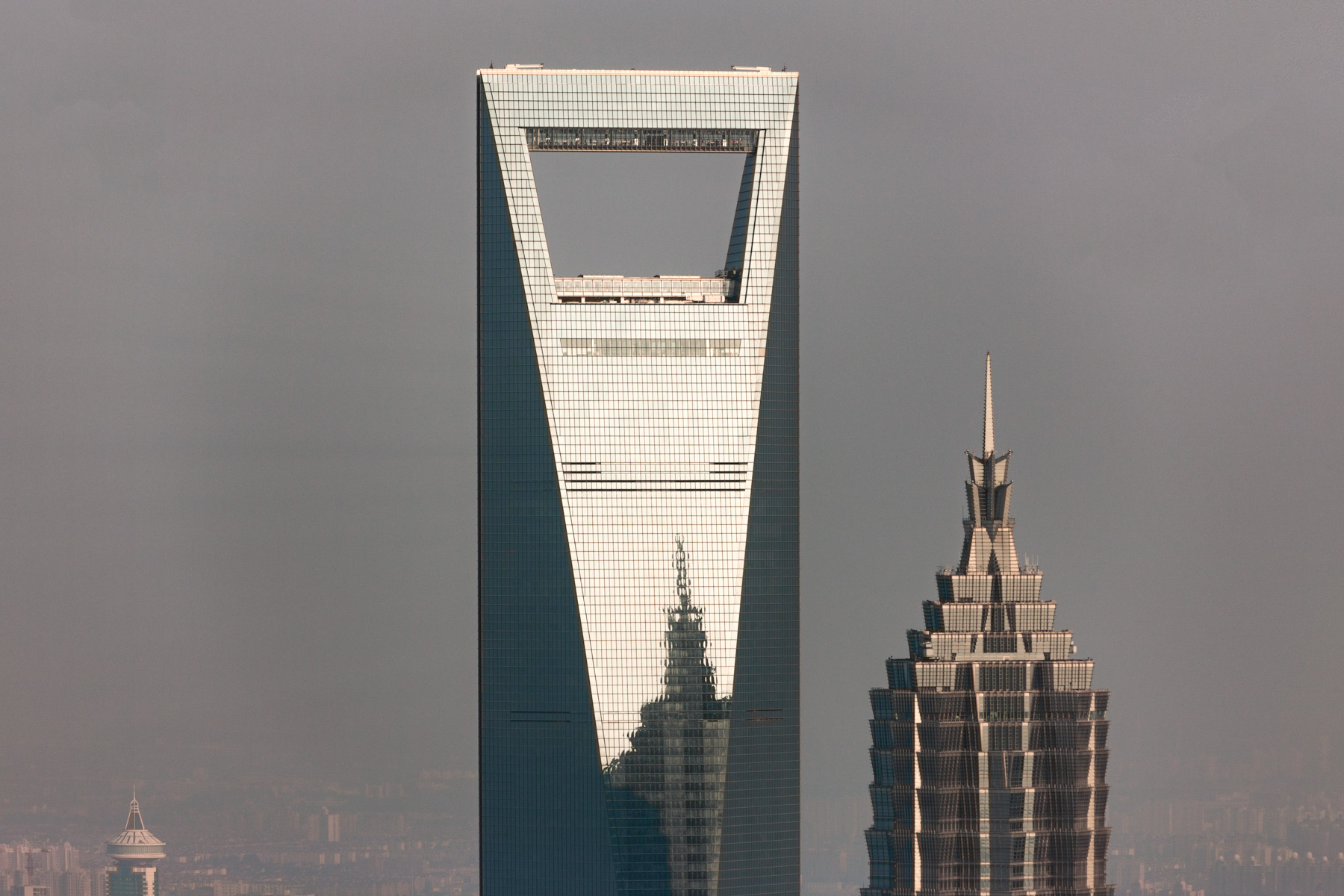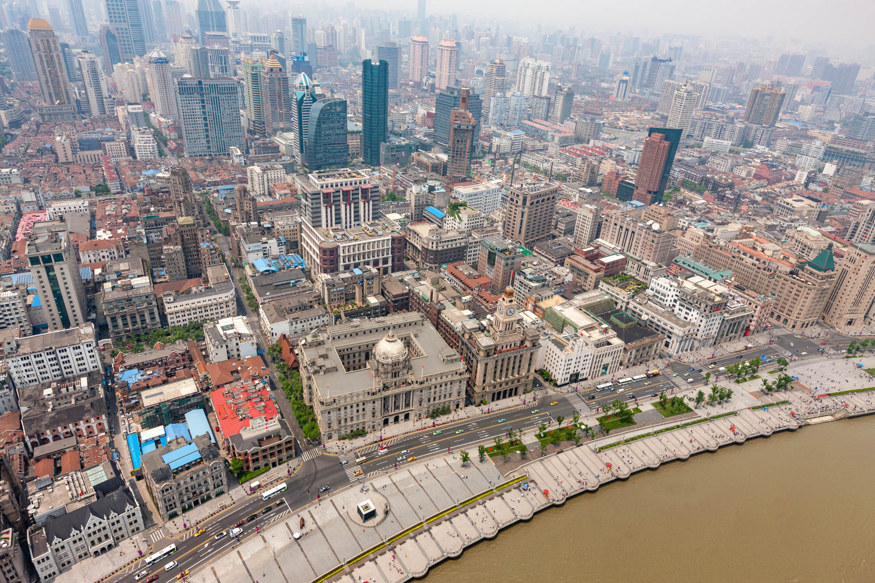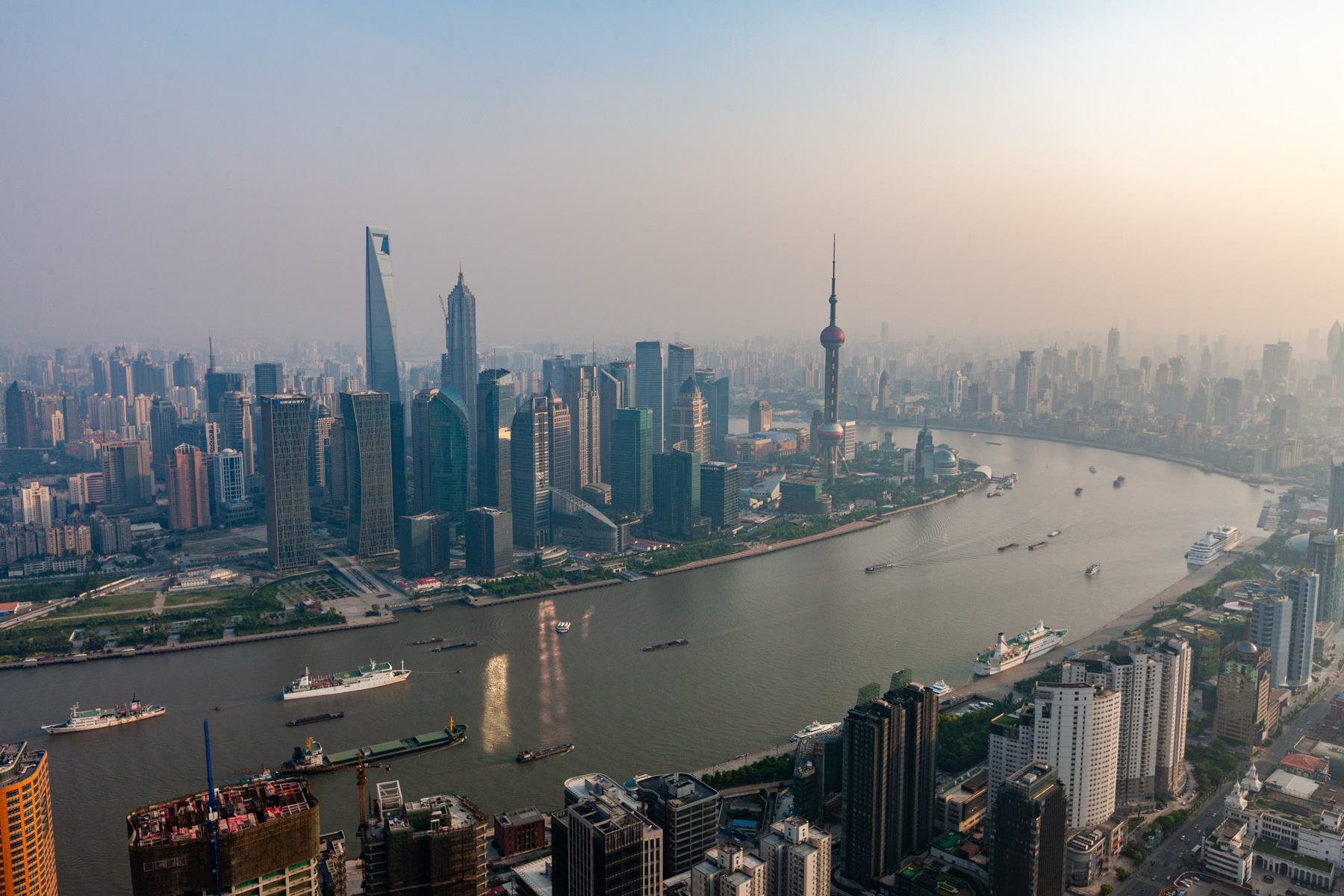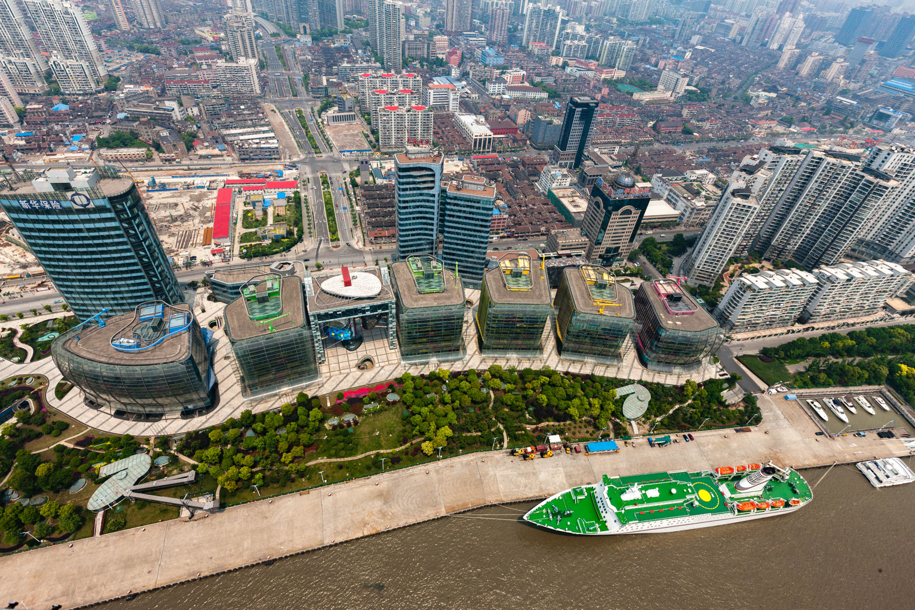 Quartier d’affaires de Pudong et le fleuve Huangpu, Shanghai, République populaire de Chine (31°14’ N – 121°30’ E).