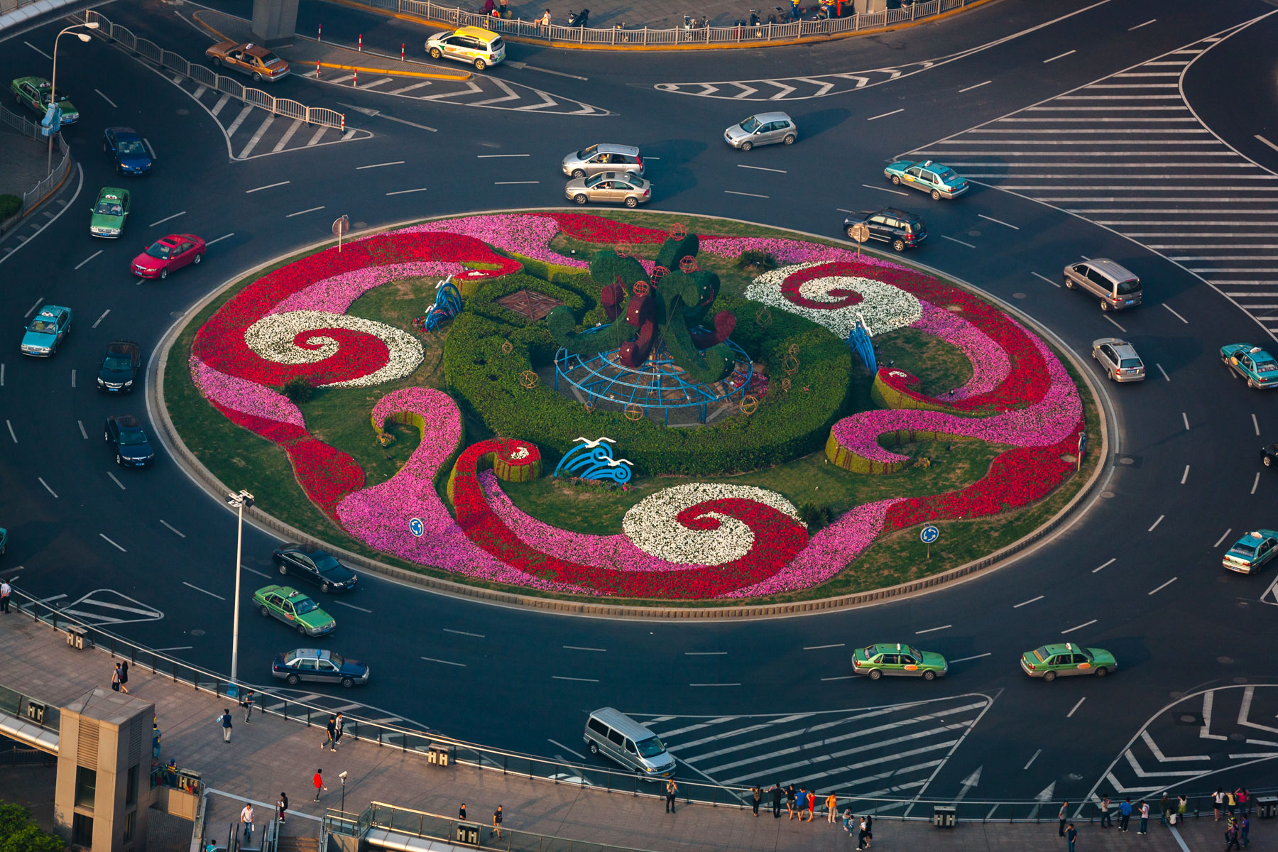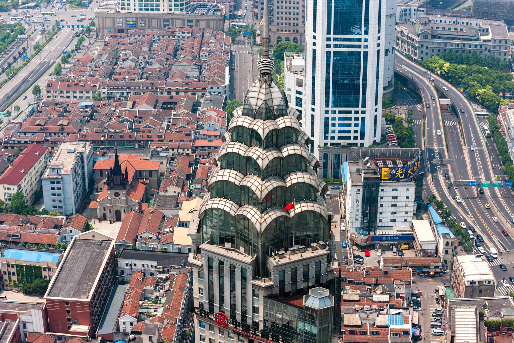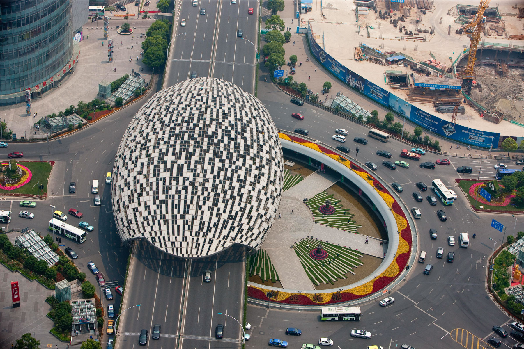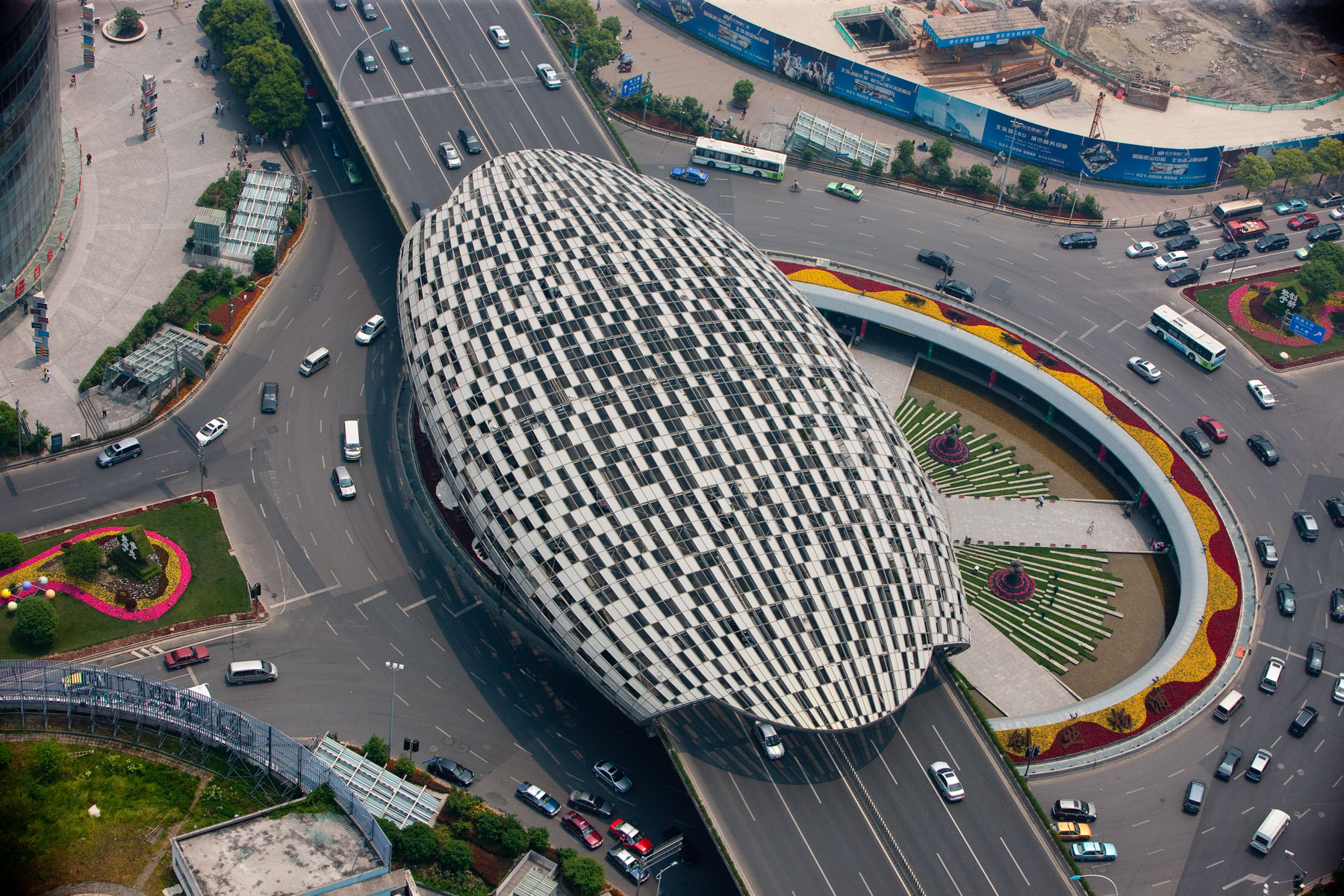 Quartier d’affaires de Pudong et le fleuve Huangpu, Shanghai, République populaire de Chine (31°14’ N – 121°30’ E).