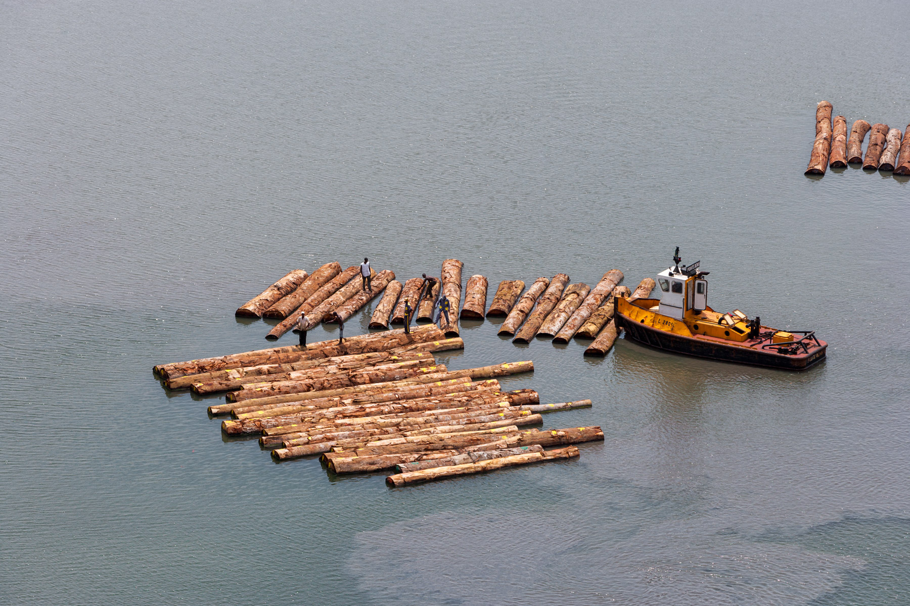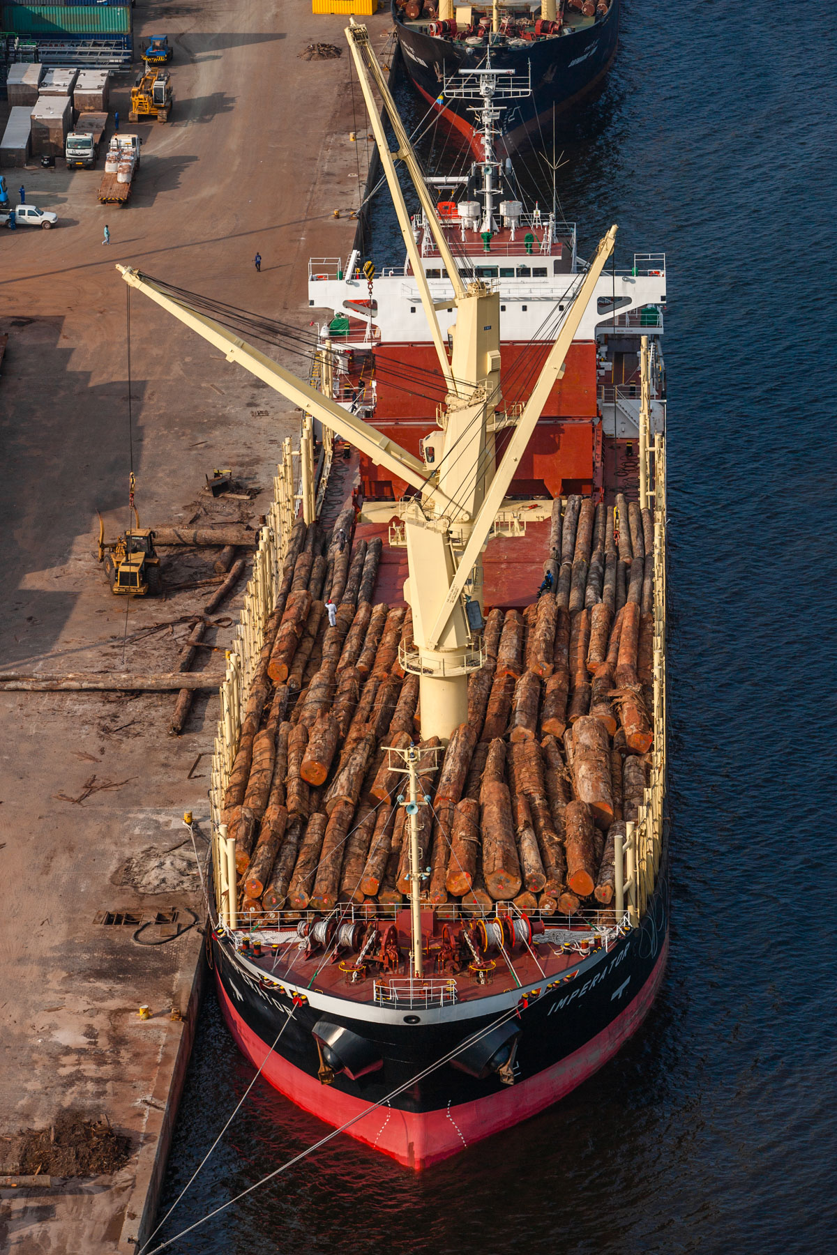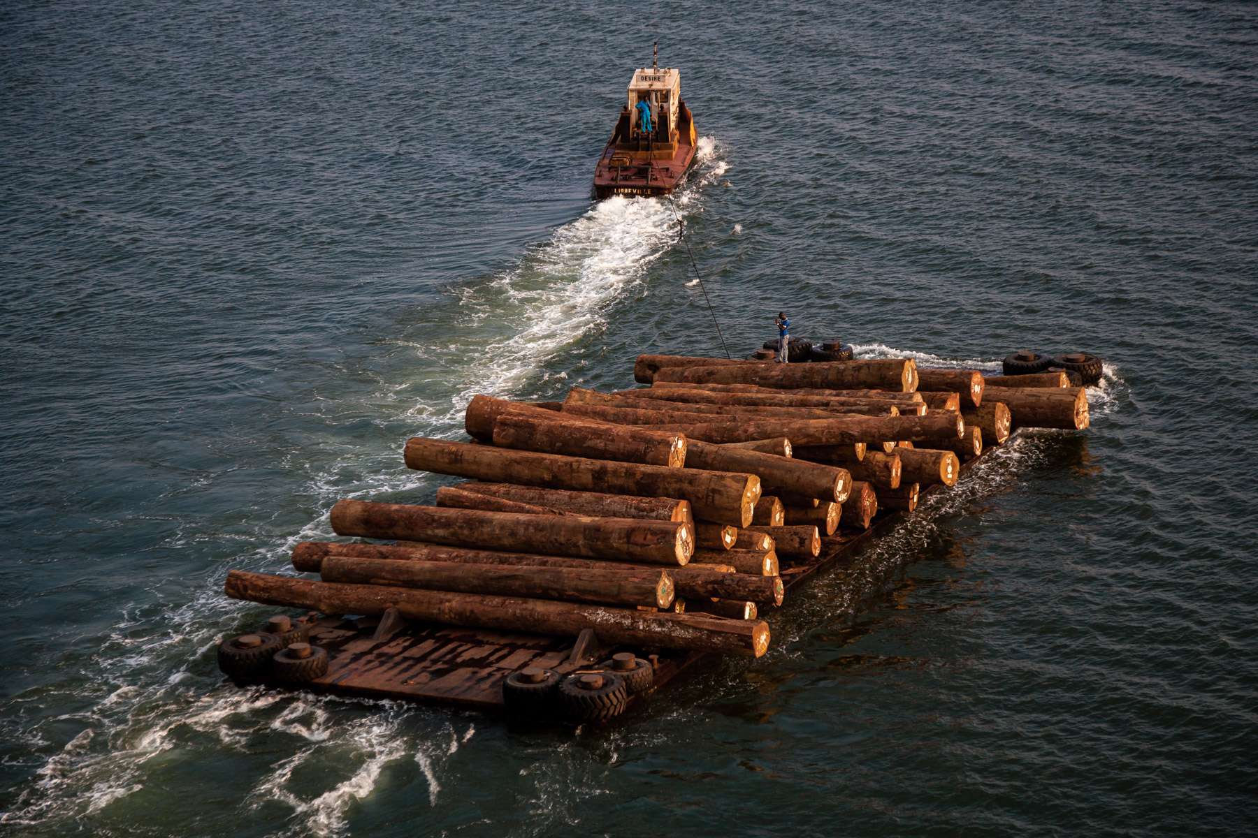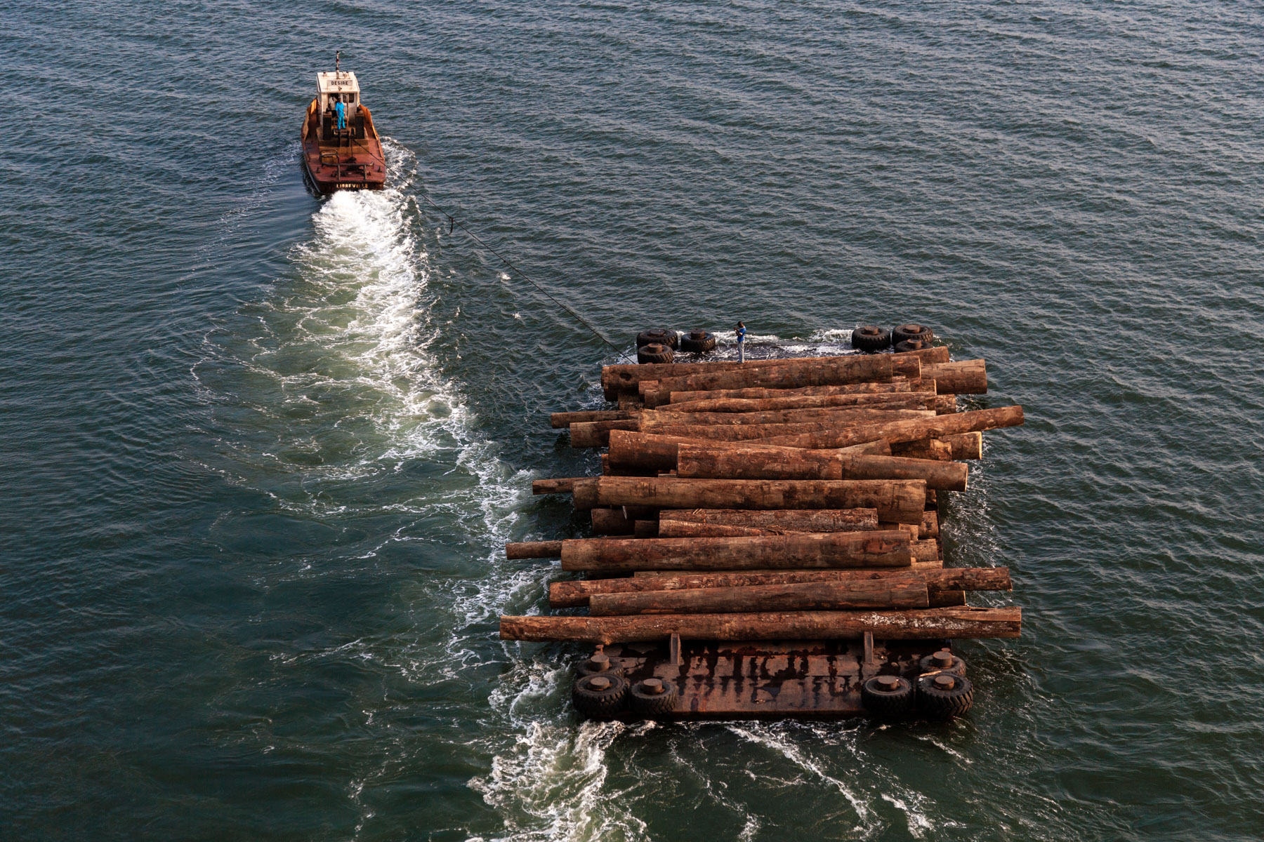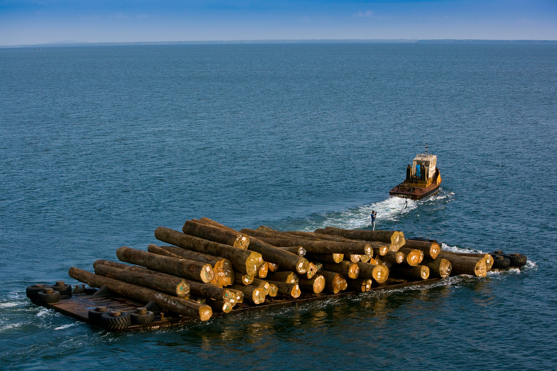 Transport du bois au large du port à bois d'Owendo, banlieue de Libreville, province de l’Estuaire (0°17'50.42"N -9°30'50.91"E)