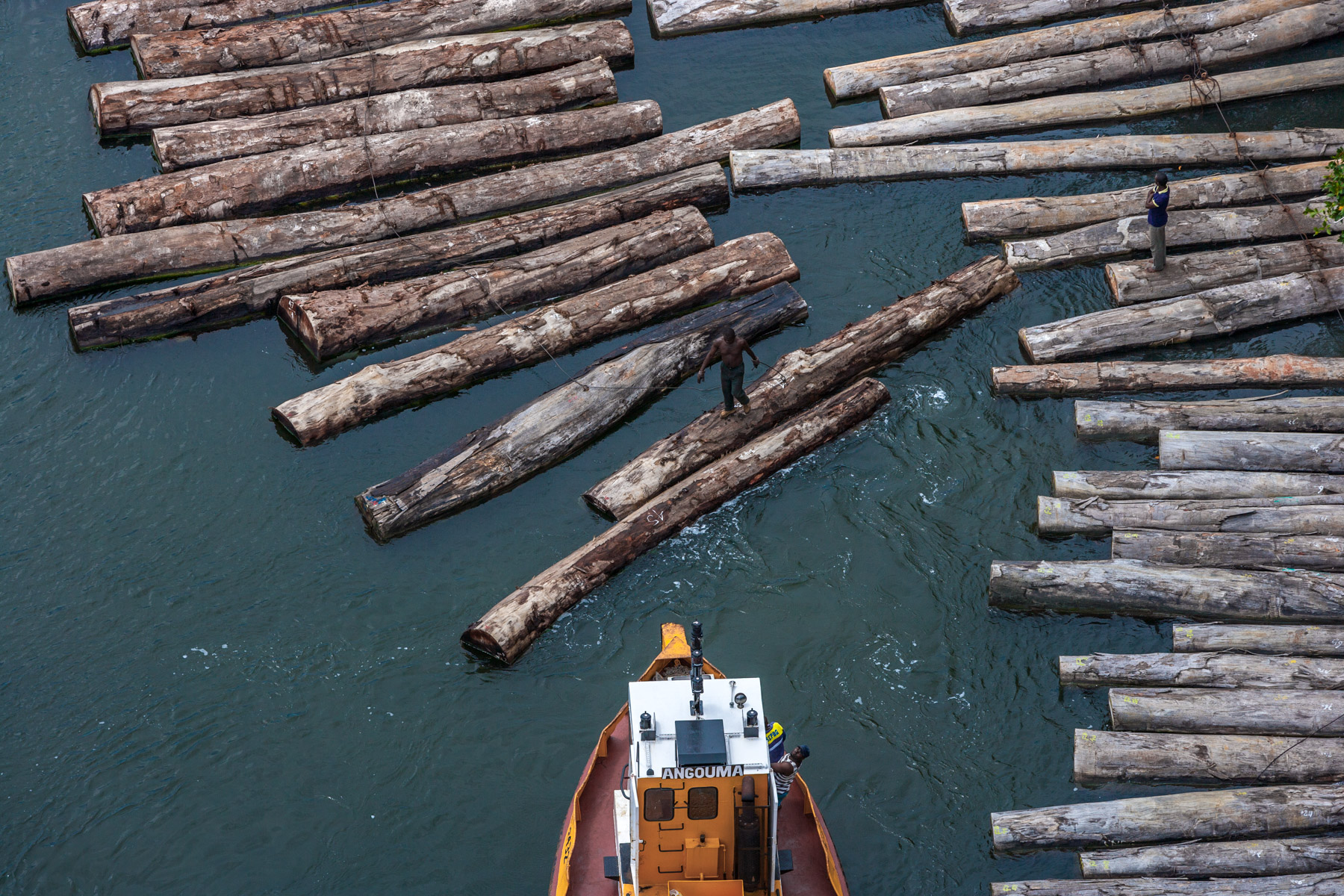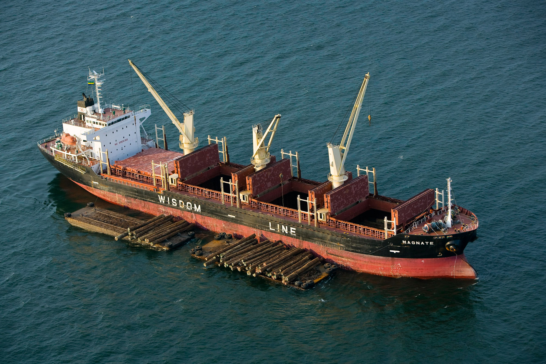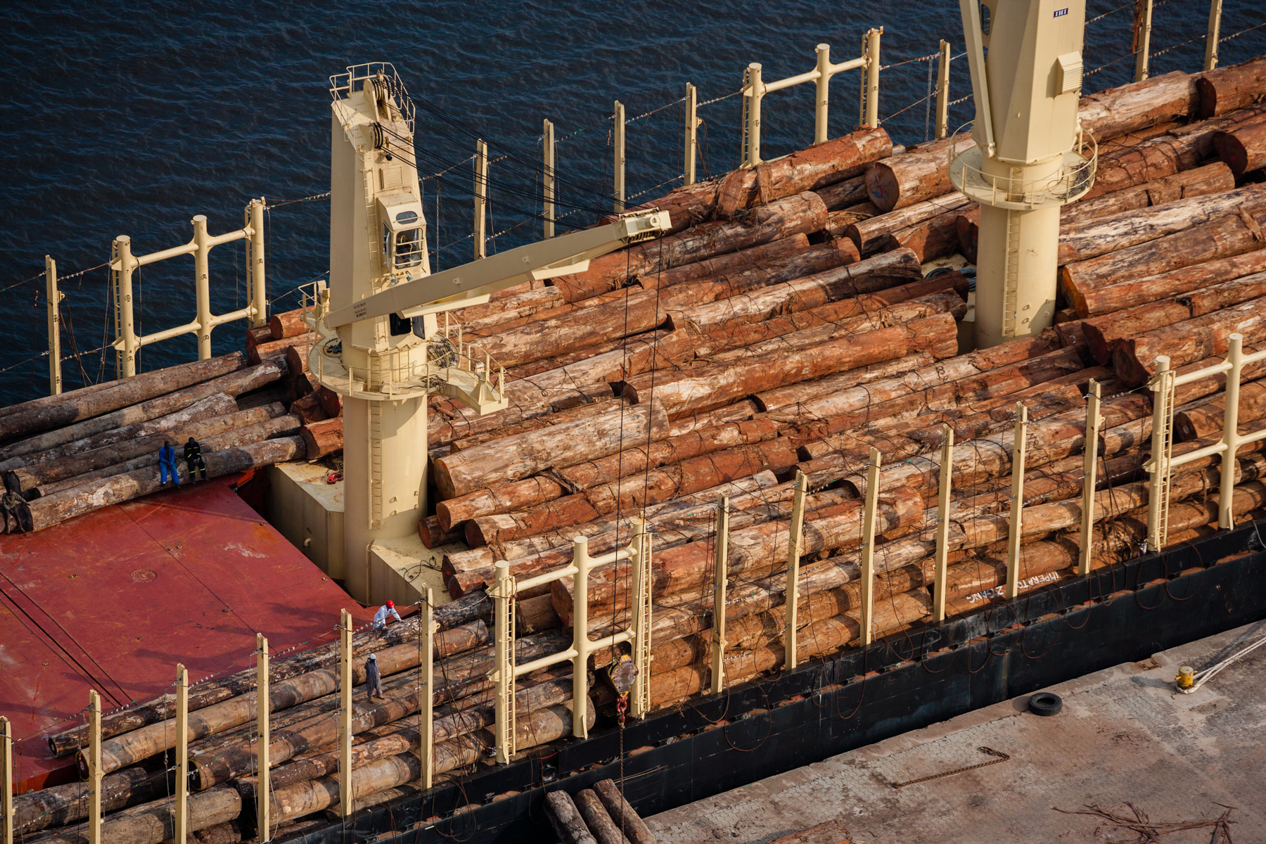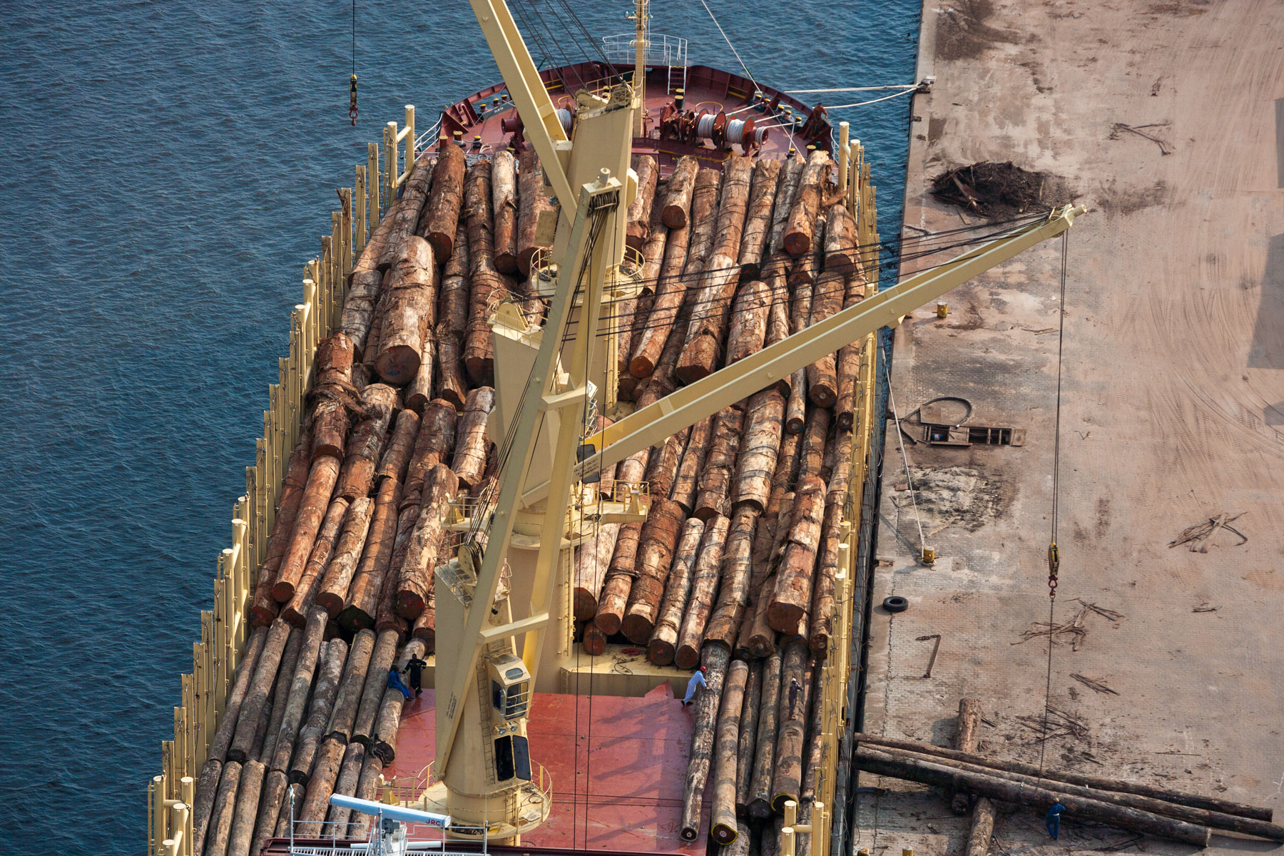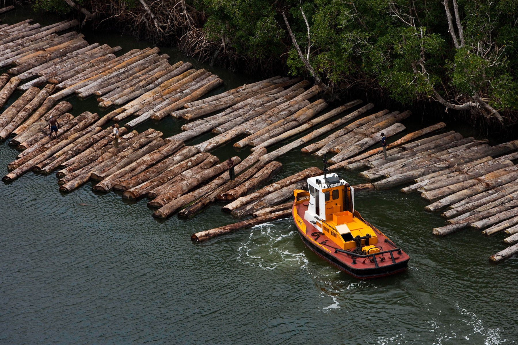 Transport du bois au large du port à bois d'Owendo, banlieue de Libreville, province de l’Estuaire (0°17'50.42"N -9°30'50.91"E)