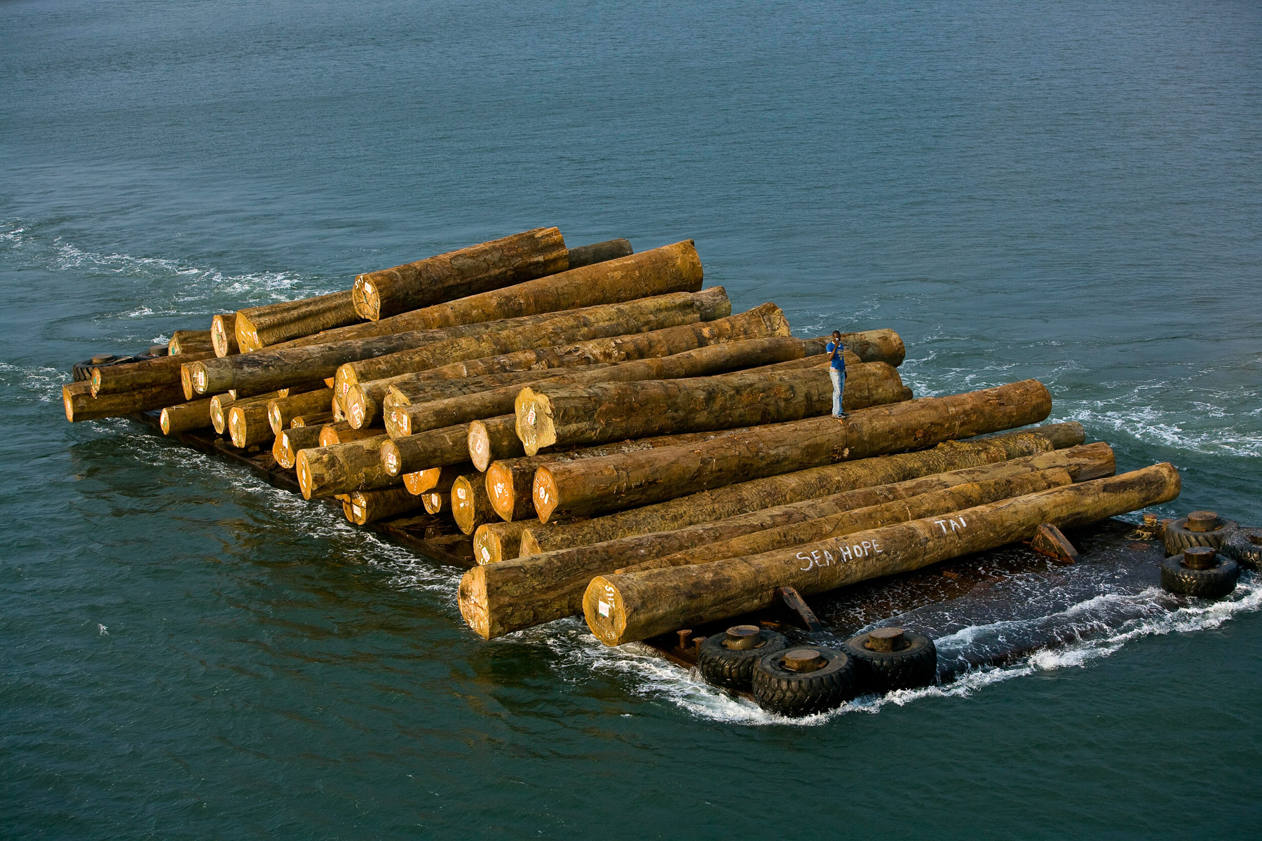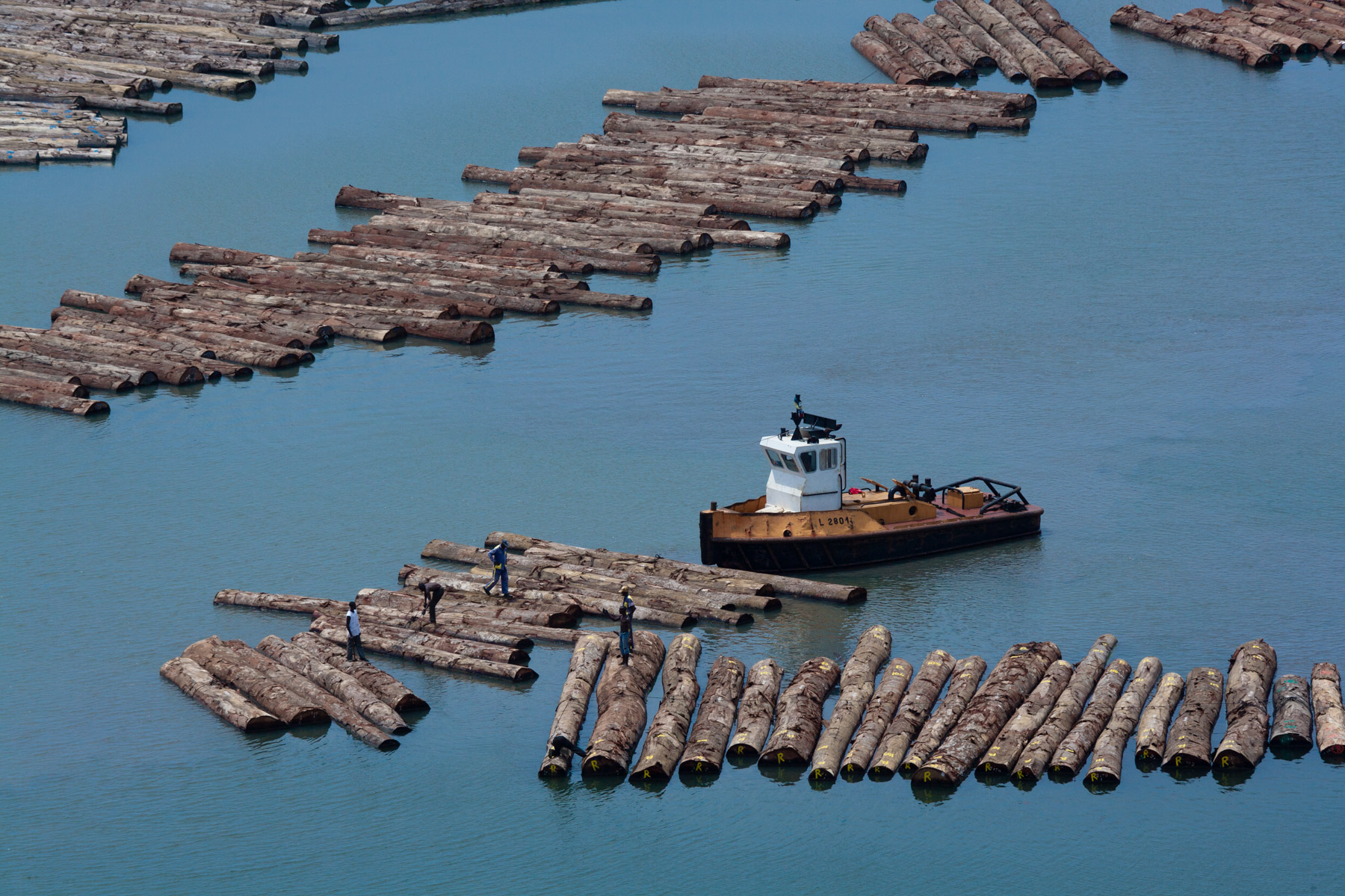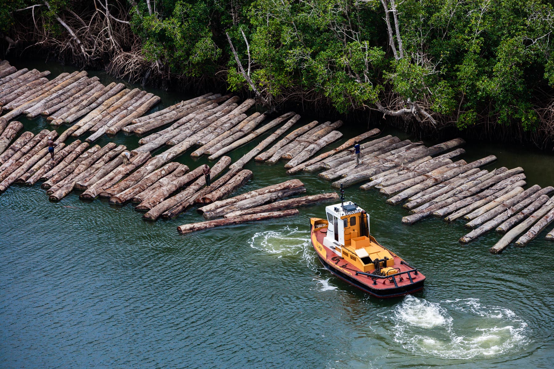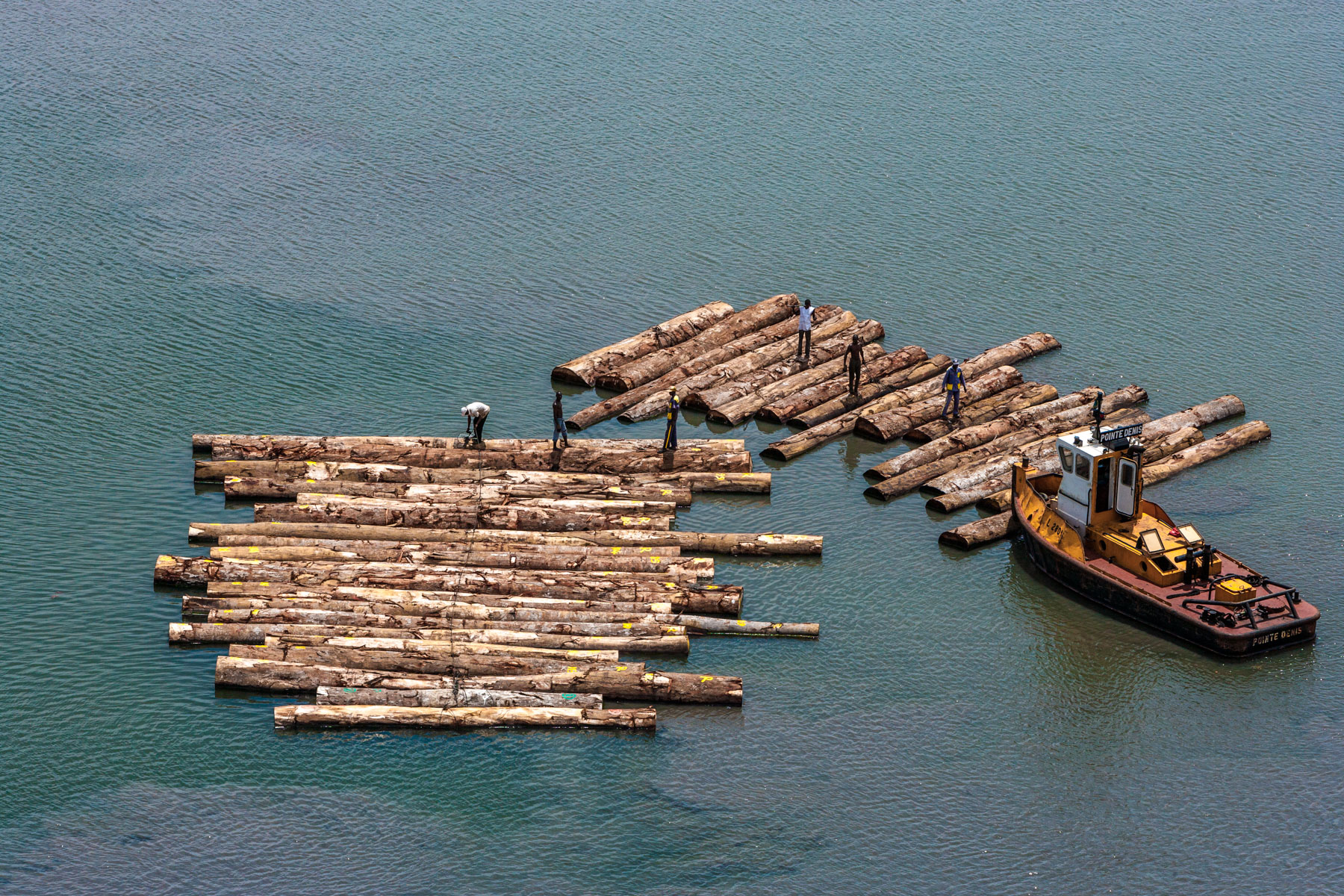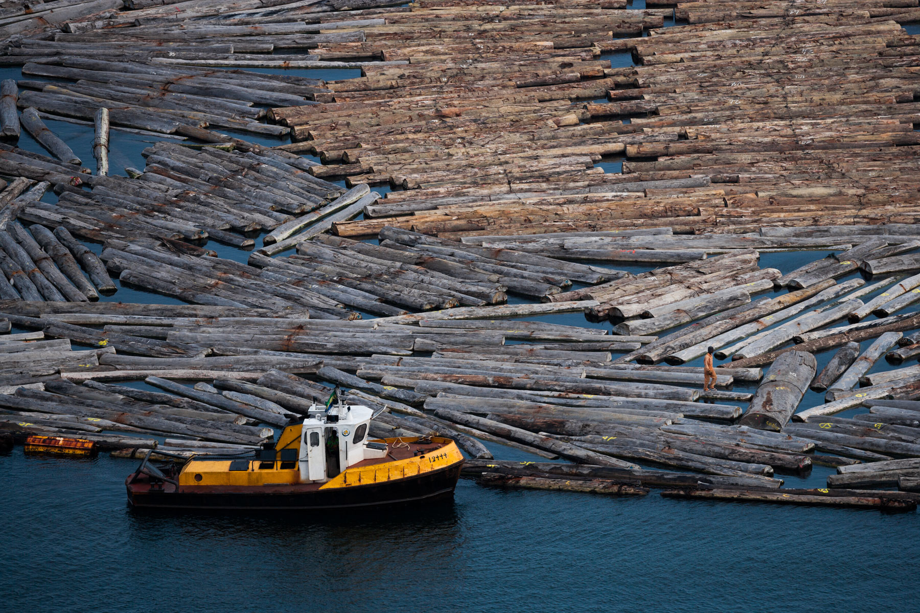 Transport du bois au large du port à bois d'Owendo, banlieue de Libreville, province de l’Estuaire (0°17'50.42"N -9°30'50.91"E)