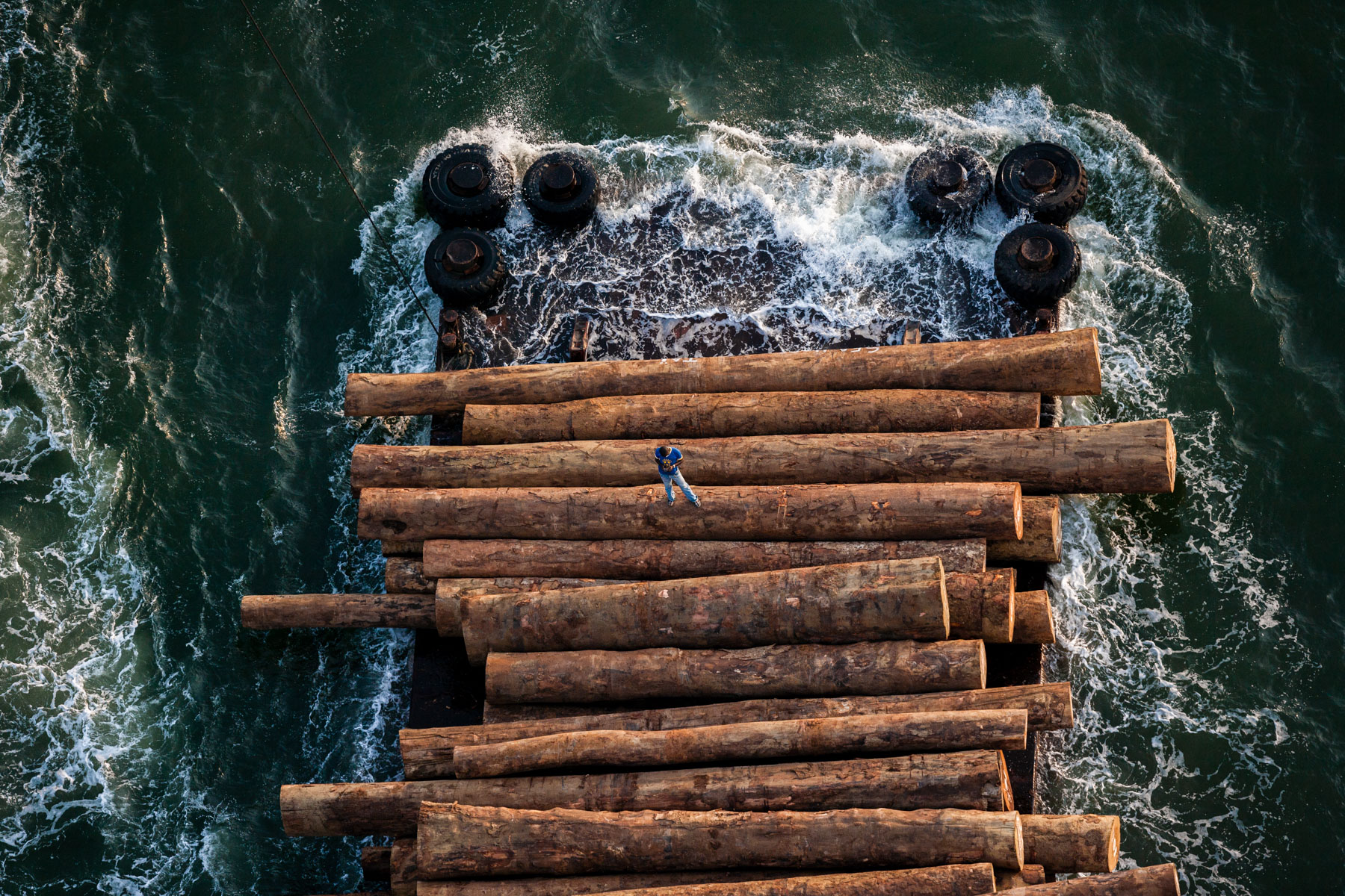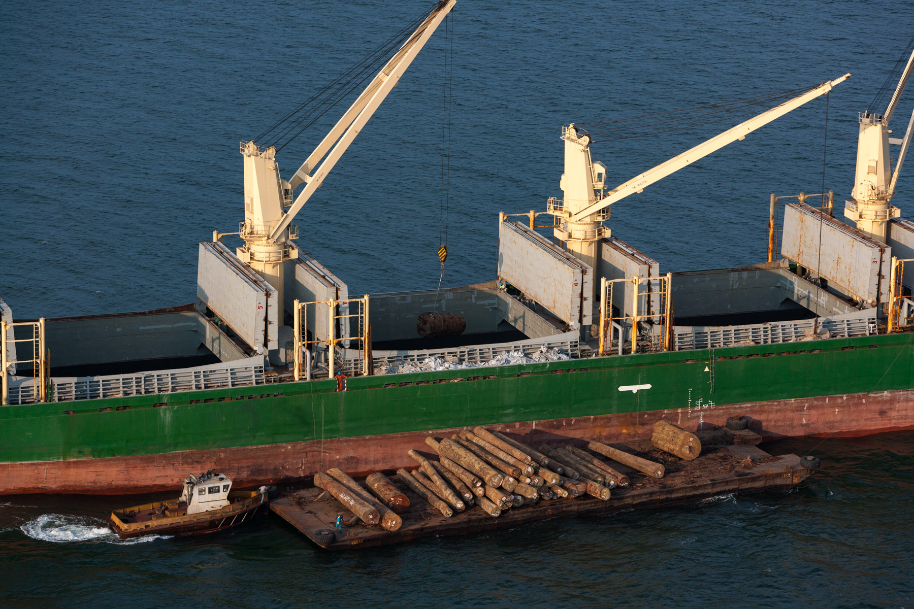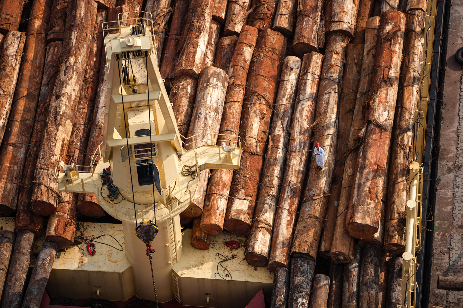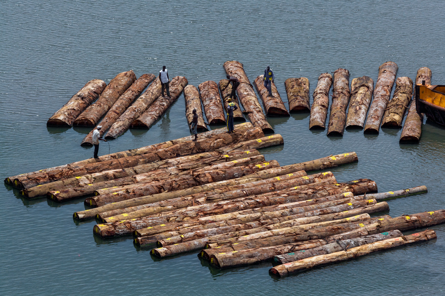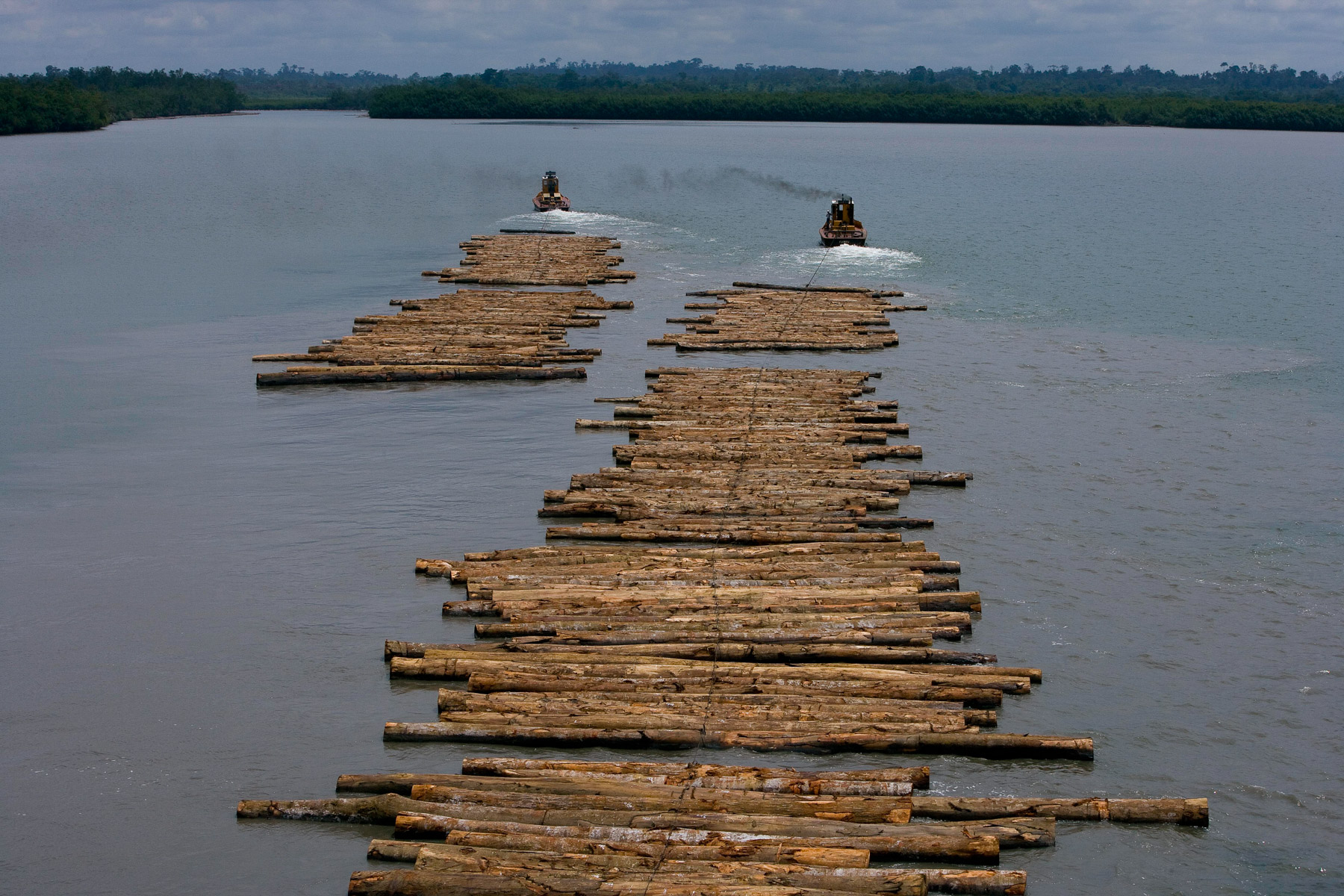 Transport du bois au large du port à bois d'Owendo, banlieue de Libreville, province de l’Estuaire (0°17'50.42"N -9°30'50.91"E)