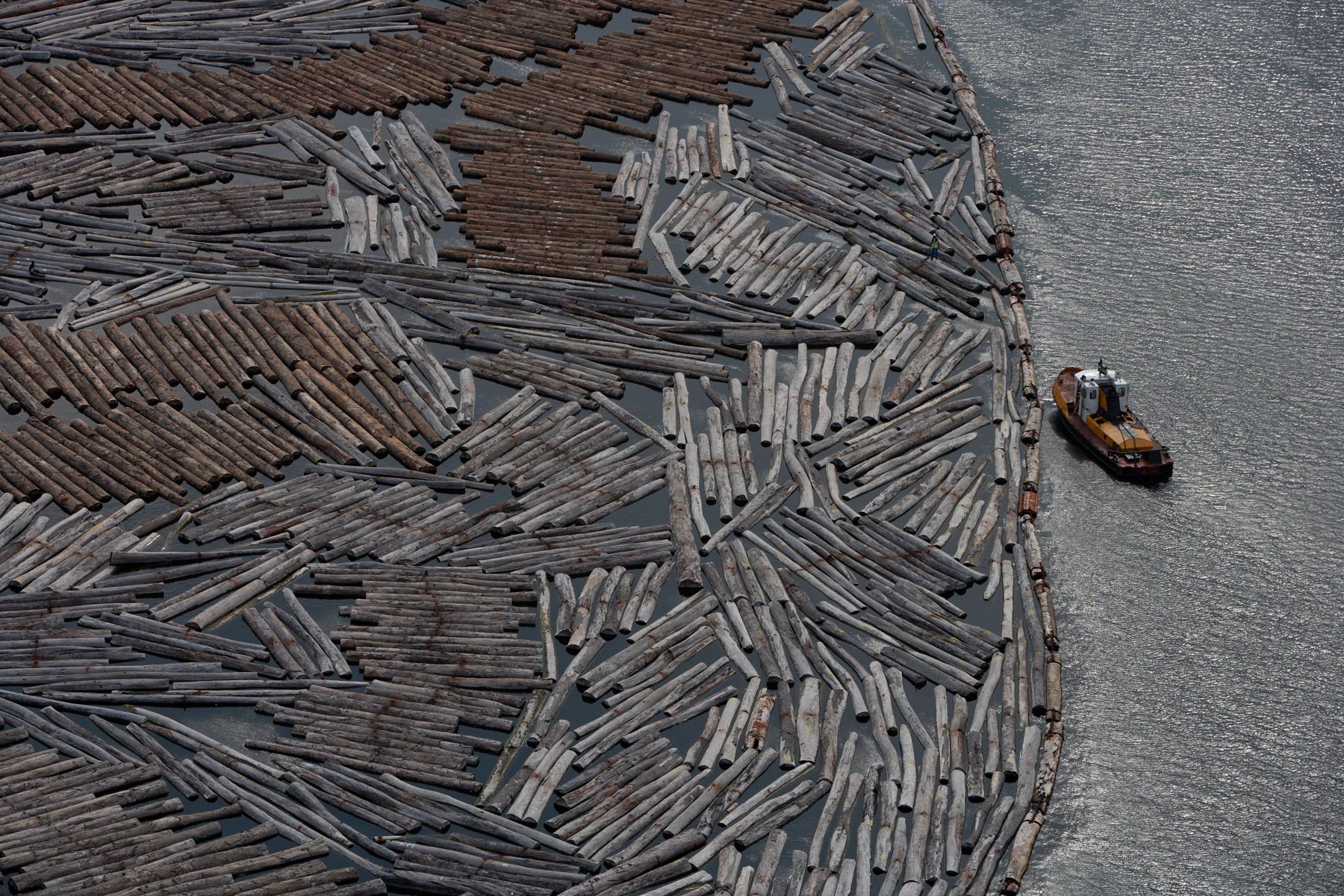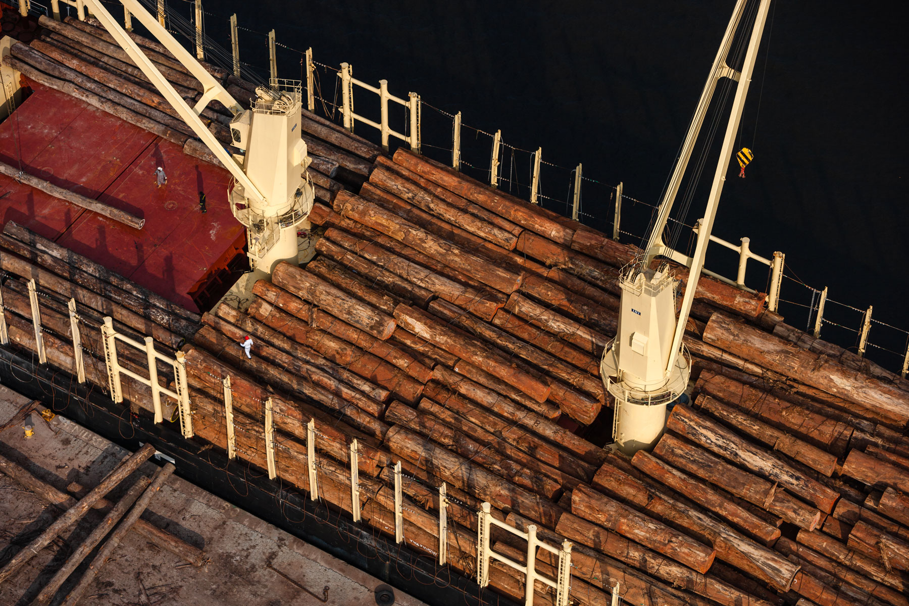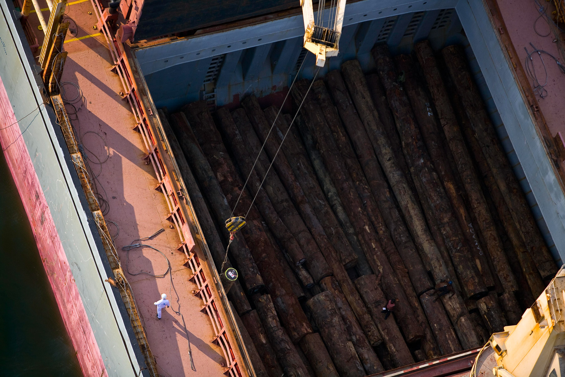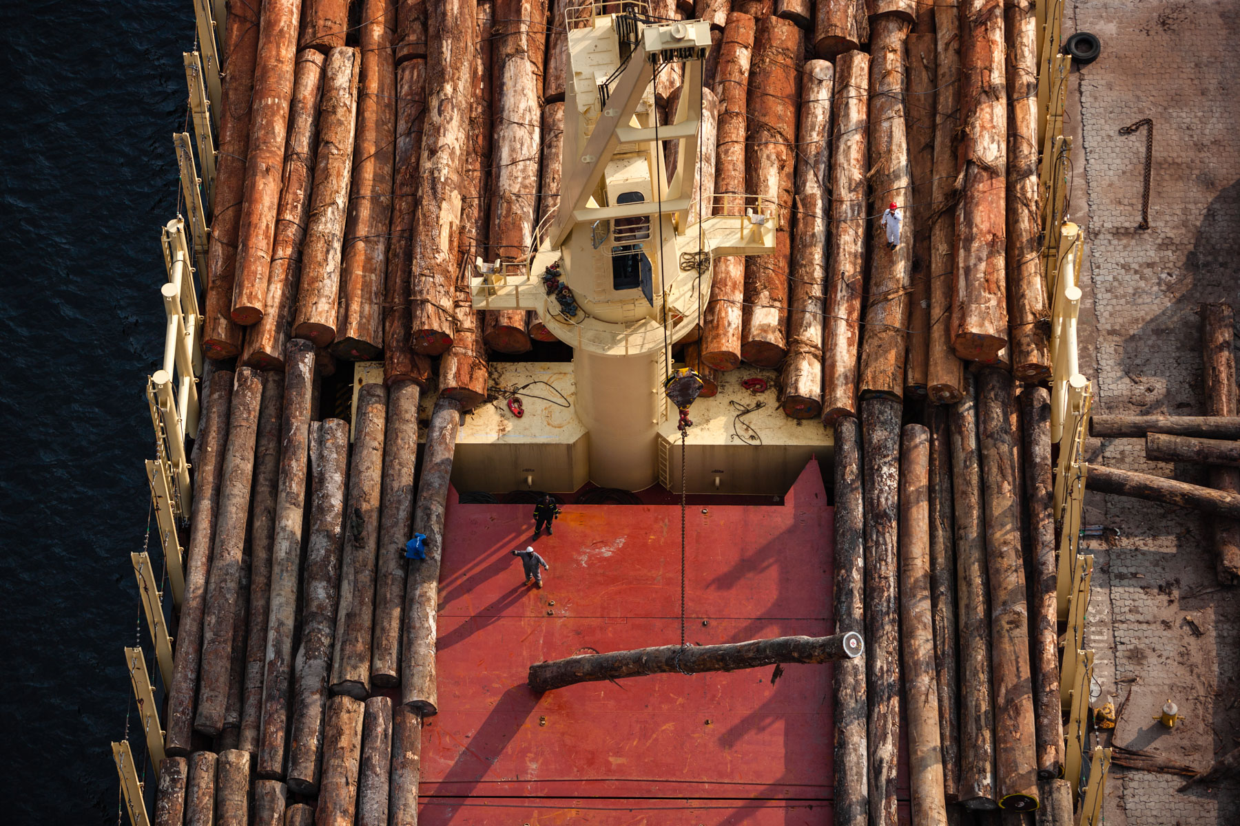 Transport du bois au large du port à bois d'Owendo, banlieue de Libreville, province de l’Estuaire (0°17'50.42"N -9°30'50.91"E)