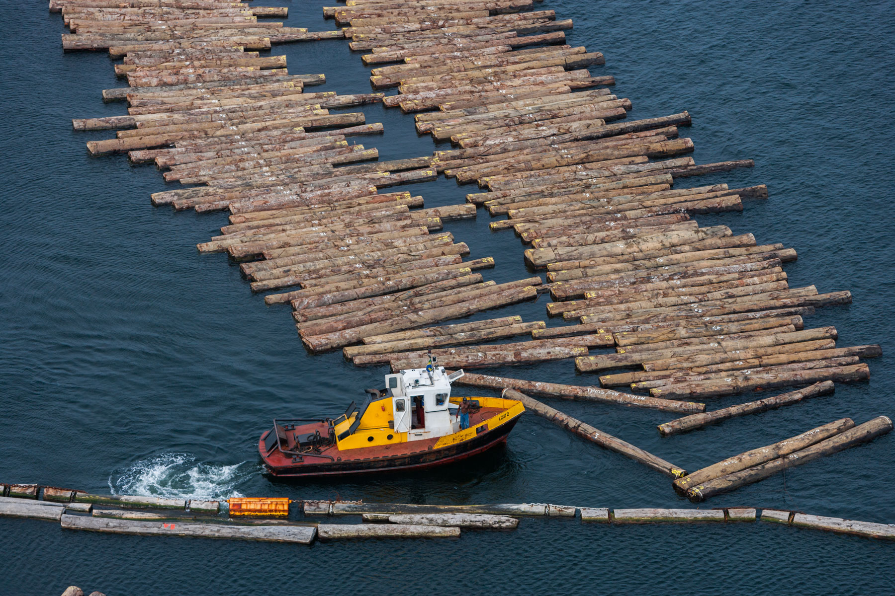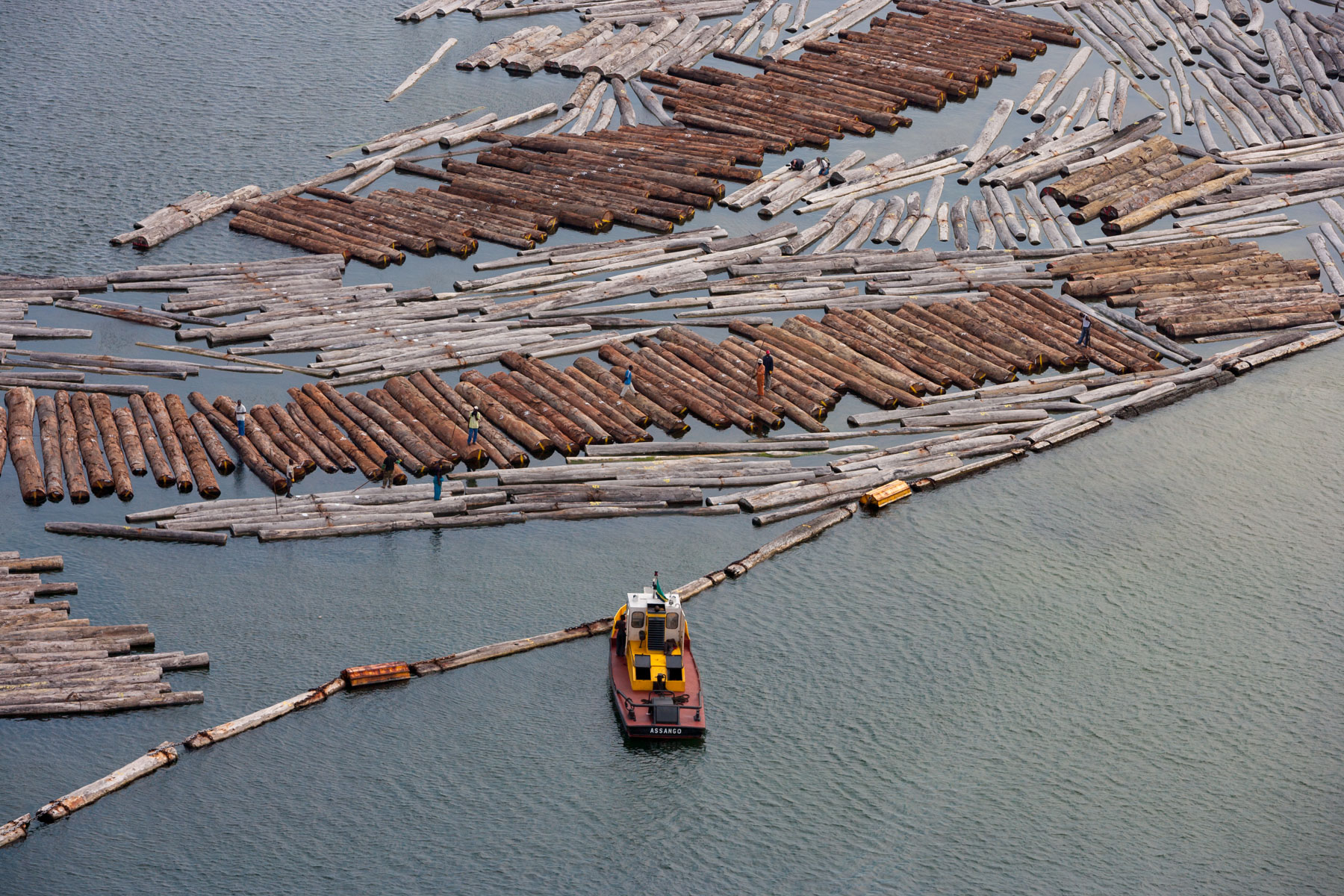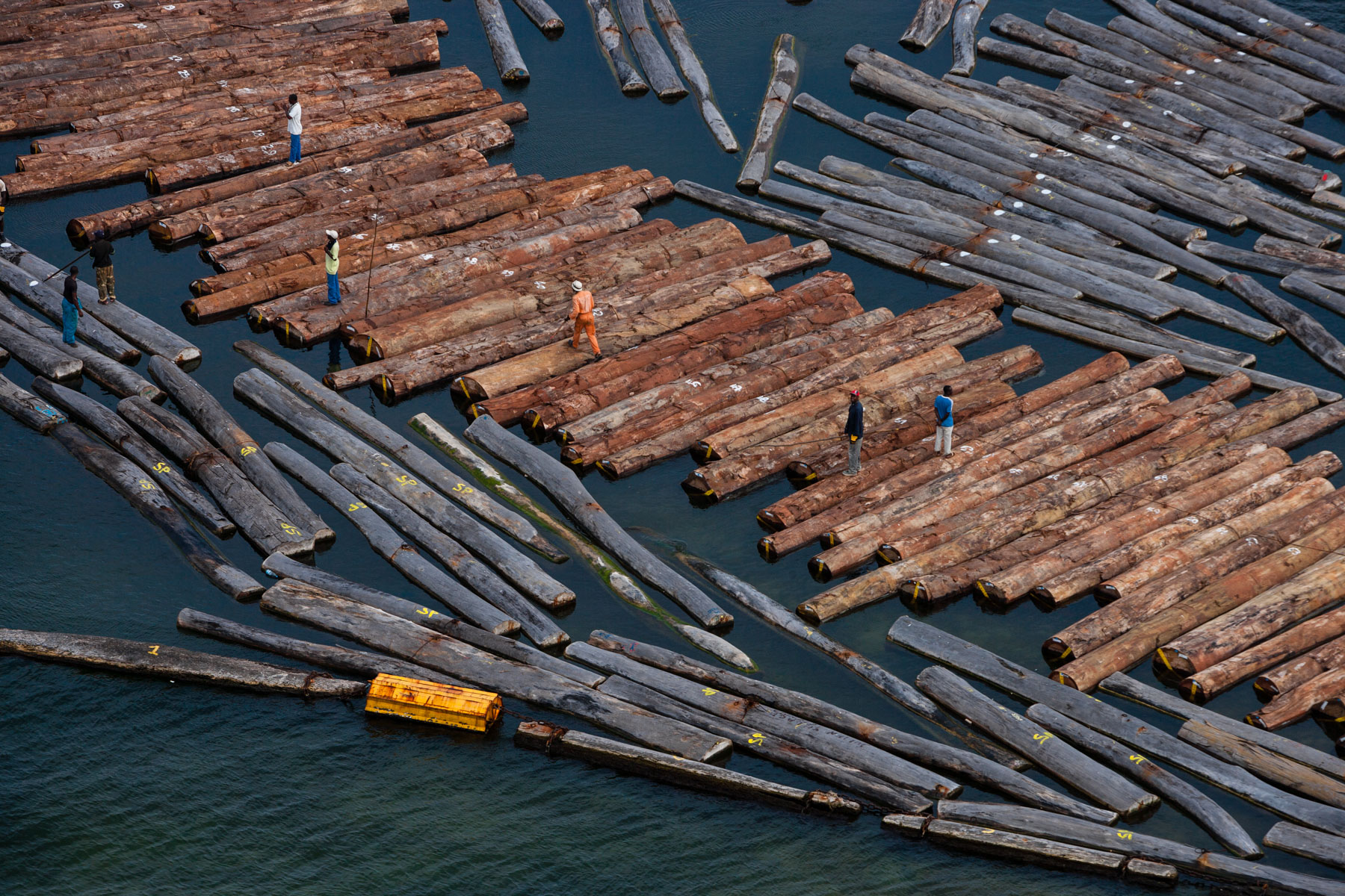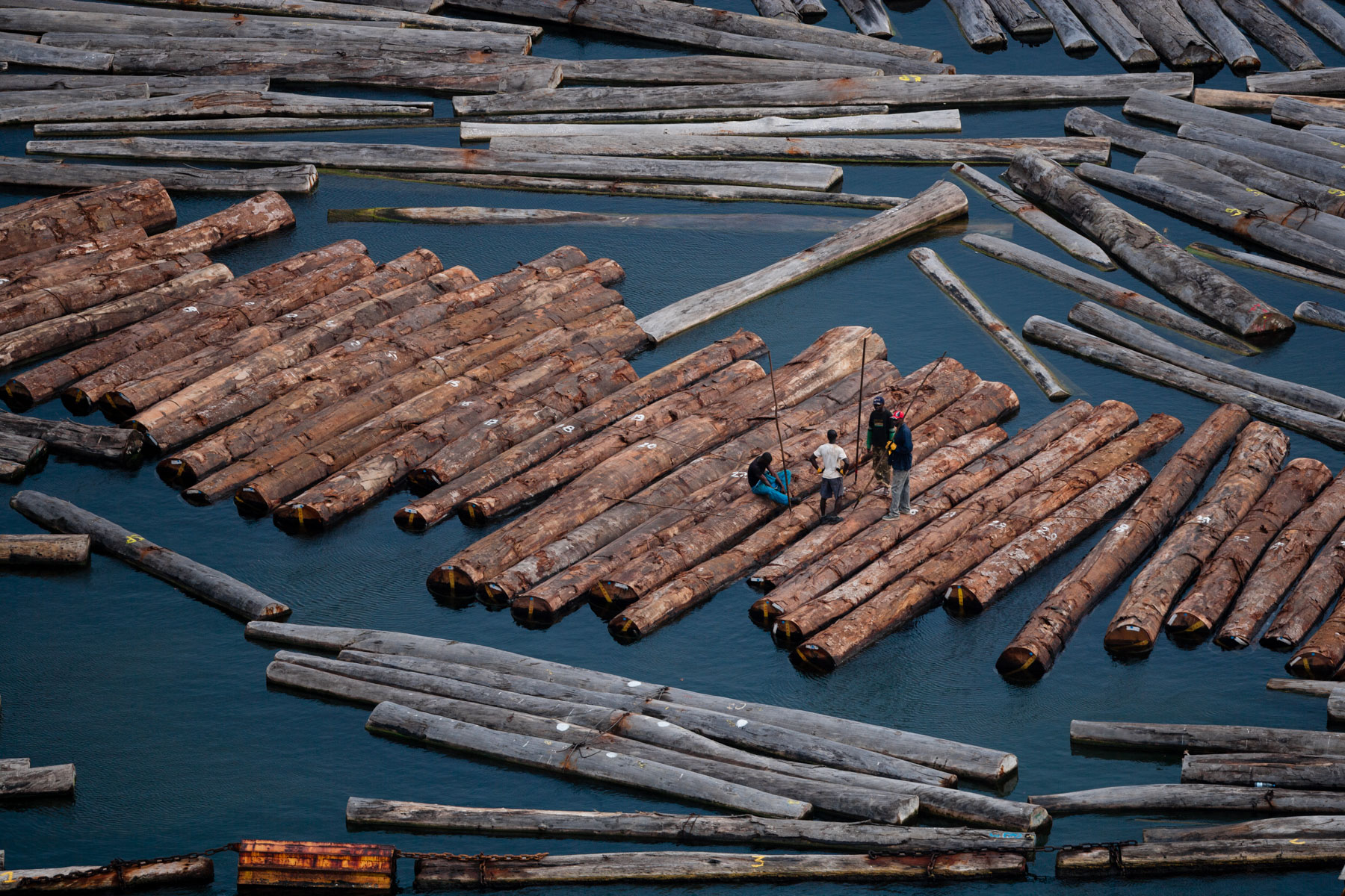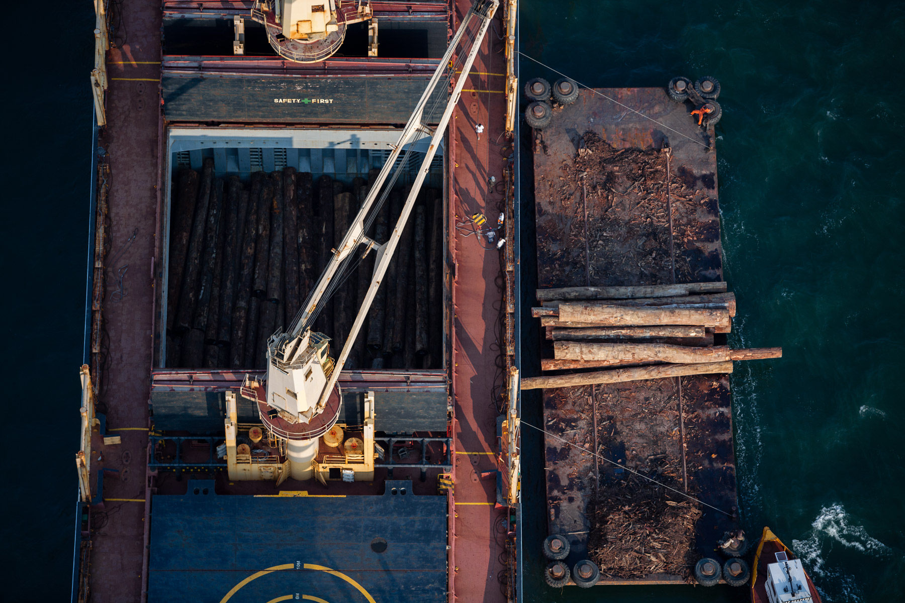 Transport du bois au large du port à bois d'Owendo, banlieue de Libreville, province de l’Estuaire (0°17'50.42"N -9°30'50.91"E)