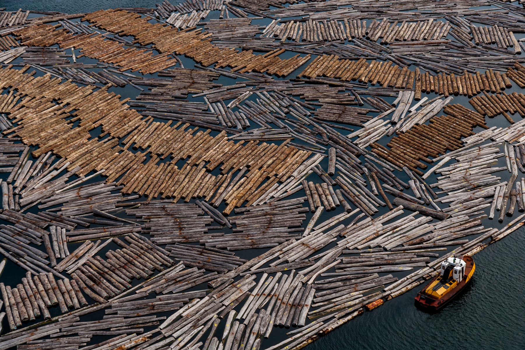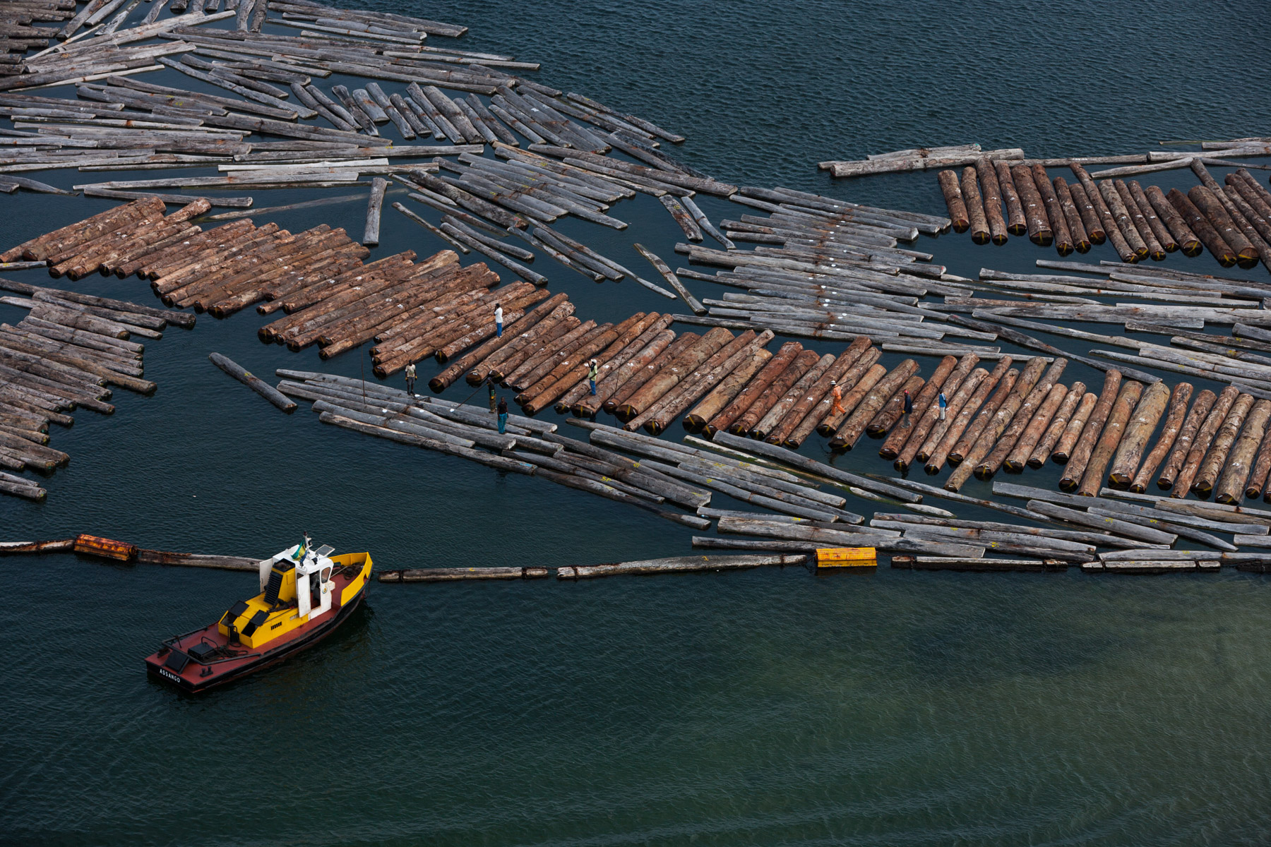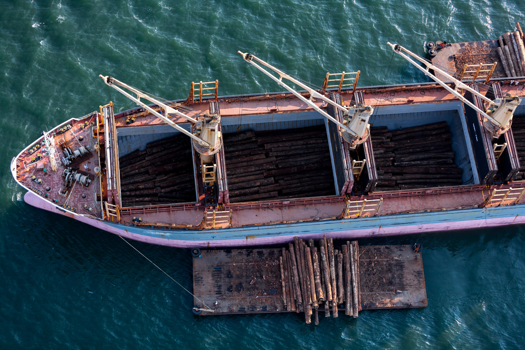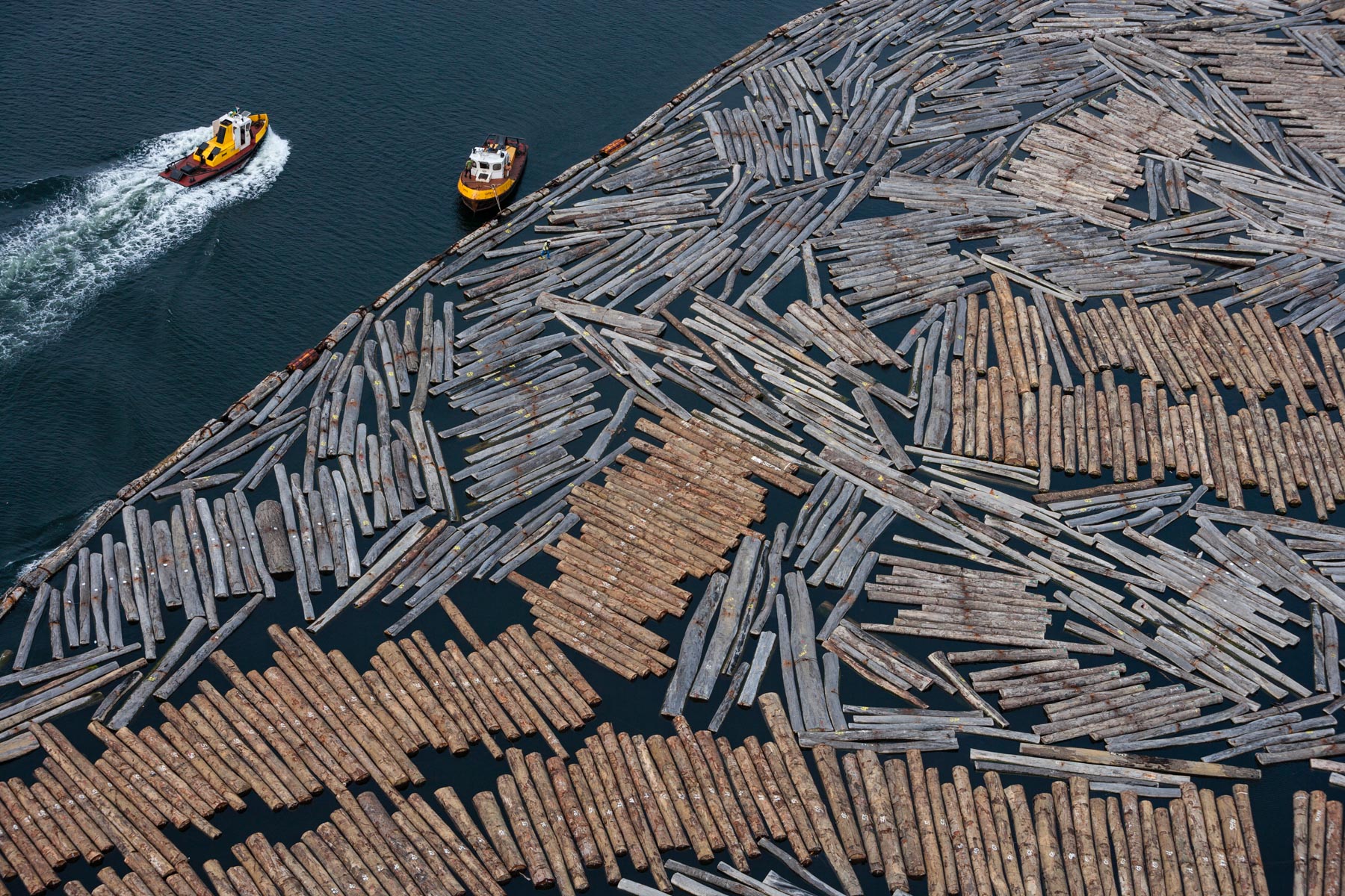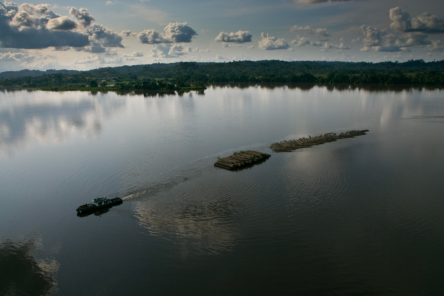 Transport du bois au large du port à bois d'Owendo, banlieue de Libreville, province de l’Estuaire (0°17'50.42"N -9°30'50.91"E)