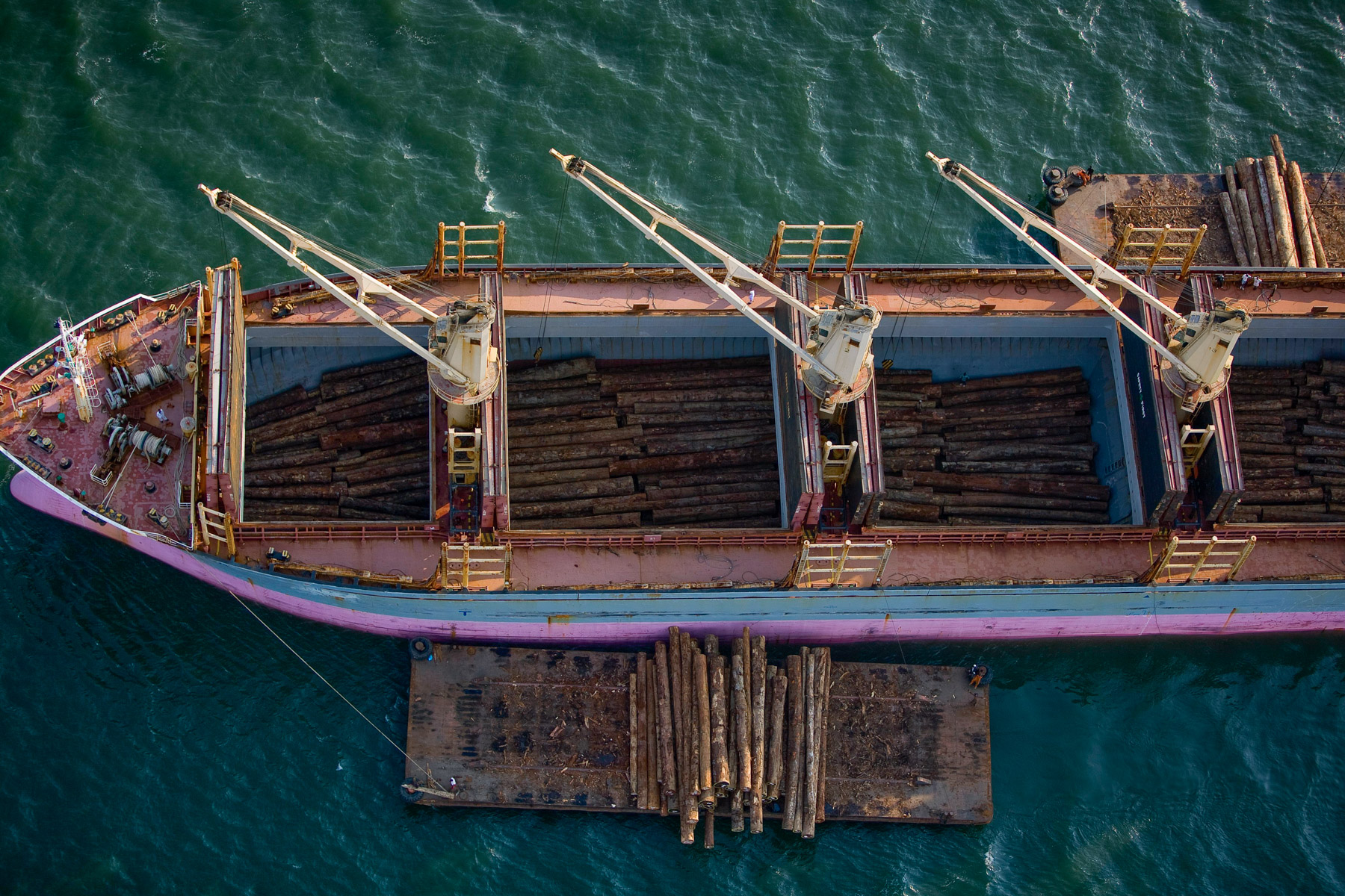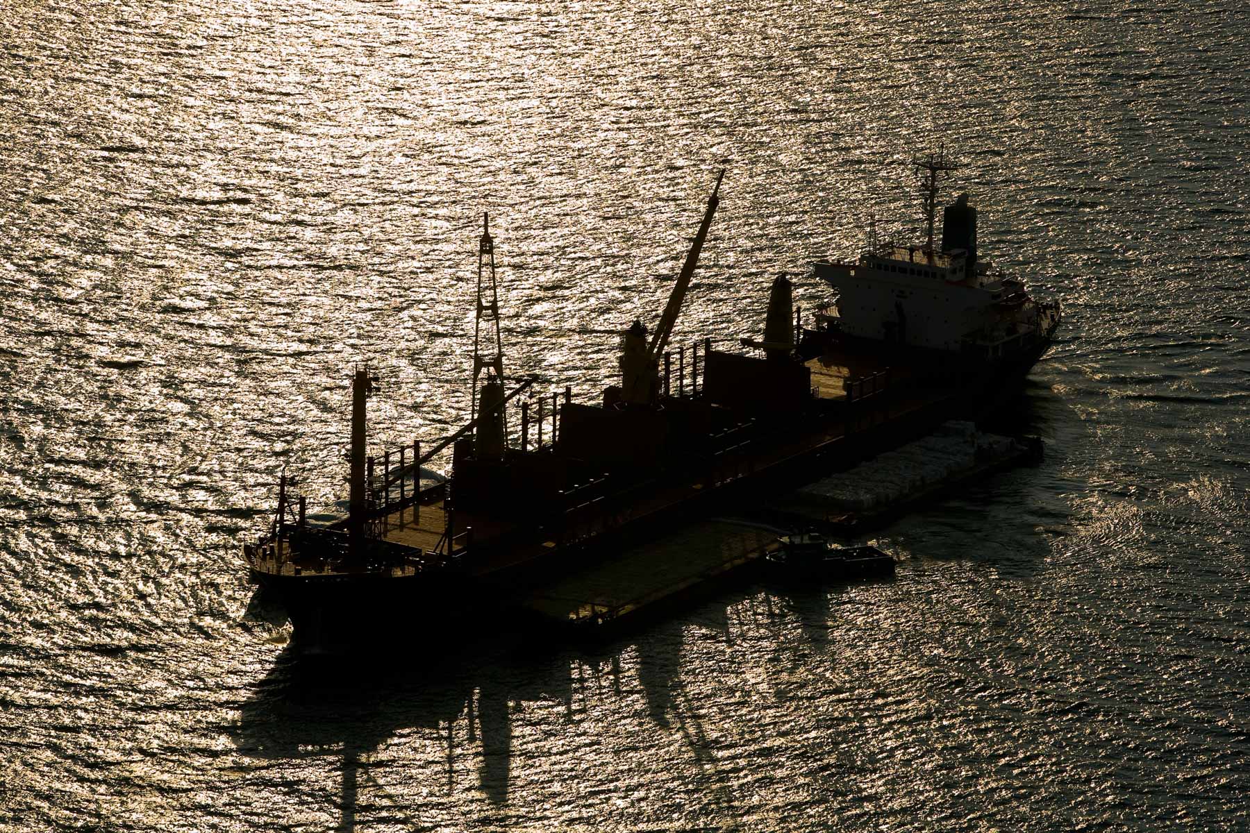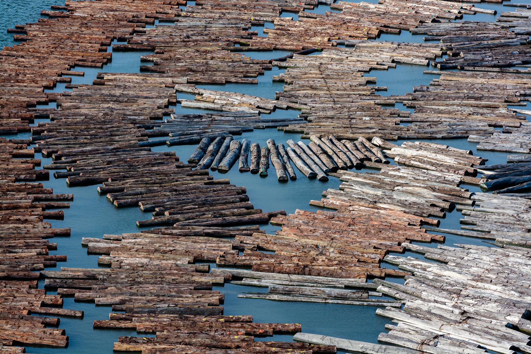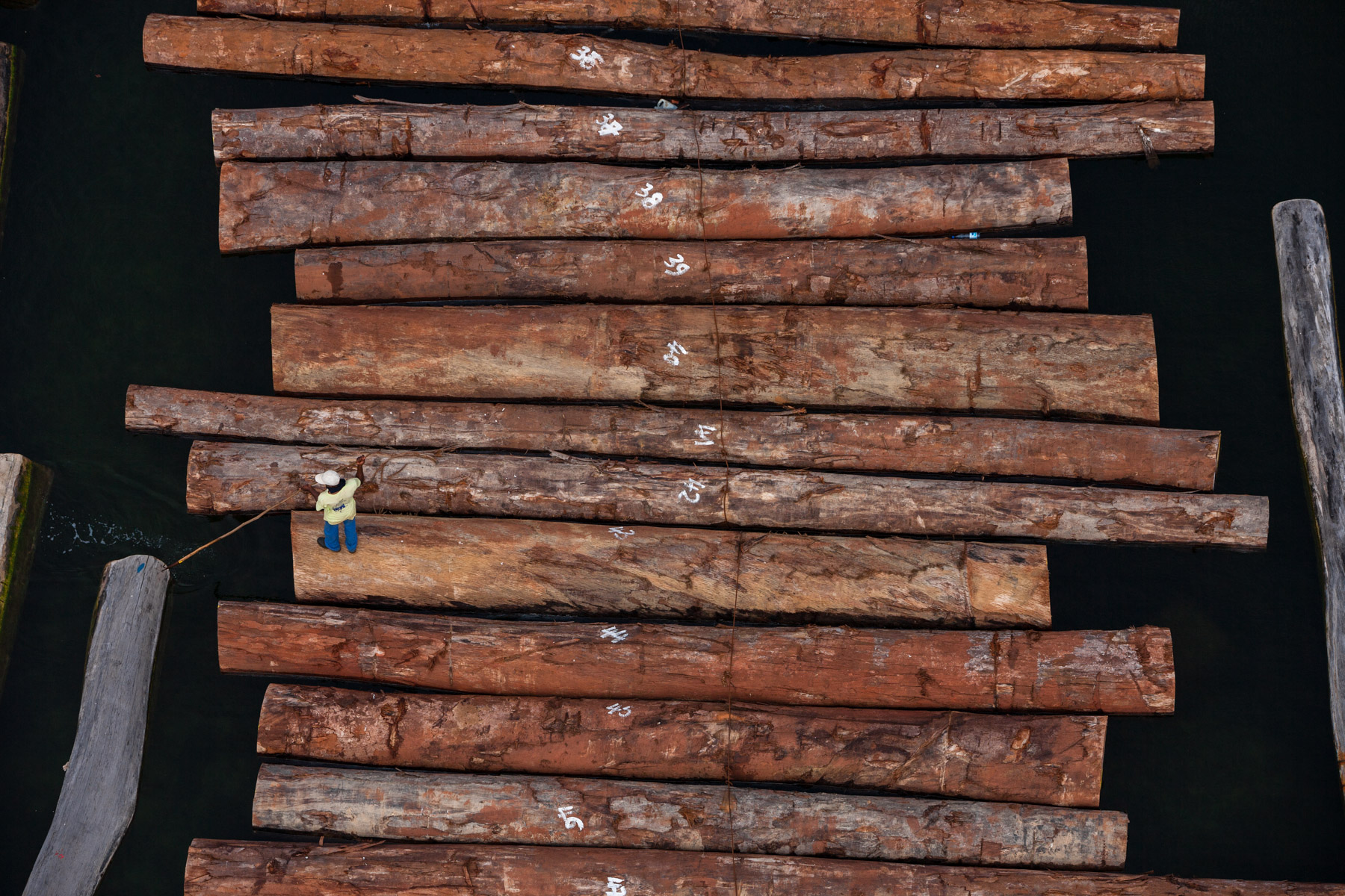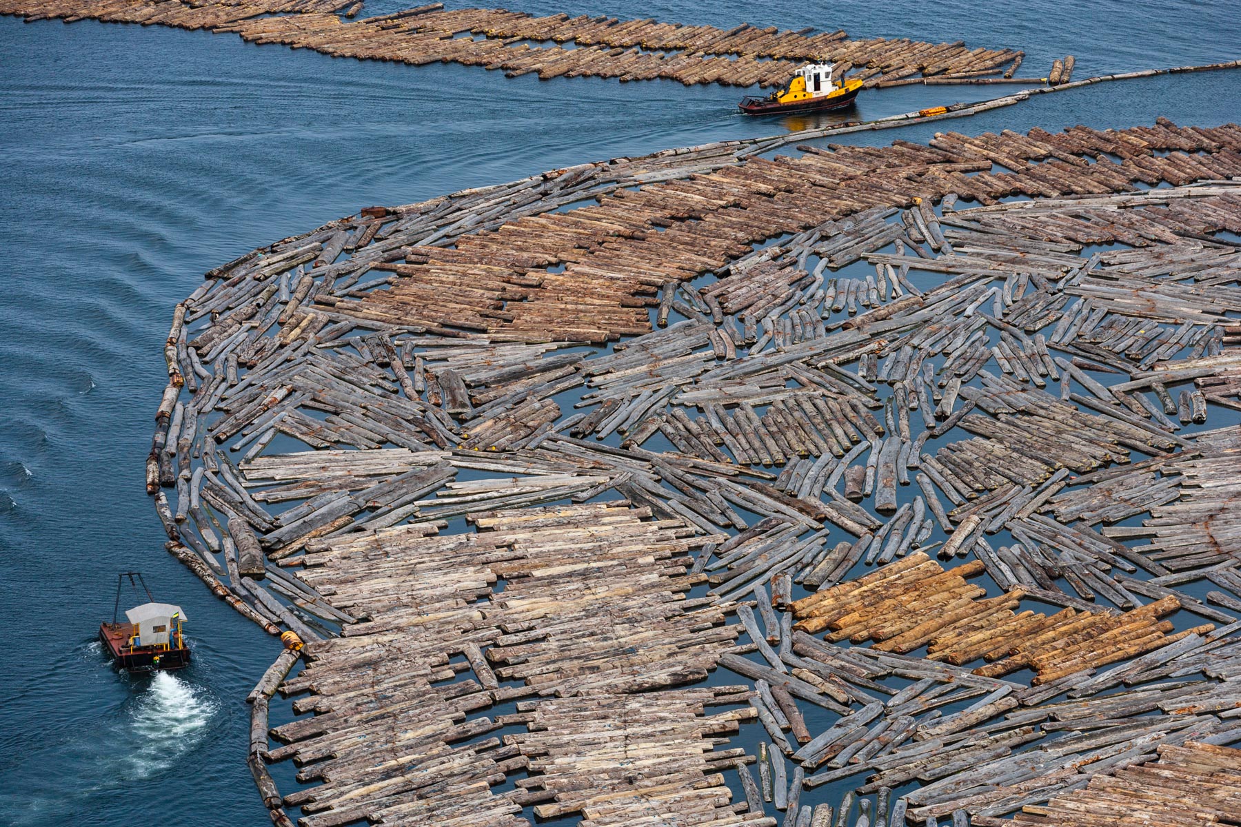 Transport du bois au large du port à bois d'Owendo, banlieue de Libreville, province de l’Estuaire (0°17'50.42"N -9°30'50.91"E)
