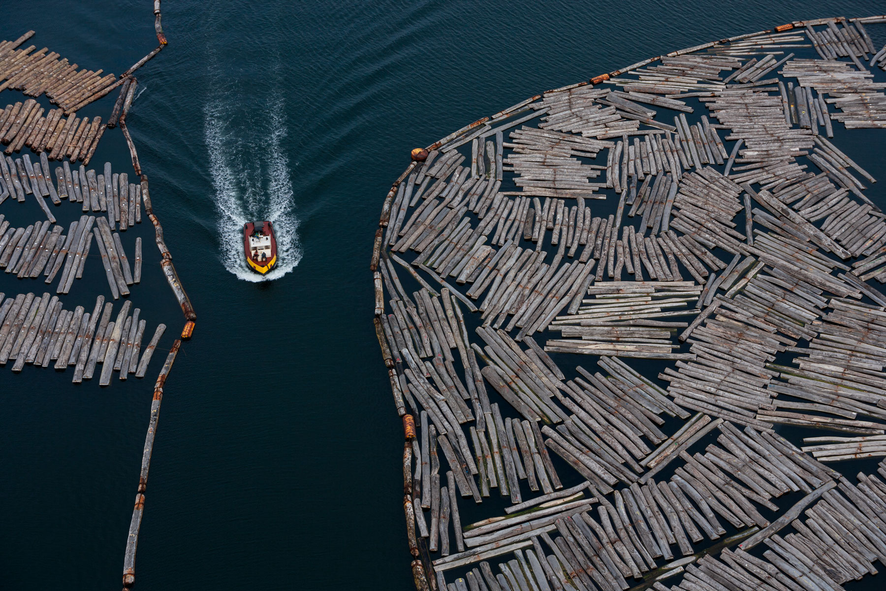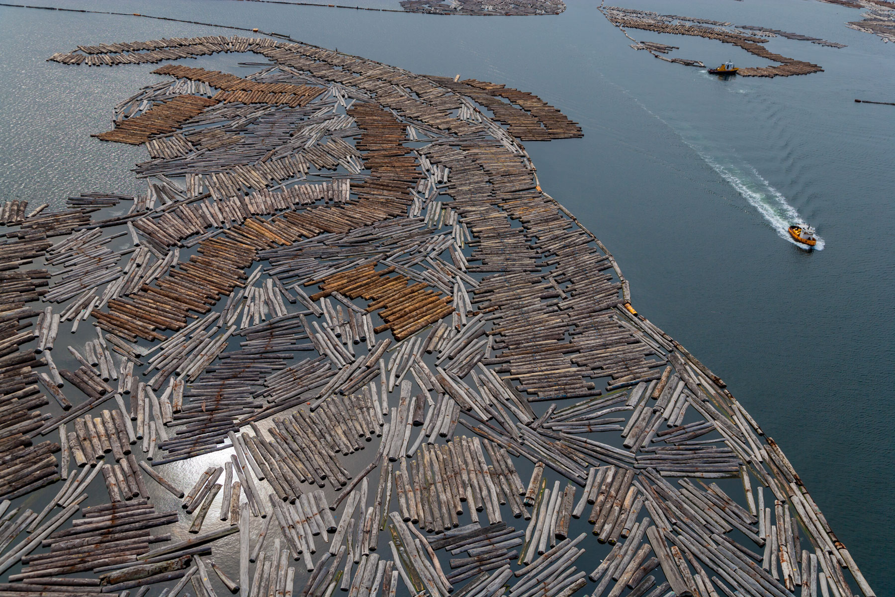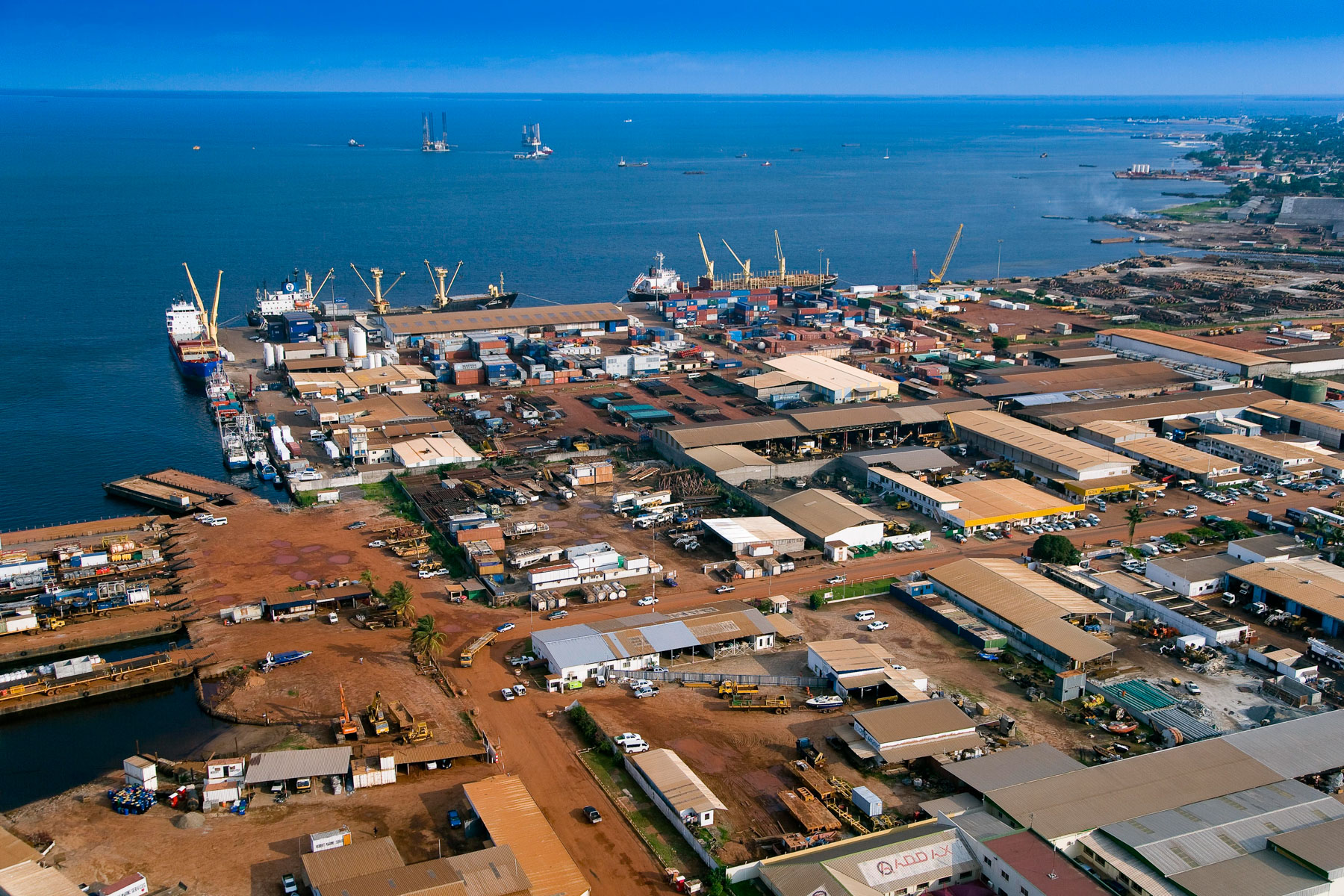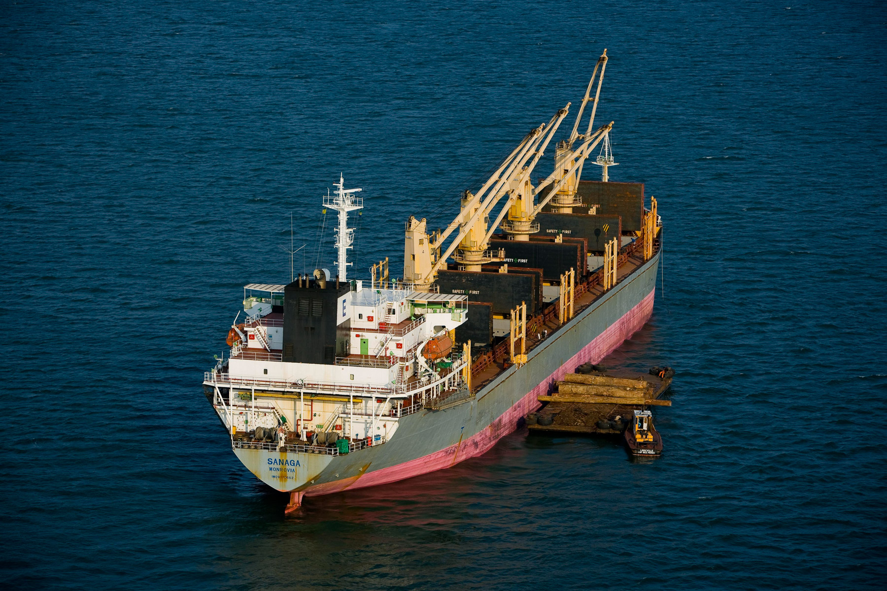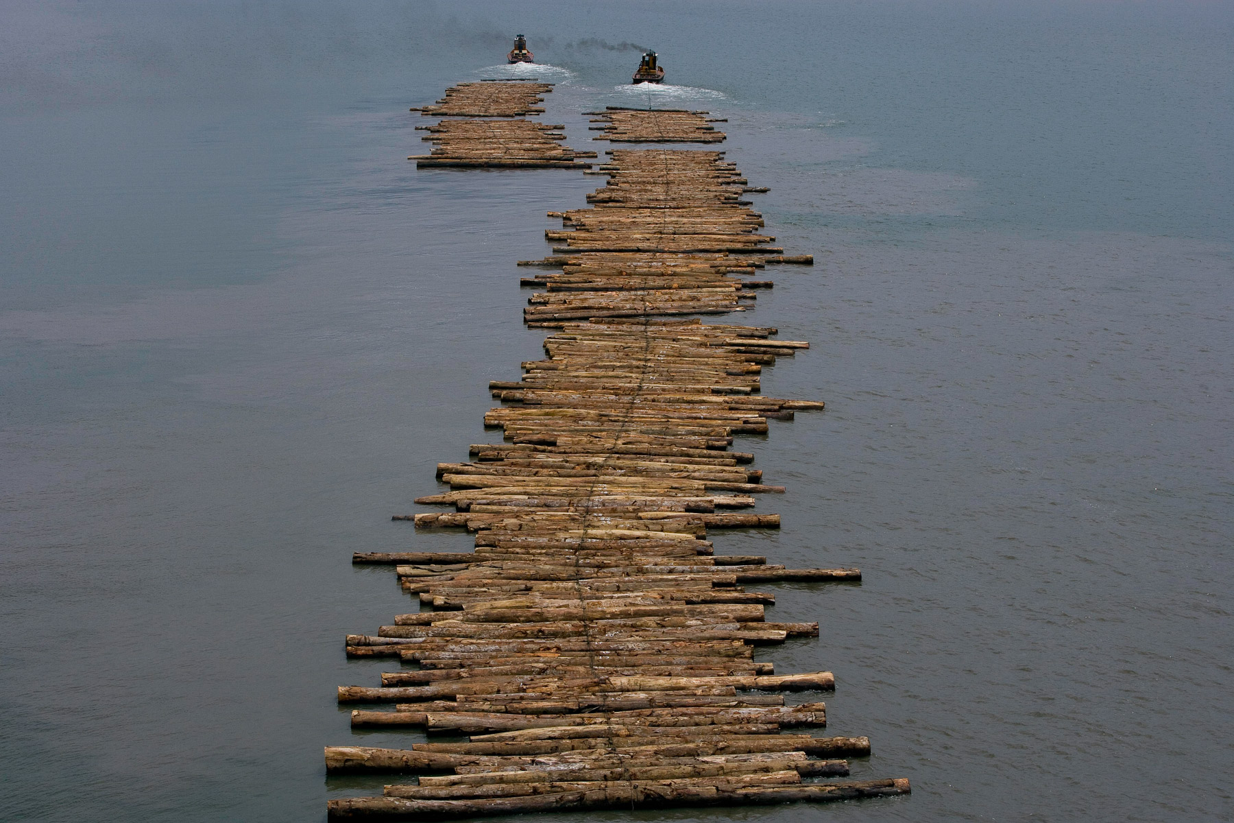 Transport du bois au large du port à bois d'Owendo, banlieue de Libreville, province de l’Estuaire (0°17'50.42"N -9°30'50.91"E)