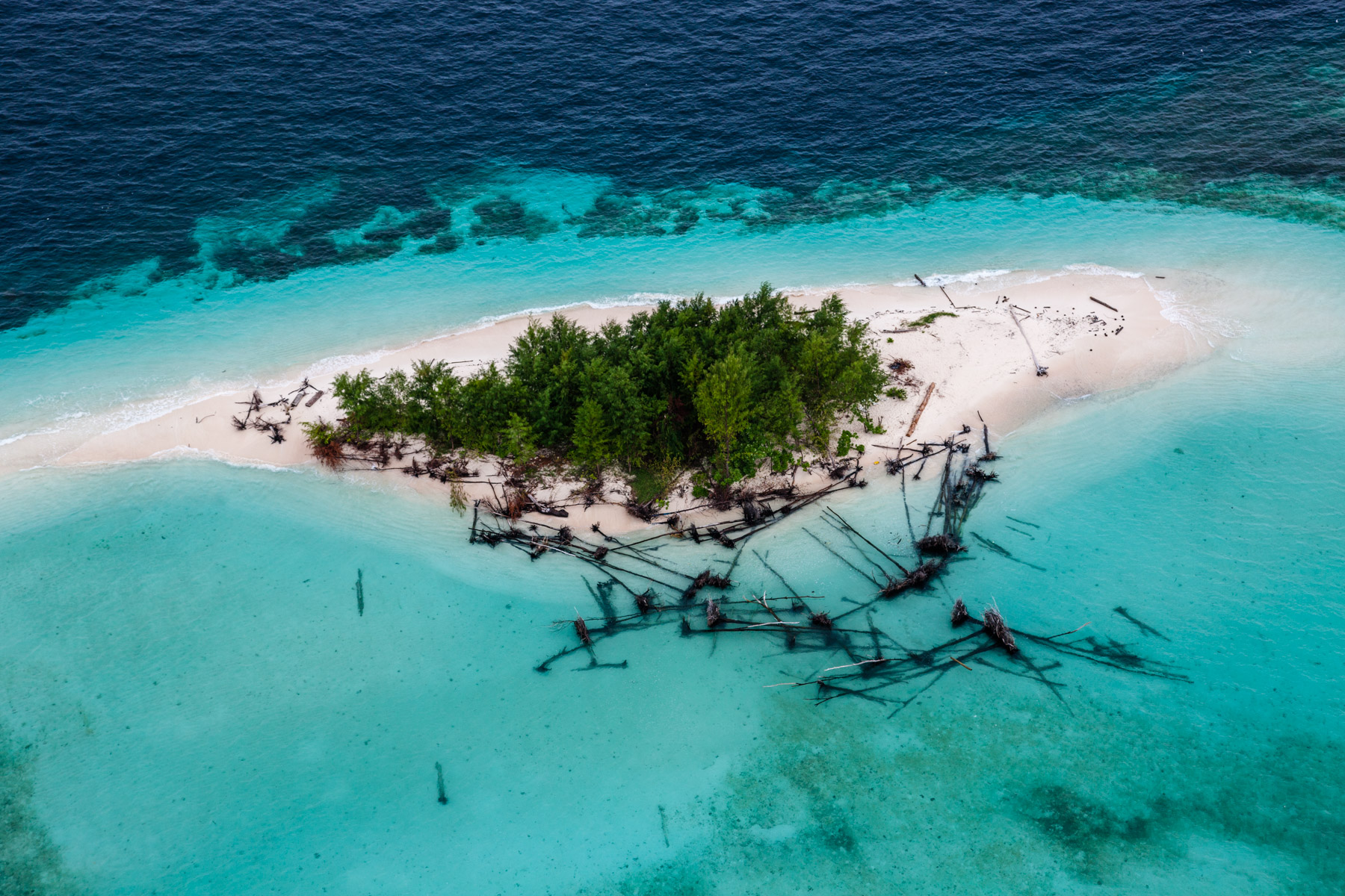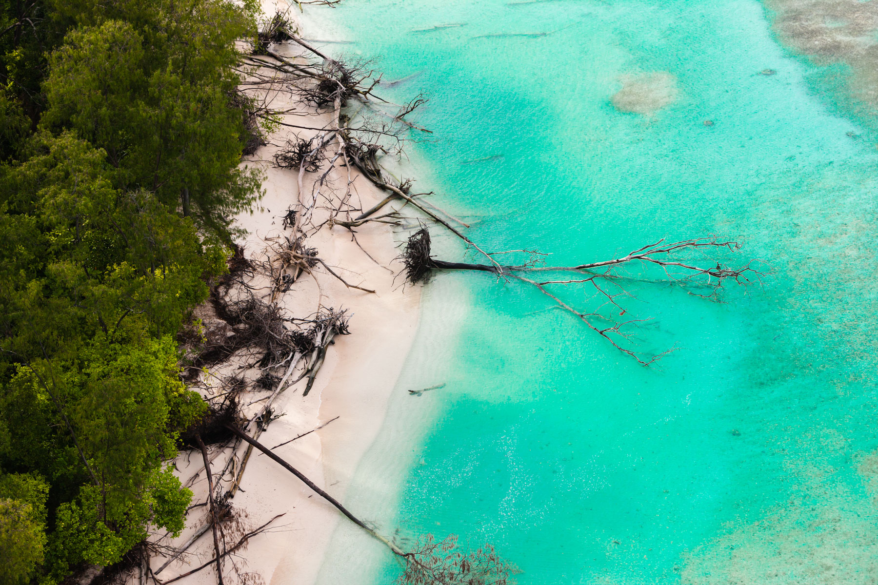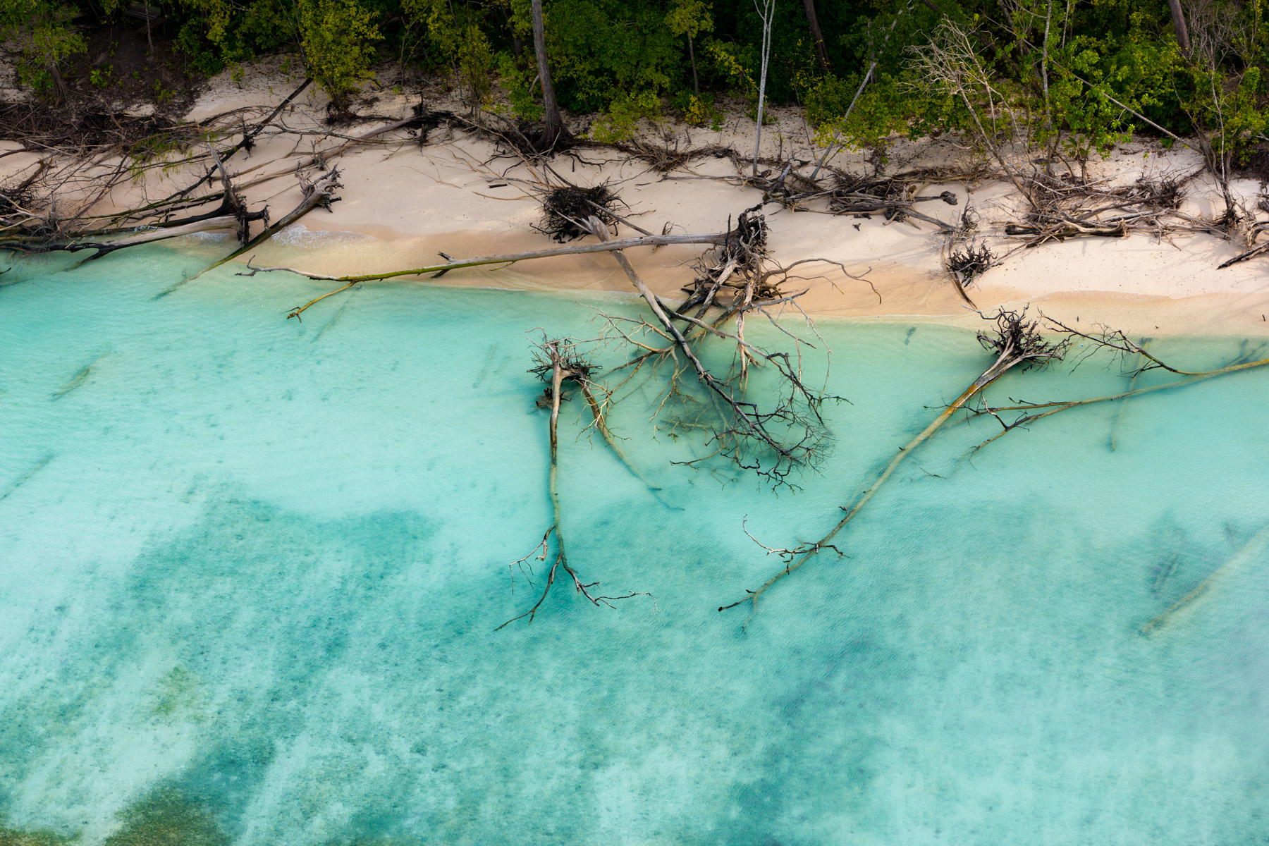 Arbres déracinés près de l'île Pulau Tapok (nord de l'île Pulau Batanta), Archipel des Raja-Ampat, Papouasie Occidentale, Indonésie