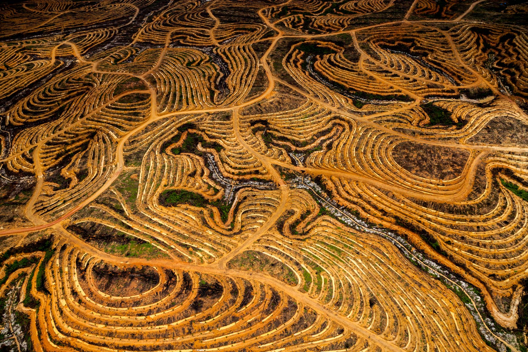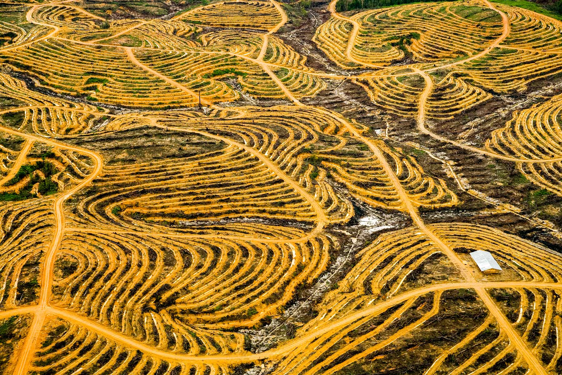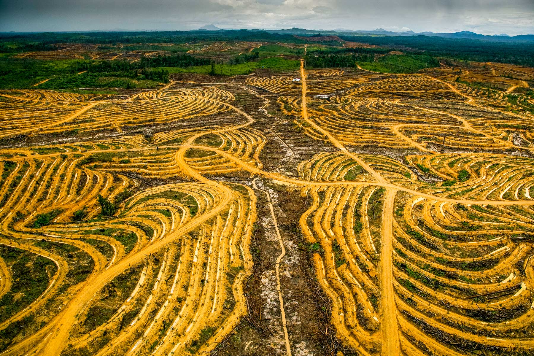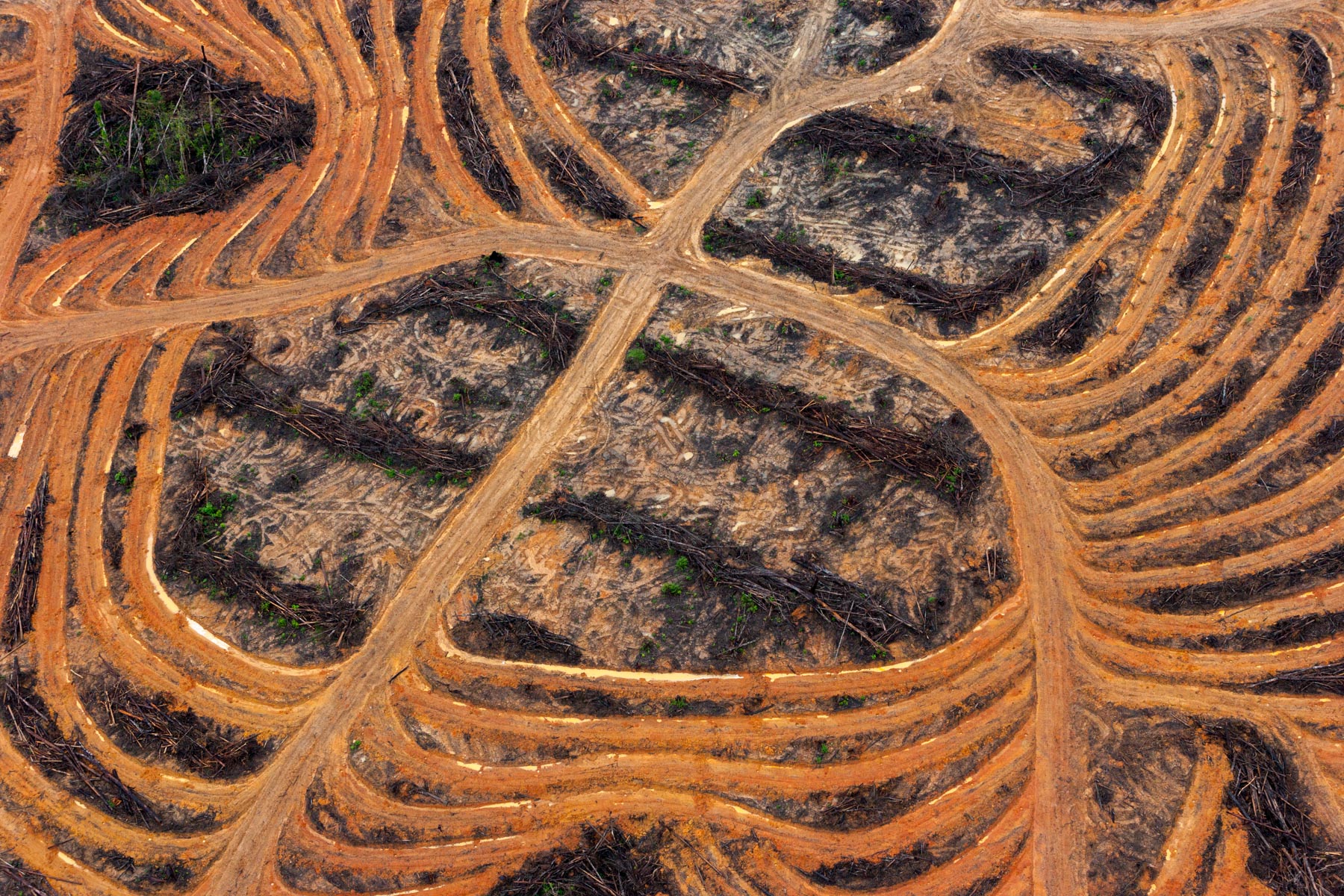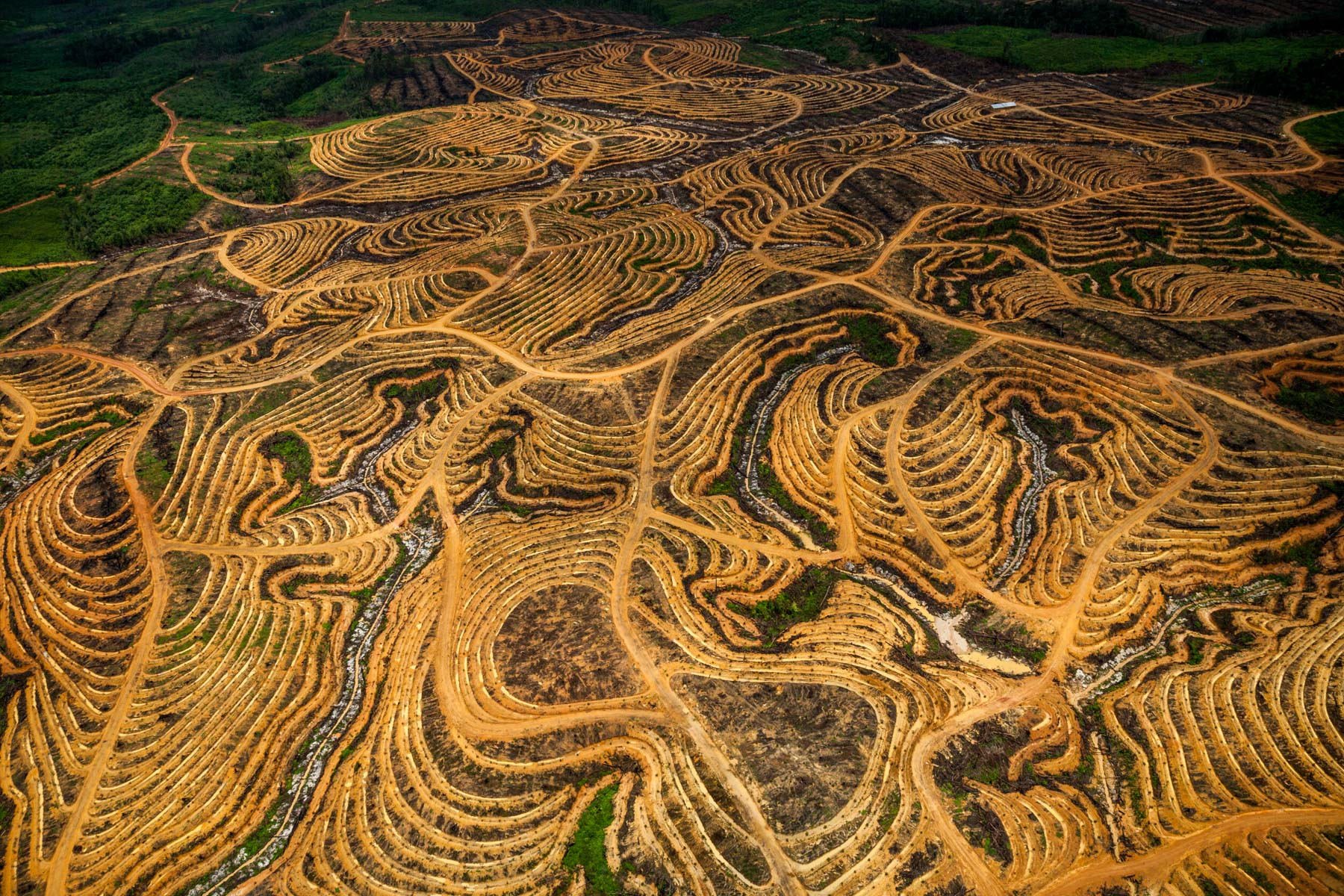 Nouvelle plantation de palmiers à huile près de Pundu, Bornéo, Indonésie (1°59’ S – 113°06’ E). Sur l’île de Bornéo, les palmiers à huile remplacent les forêts tropicales vierges à un rythme croissant, et ces plantations entraînent la perte de 80 % de la flore d’origine et de 80 à 90 % des espèces animales, comme l’orang-outan. La demande mondiale pour l’huile de palme est la principale cause de déforestation dans certaines parties de l’Asie. Au début de l’année 2010, il y avait 7,9 millions d’hectares plantés contre 600 000 en 1985, ainsi que 1,9 million d’hectares en attente de plantation. L’archipel indonésien est devenu le premier producteur mondial d’huile de palme en 2008, devant la Malaisie. La demande mondiale pour cette matière première augmente, passant de 14,5 millions de tonnes en 1990 à 56 millions de tonnes en 2013 car elle entre dans la composition de beaucoup de produits alimentaires, mais aussi dans celle des détergents et des cosmétiques. De plus en plus utilisée pour la fabrication d’agrocarburants, cette huile alimentaire pourrait devenir trop chère pour les consommateurs pauvres des pays en voie de développement. Dans l’Union européenne, l’utilisation de la moitié de la production d’huile de colza pour produire des agrocarburants contraint les pays membres à importer davantage d’huile de palme et de soja pour la consommation humaine.